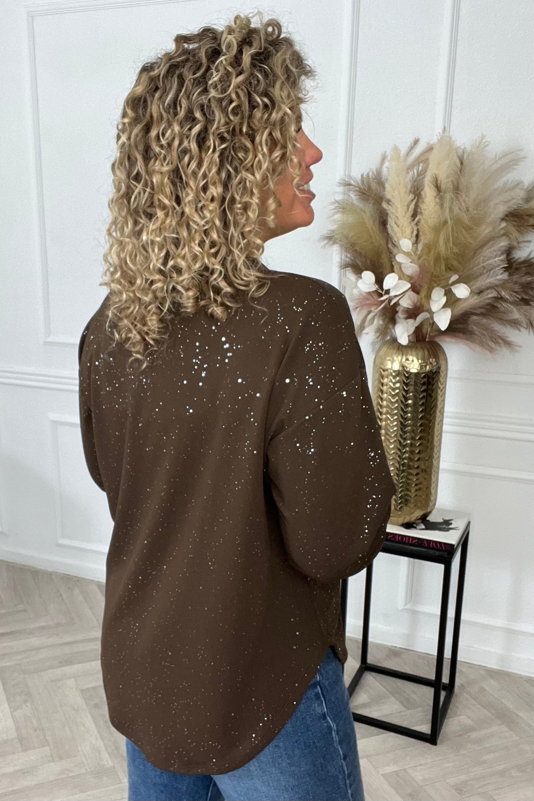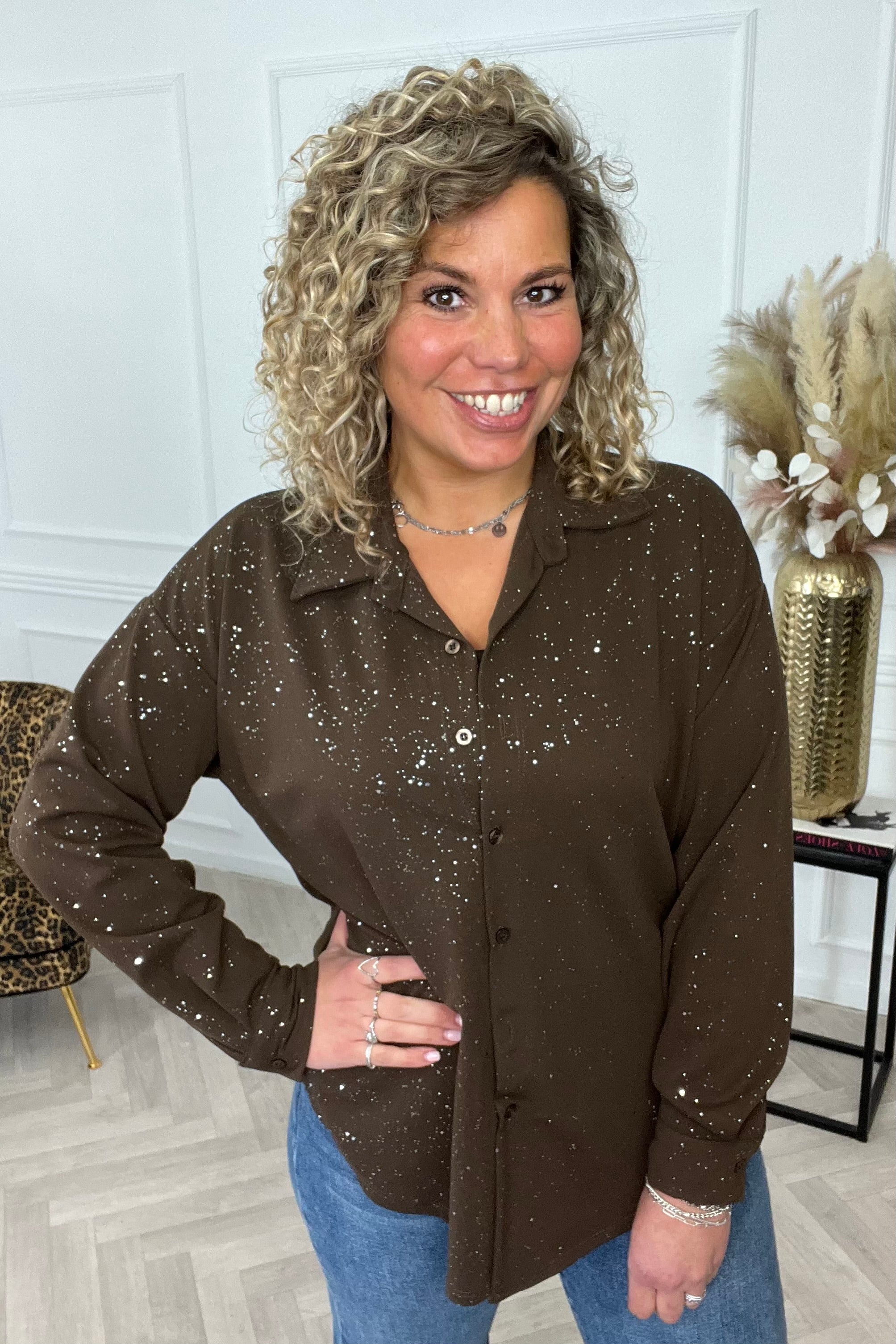 Je zou het stofje van de blouse kunnen herkennen van onze bestseller sparkle dresses! Maar nu hebben we er dus ook te gekke blousjes van! Shop de sparkle button blouse nu in brown!