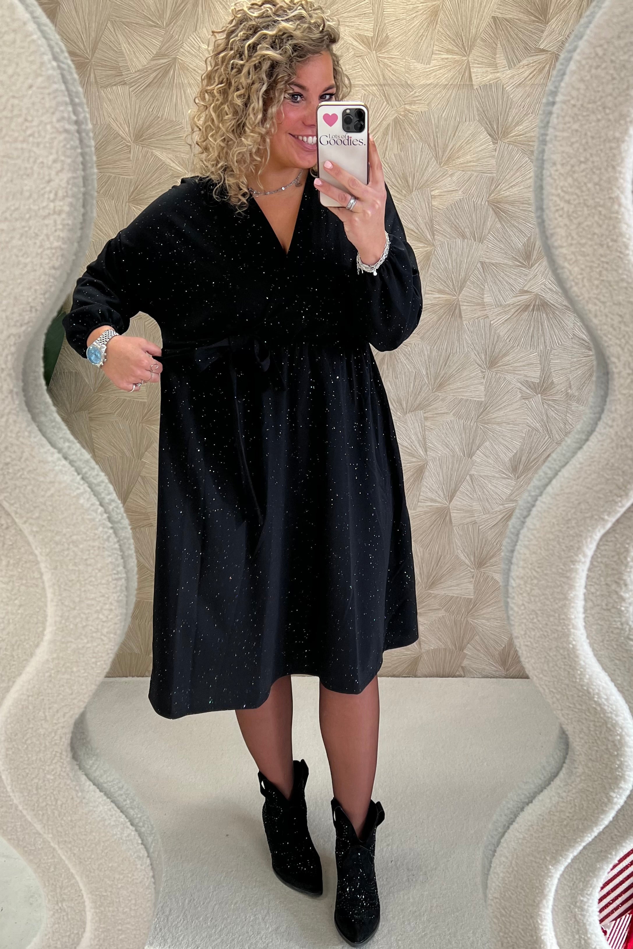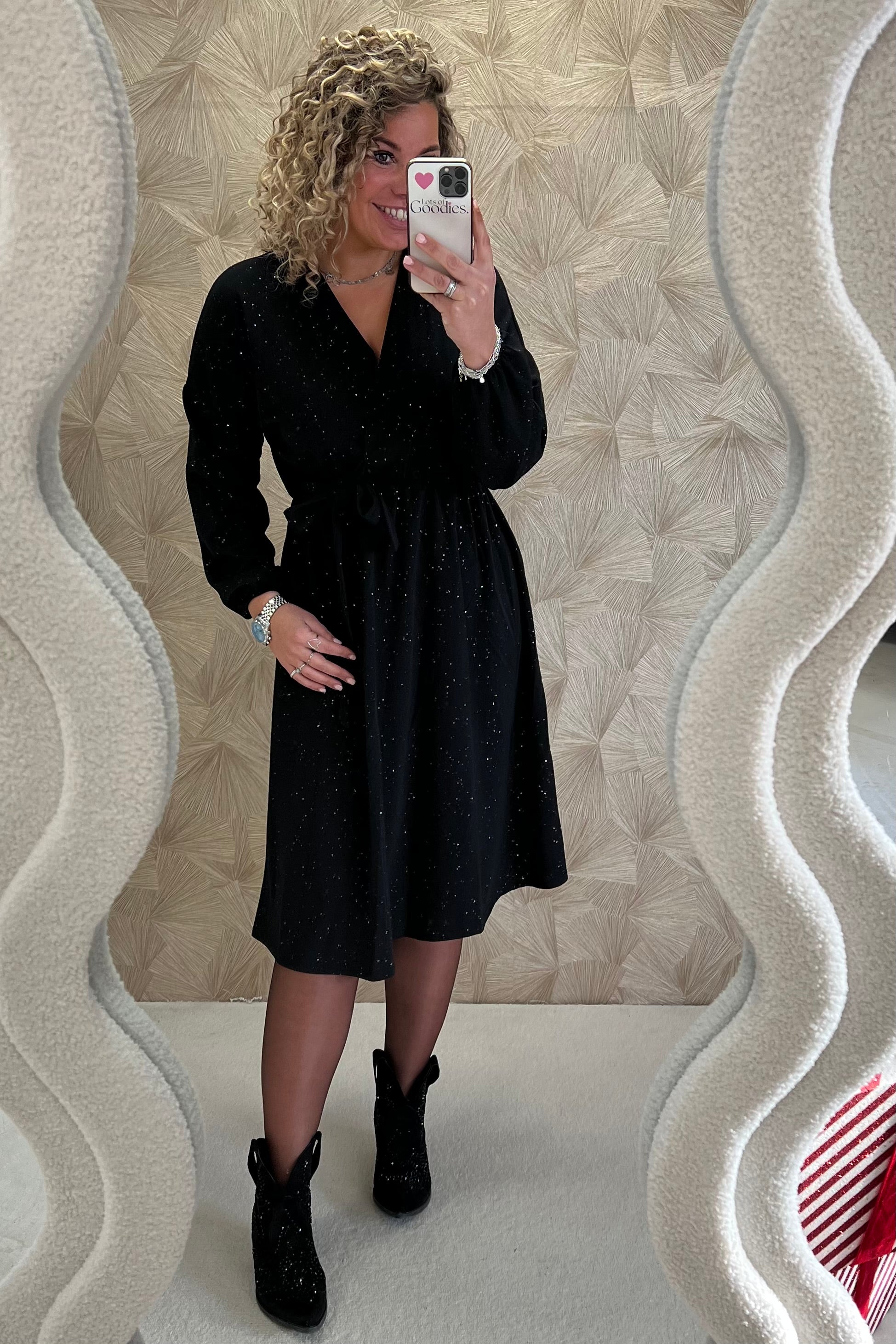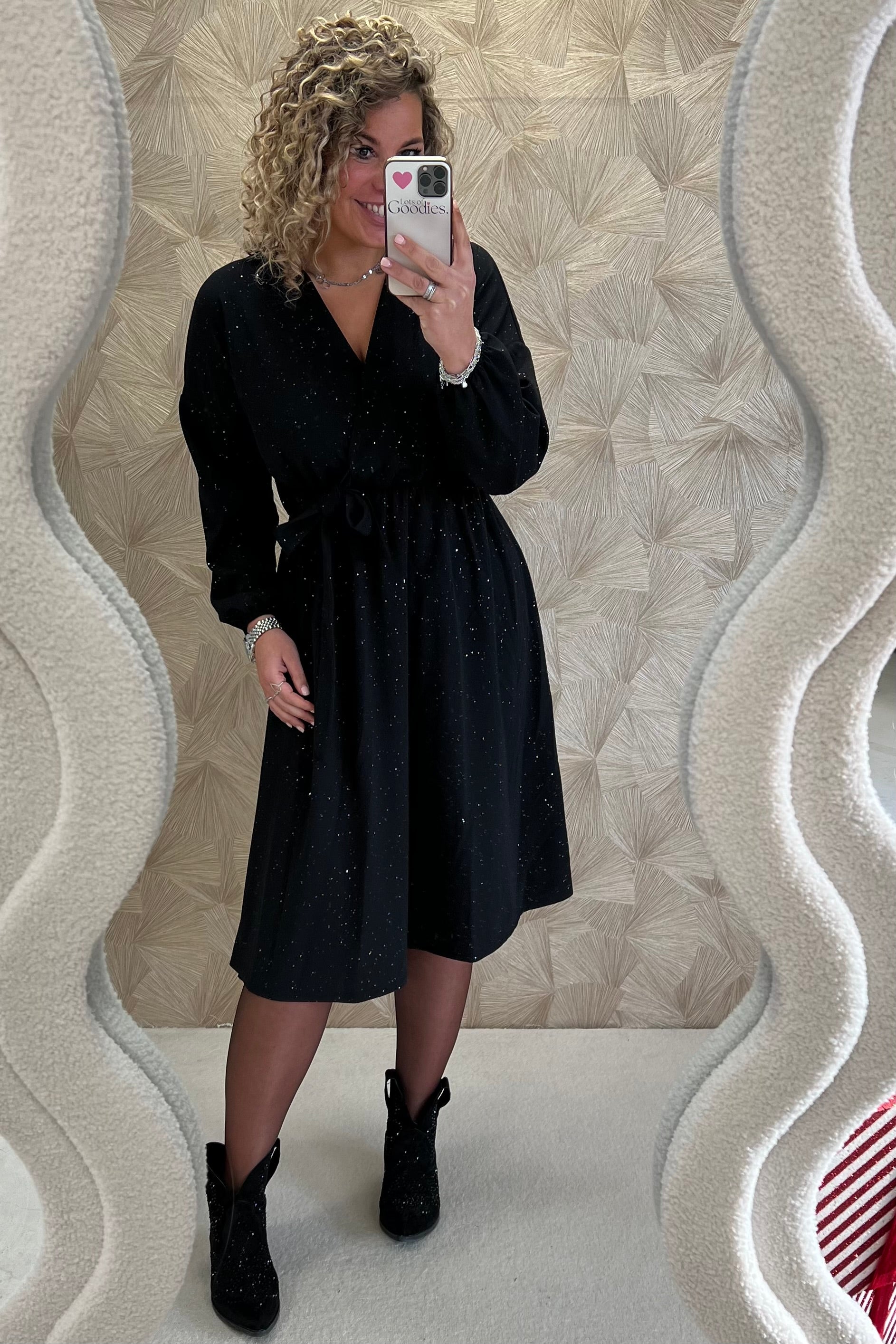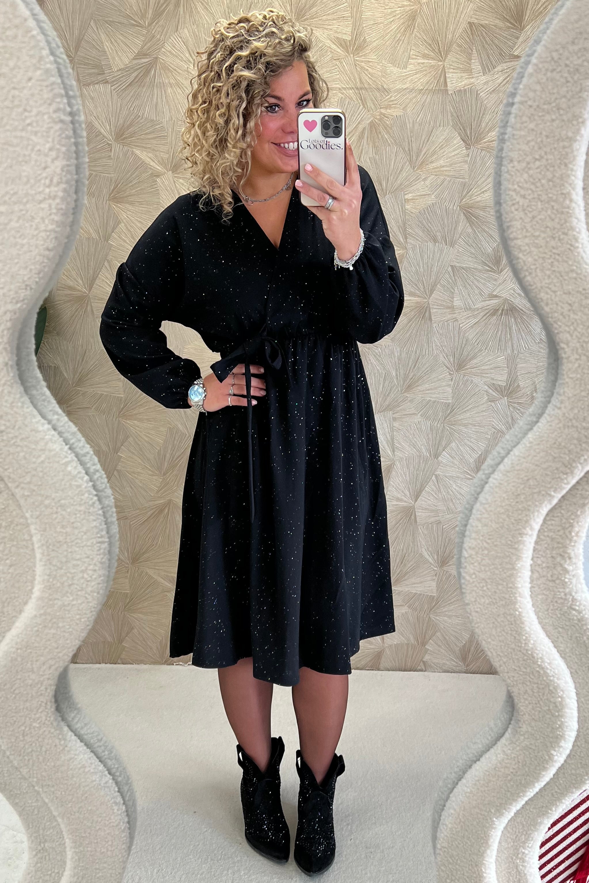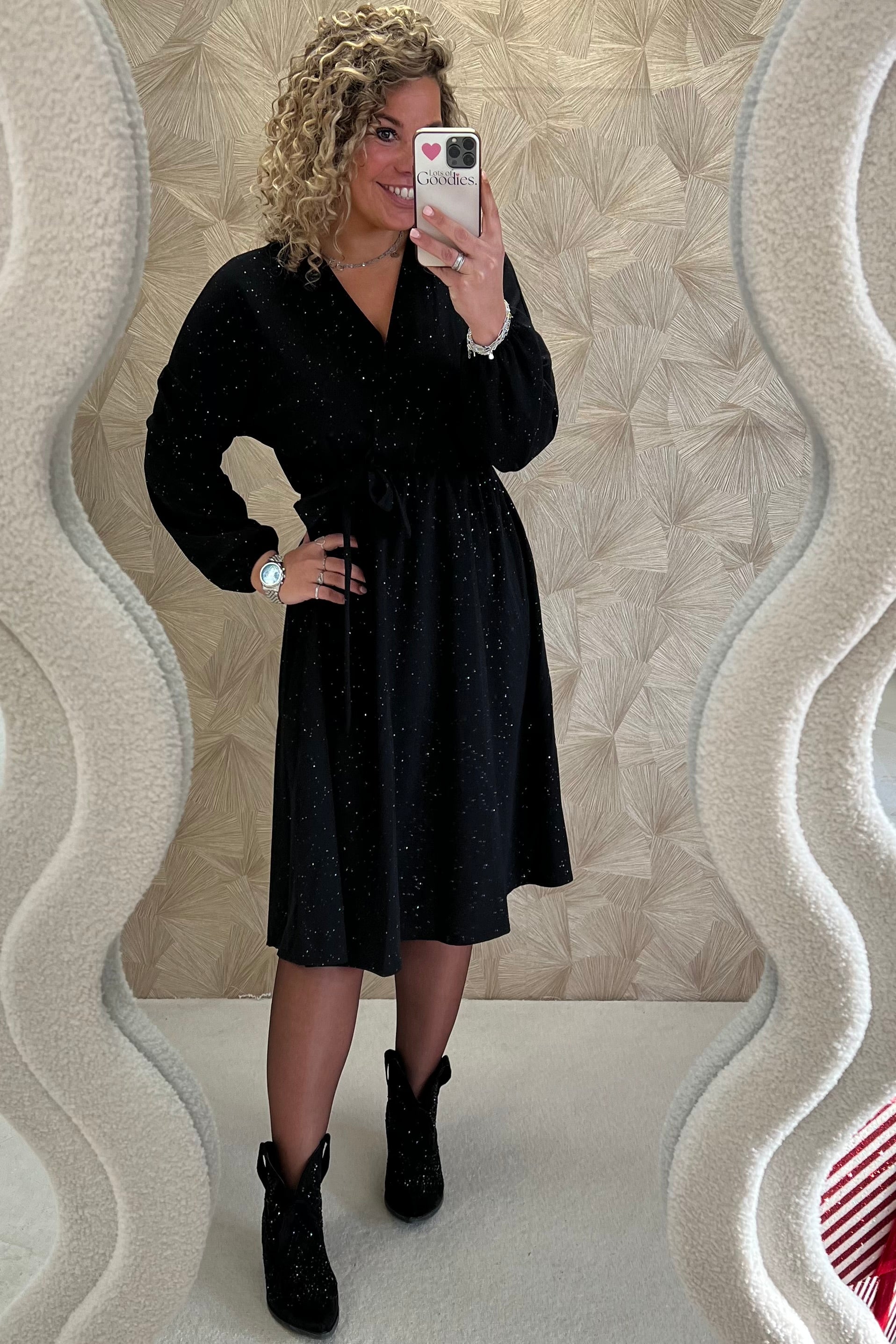 Deze black dress heeft lange mouwe, een fijjn strikje om de middel en mooie glitters! Shop hem in black!