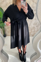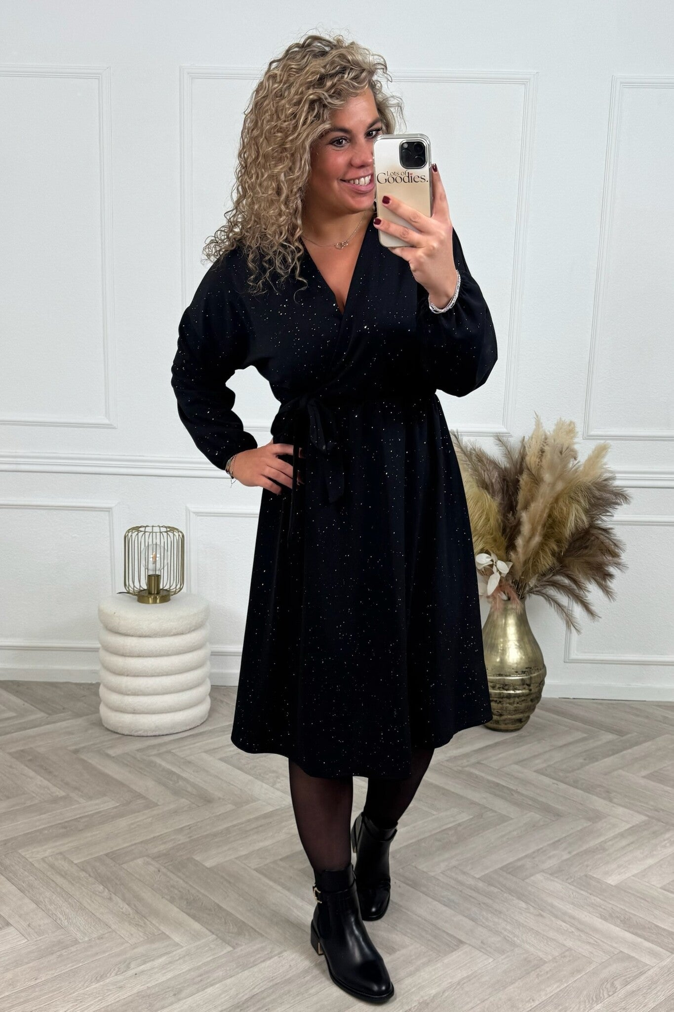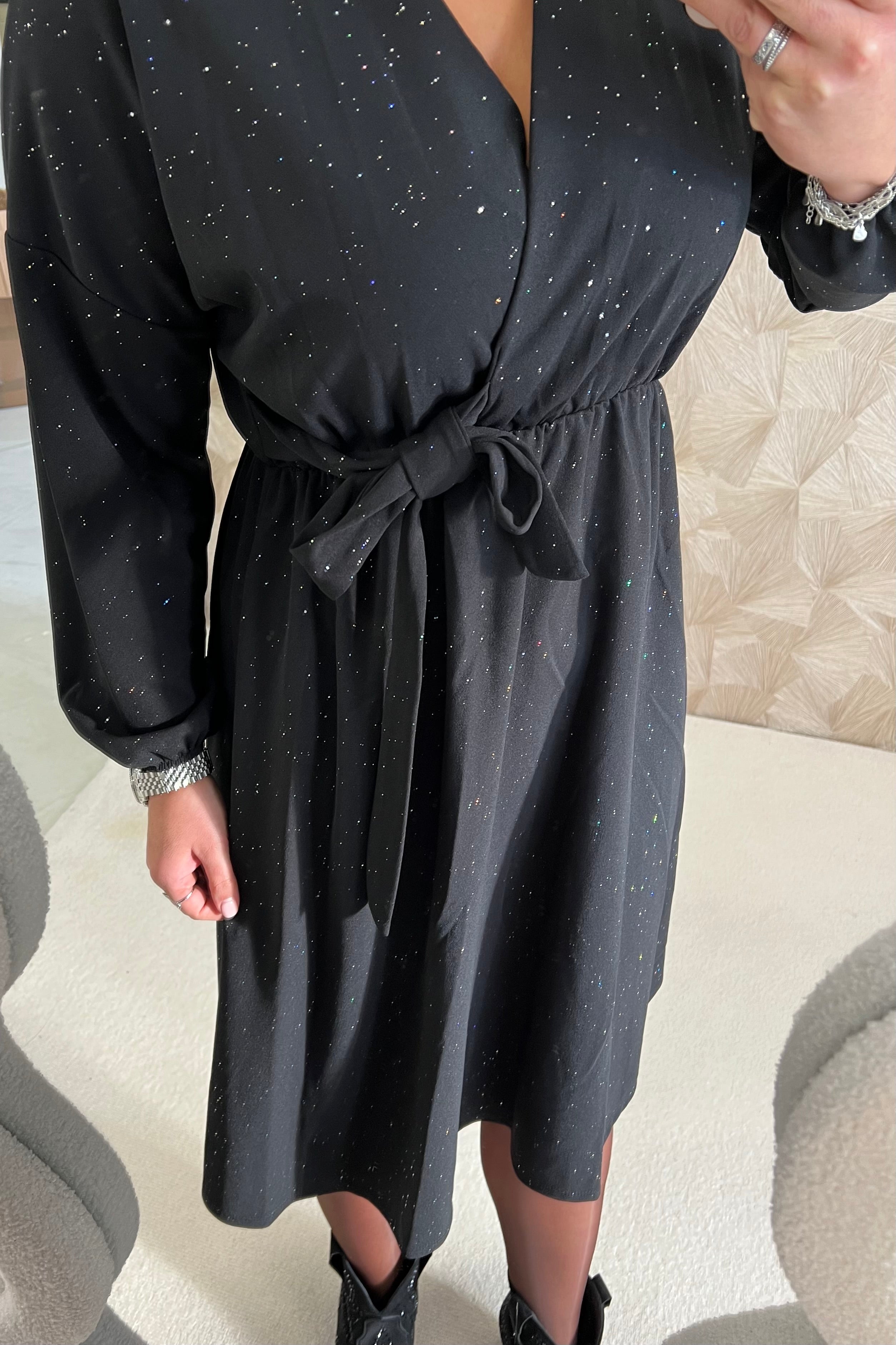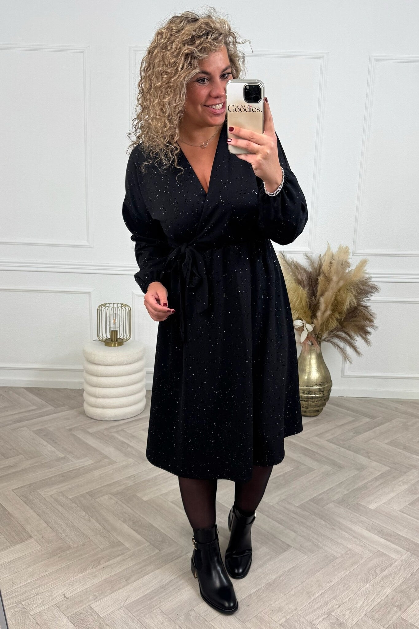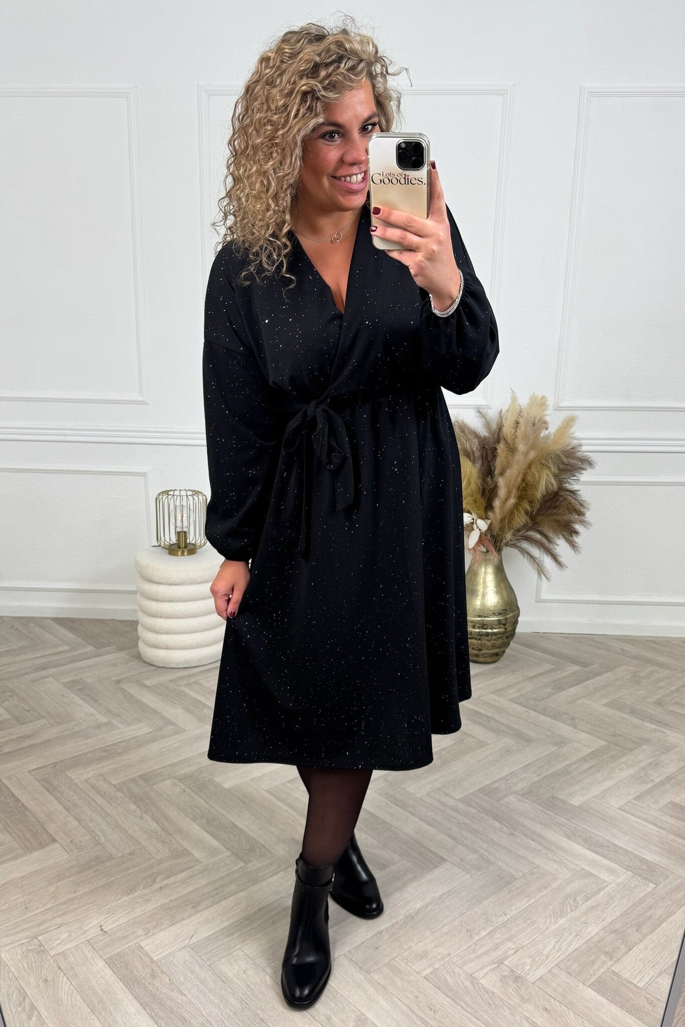 Deze black dress heeft lange mouwe, een fijjn strikje om de middel en mooie glitters! Shop hem in black!
