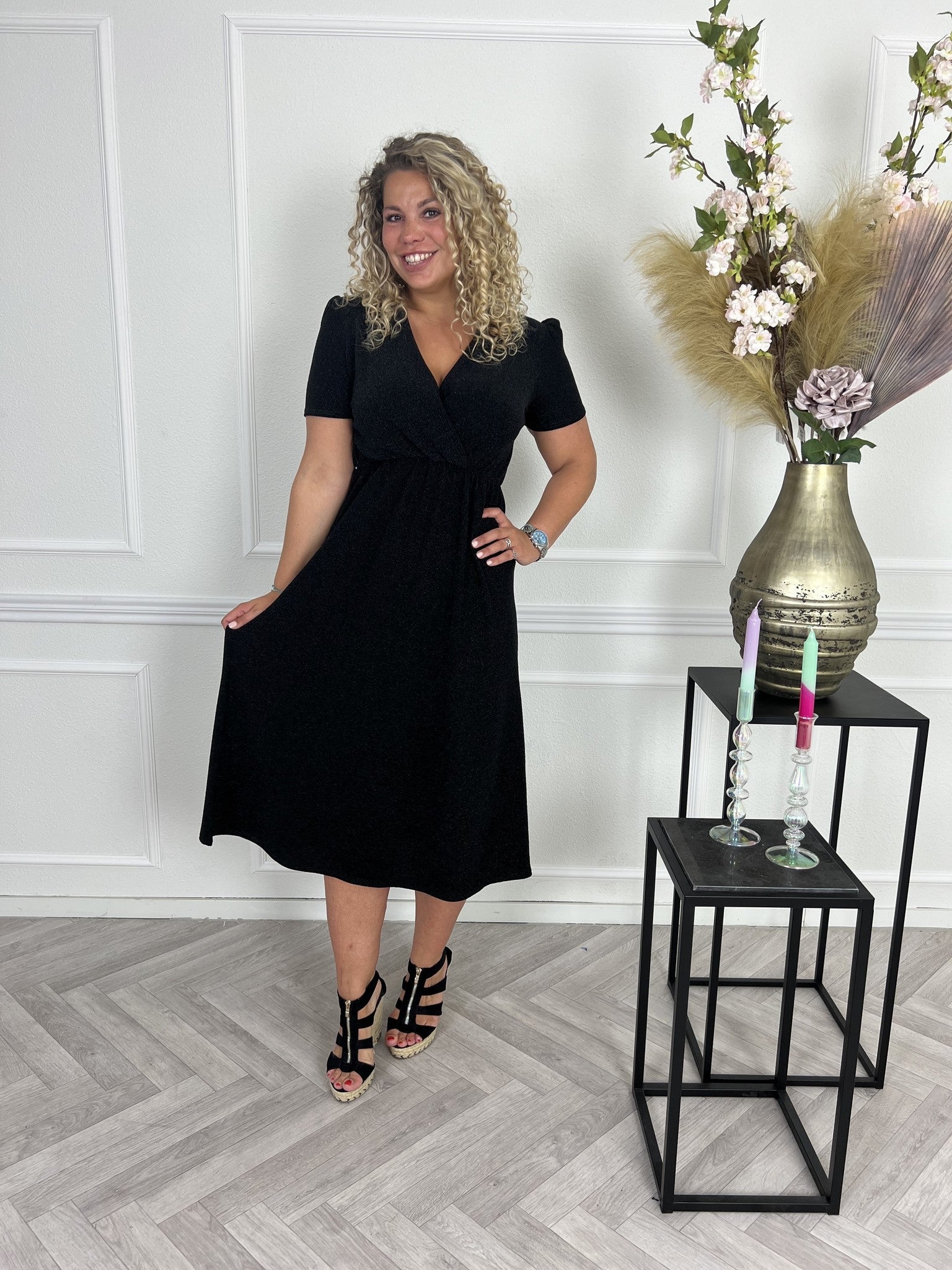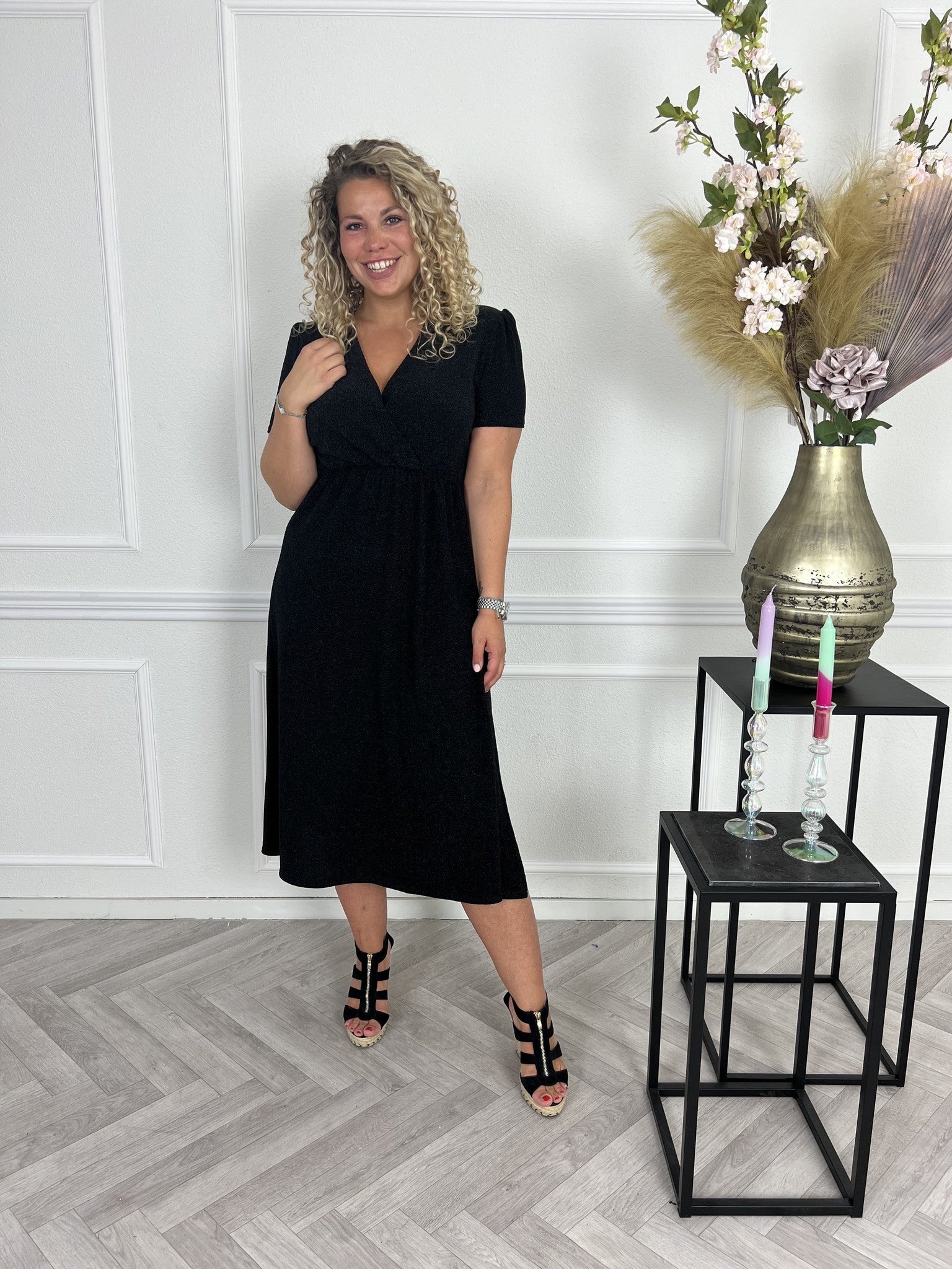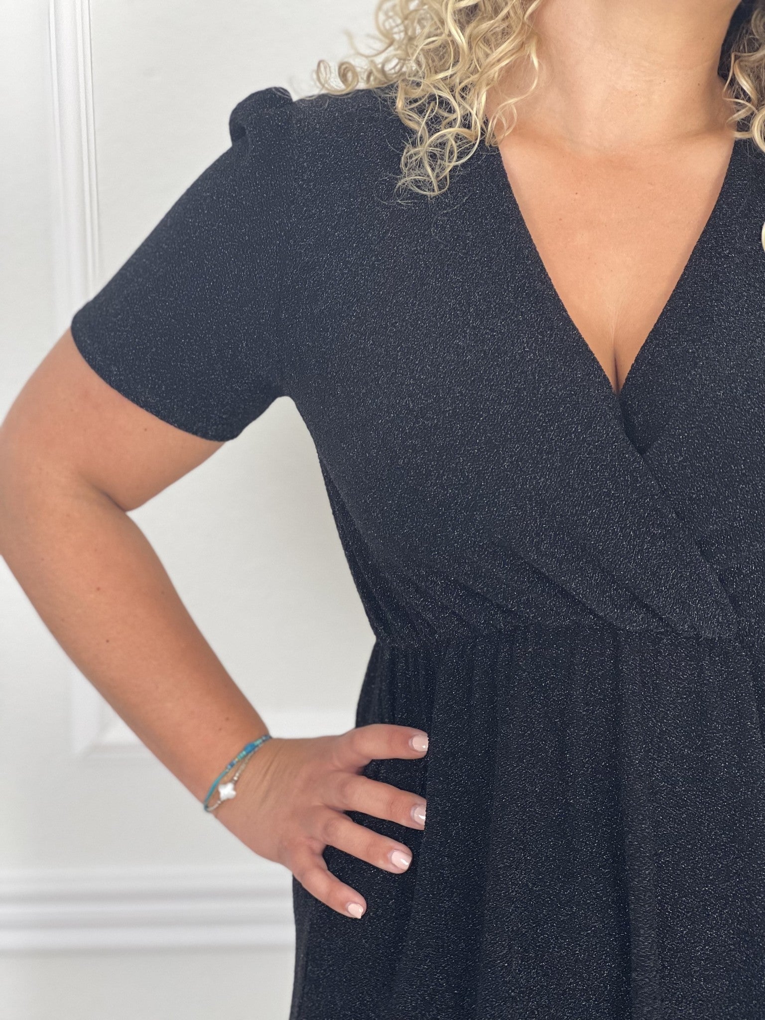 Wij houden van glitter! Deze jurk heeft een korte mouw, een mooie v hals en een kleine Split aan de linker zijde.