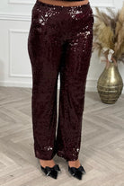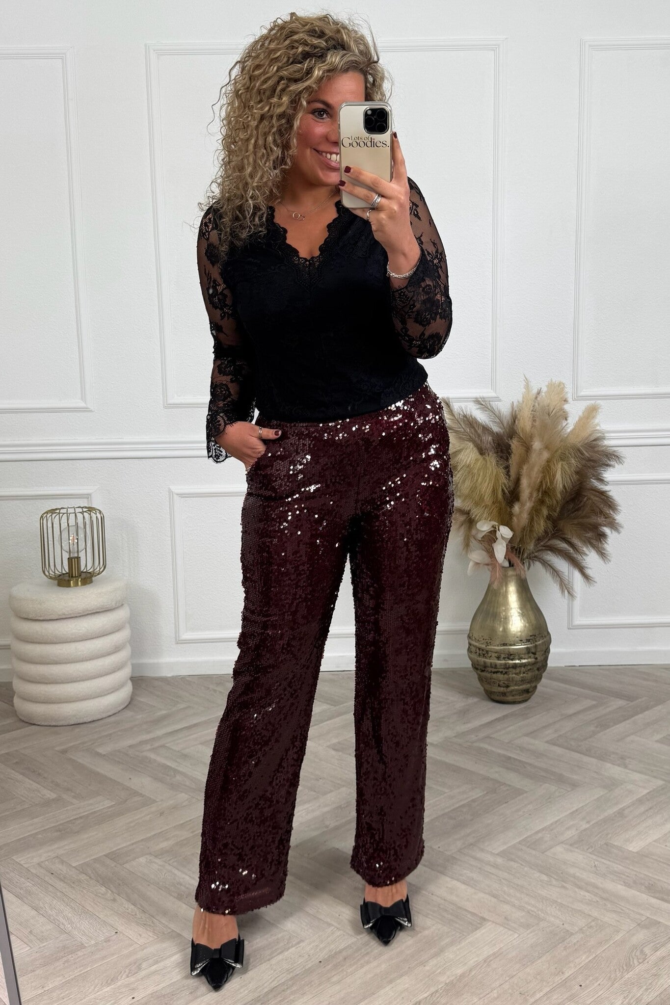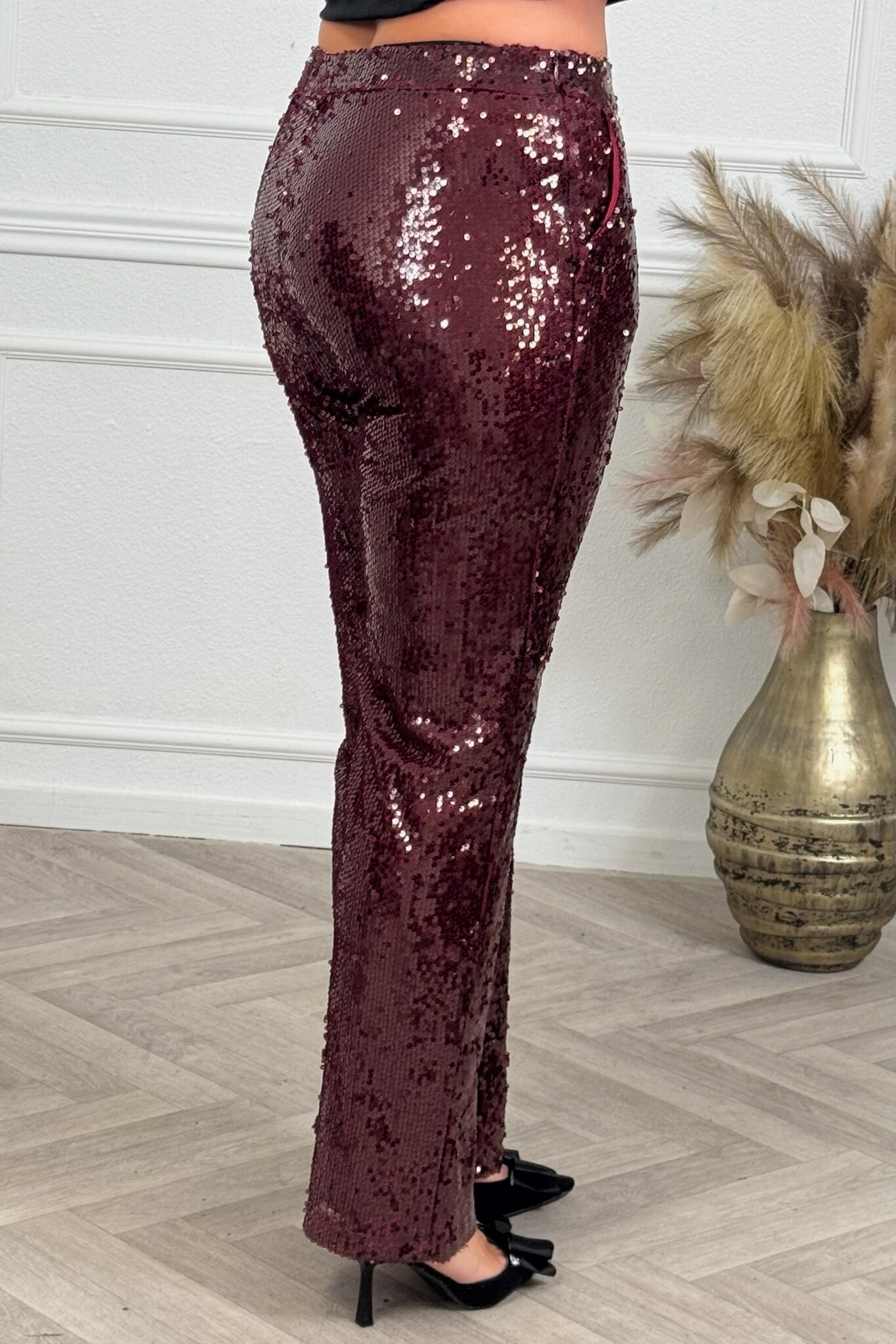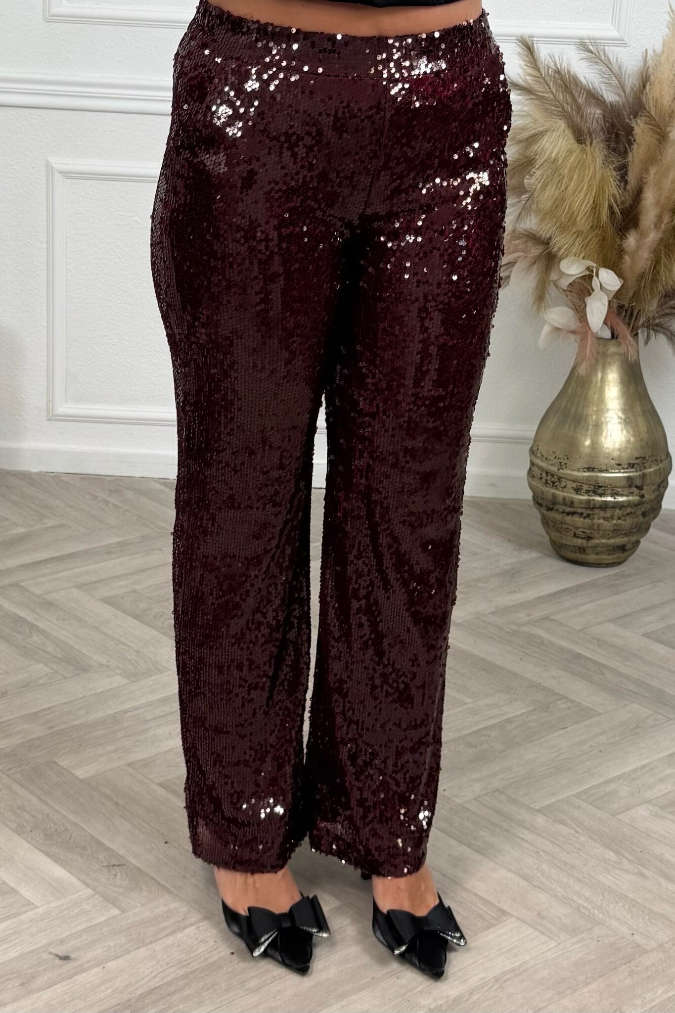 Deze amazing lovertjes broek maakt een outfit helemaal af en is perfect voor een feestje! Shop hem nu in burgundy.