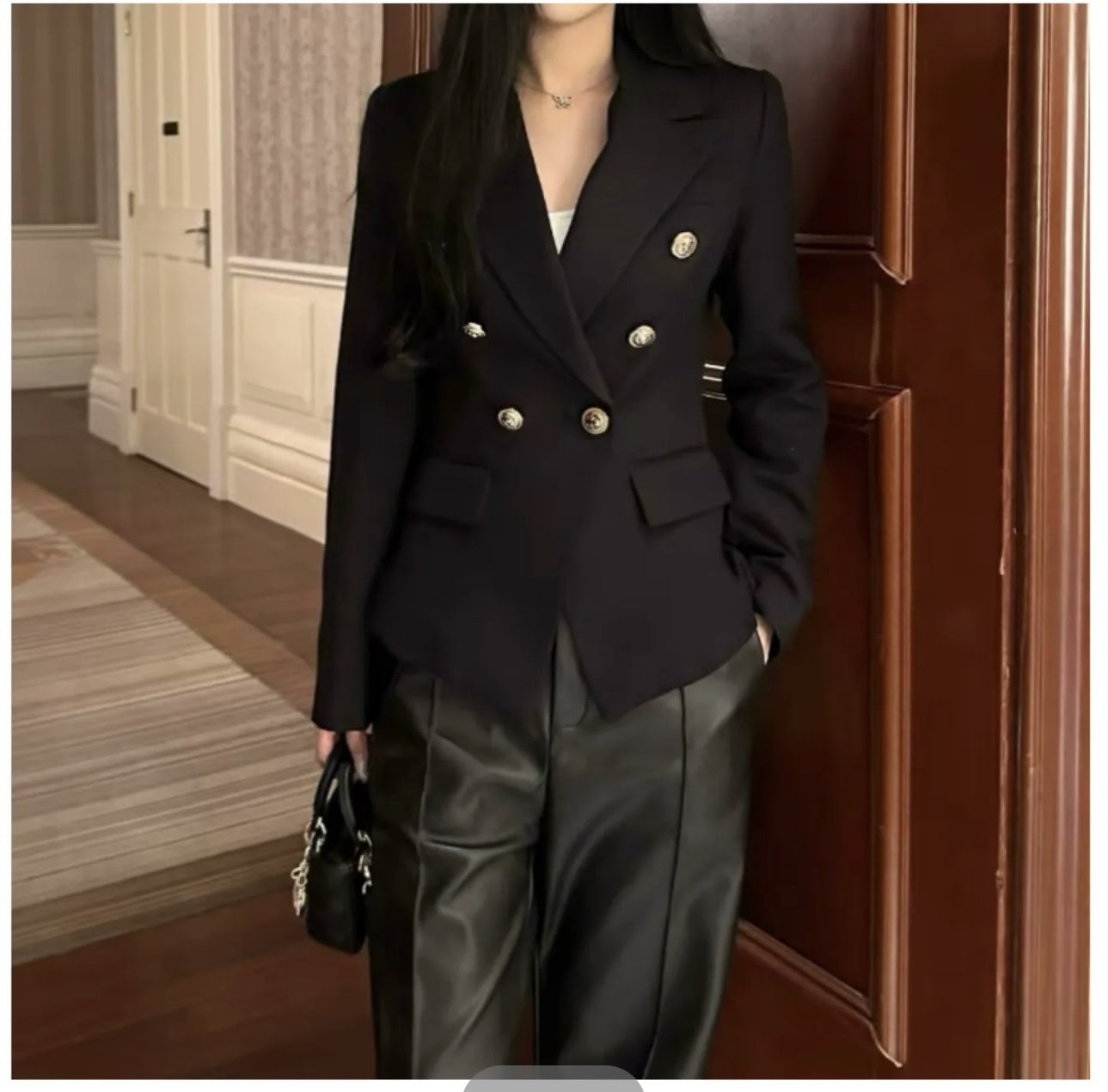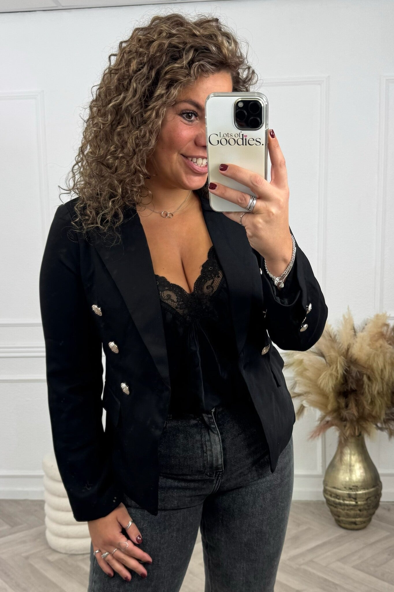 De Chloe blazer heeft gouden knopen en is getailleerd.