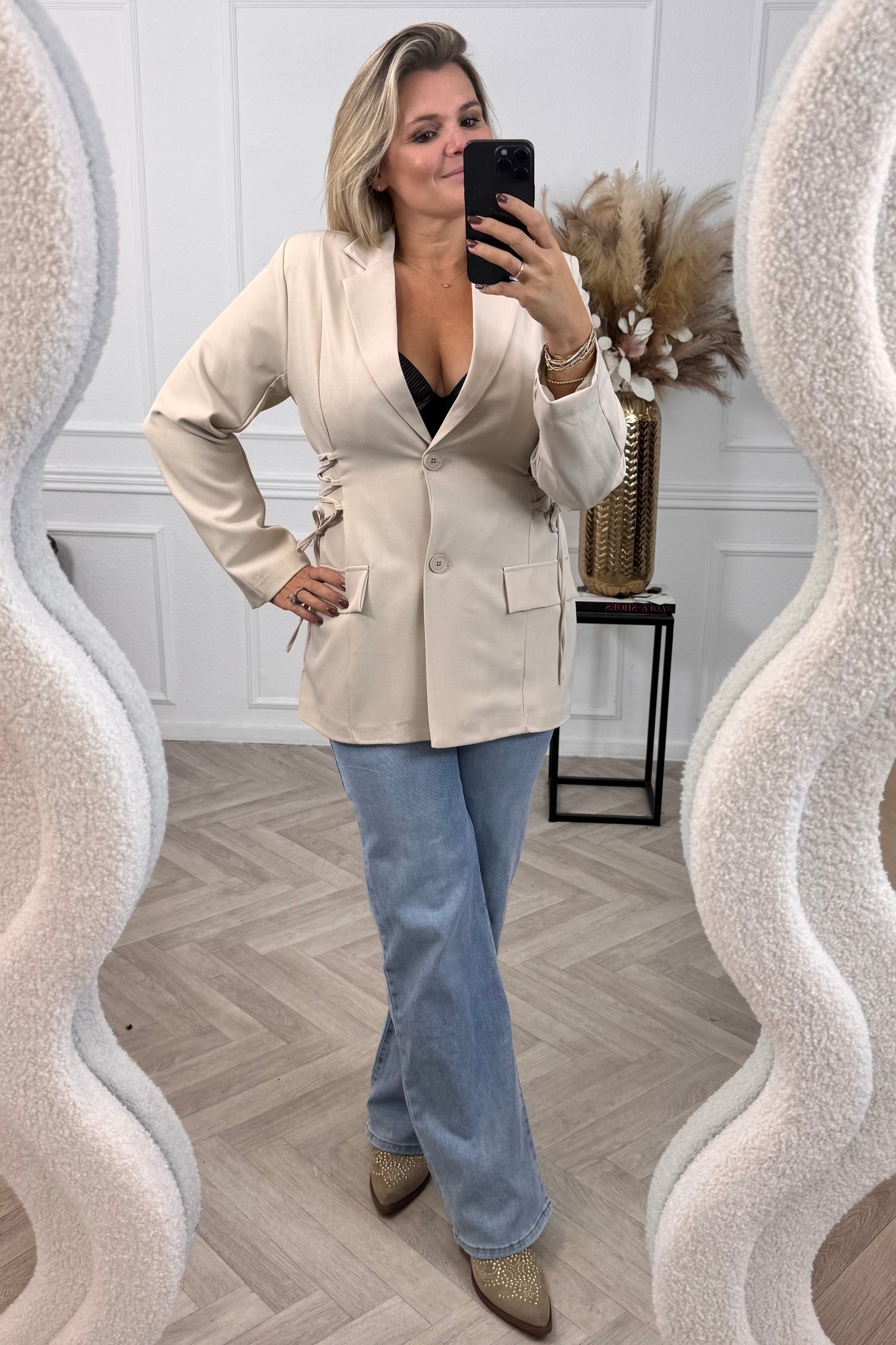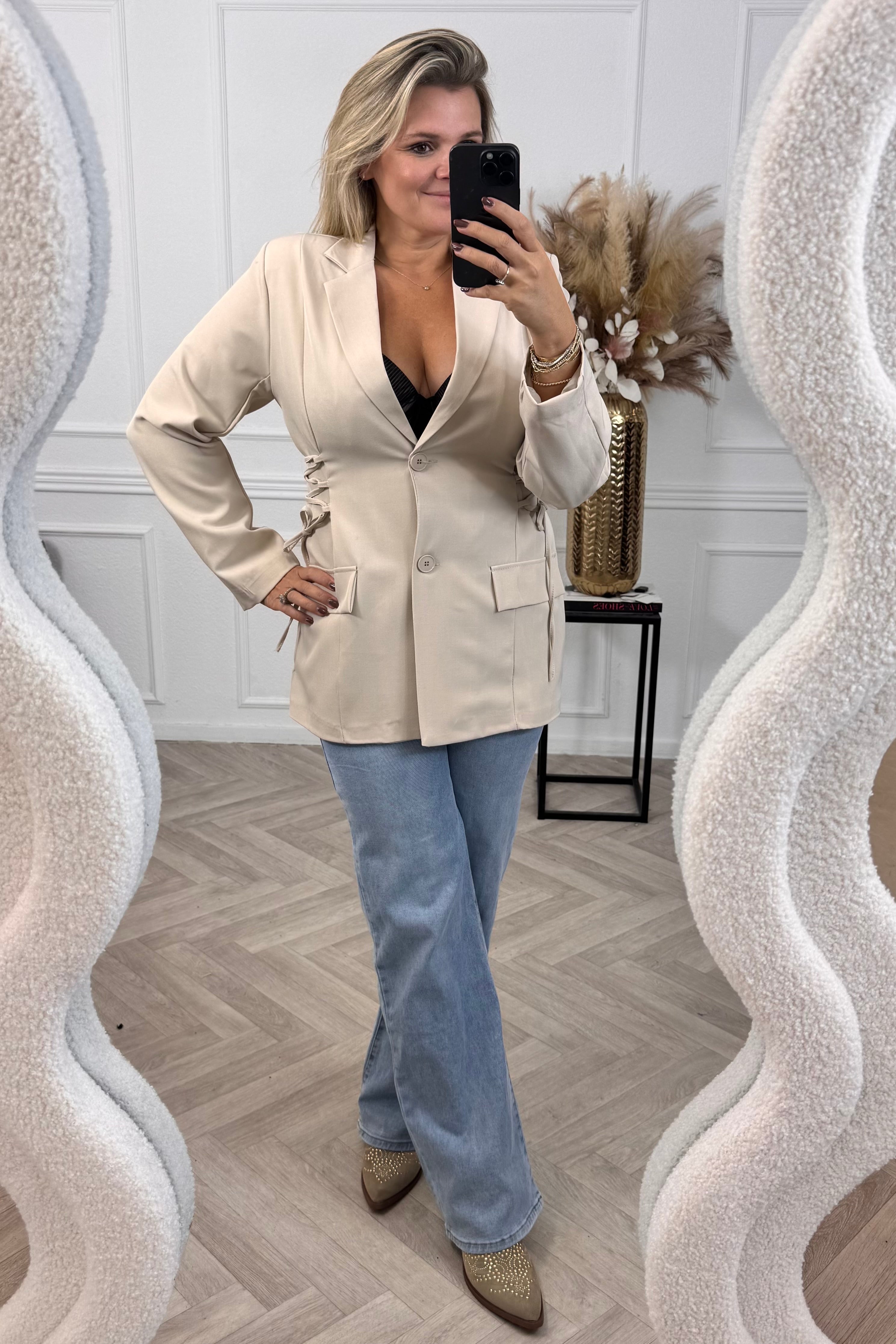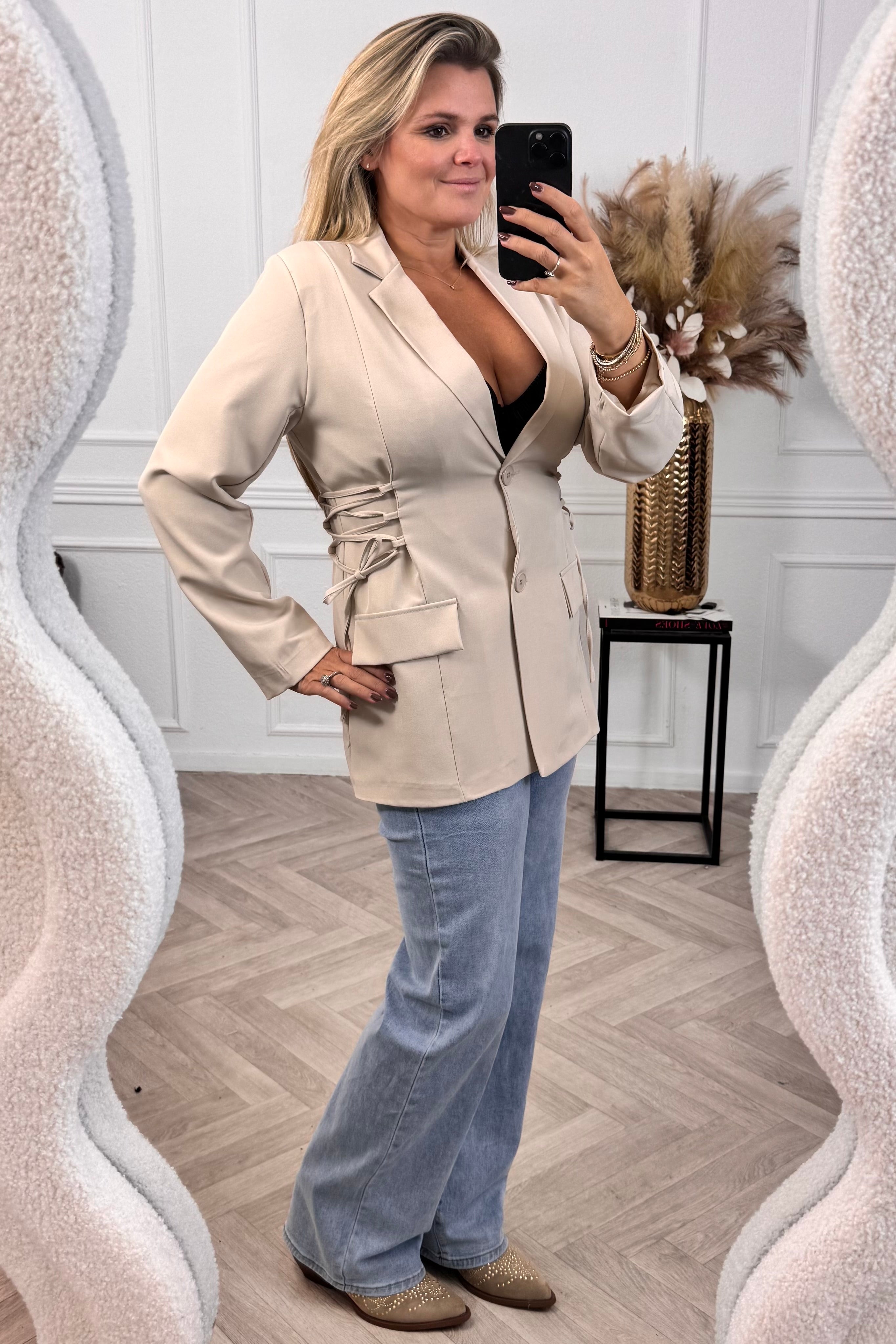 Deze mooie blazer heeft een gevlochten detail aan de zijkanten! Shop hem nu in beige!