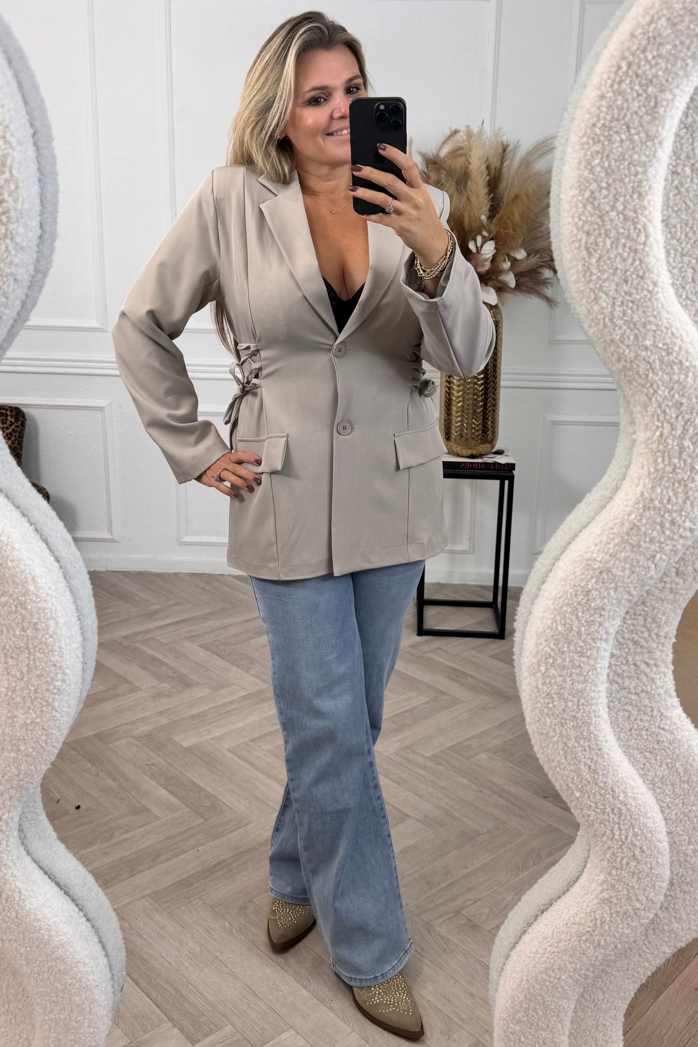 Deze mooie blazer heeft een gevlochten detail aan de zijkanten! Shop hem nu in taupe!