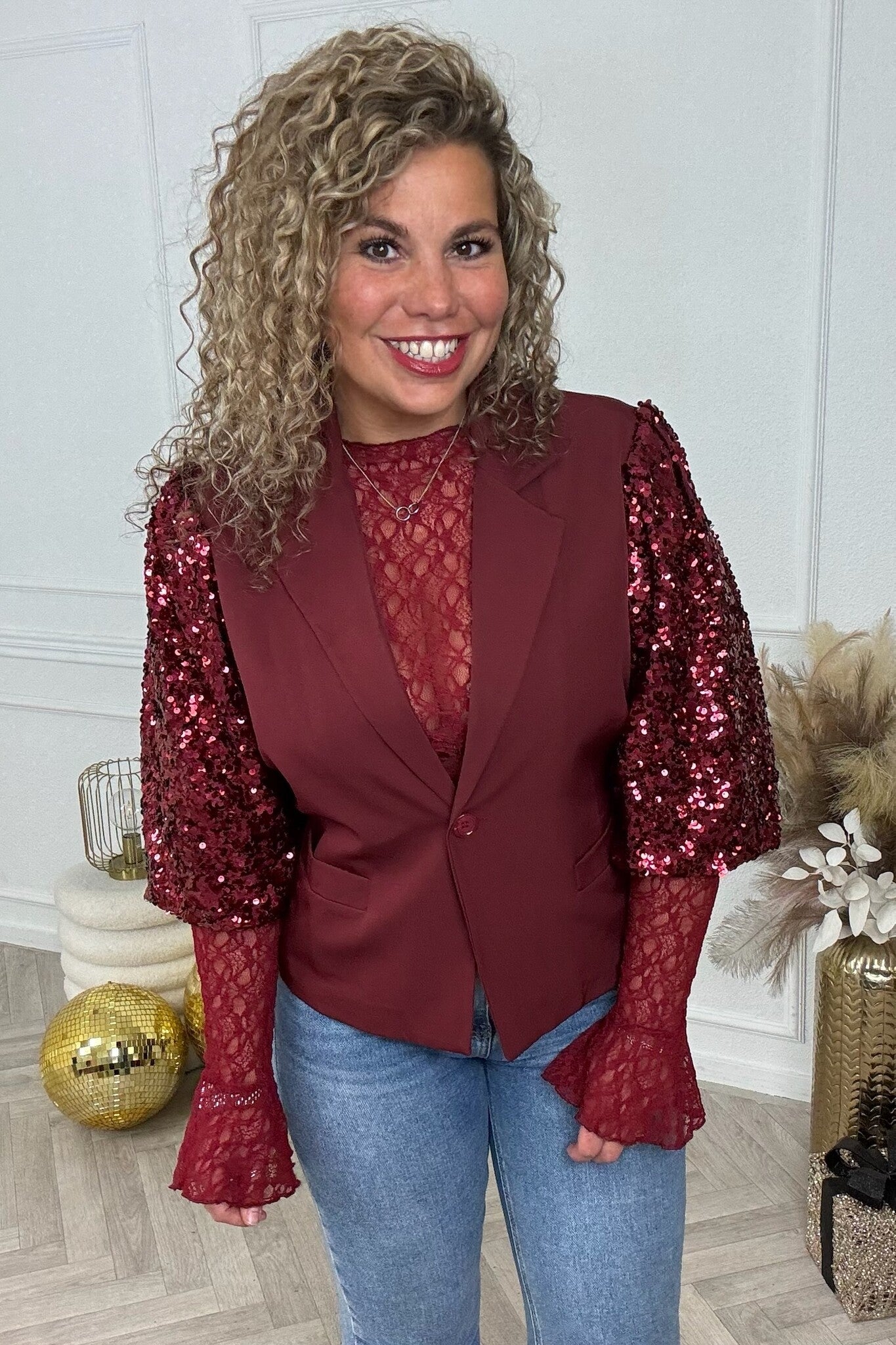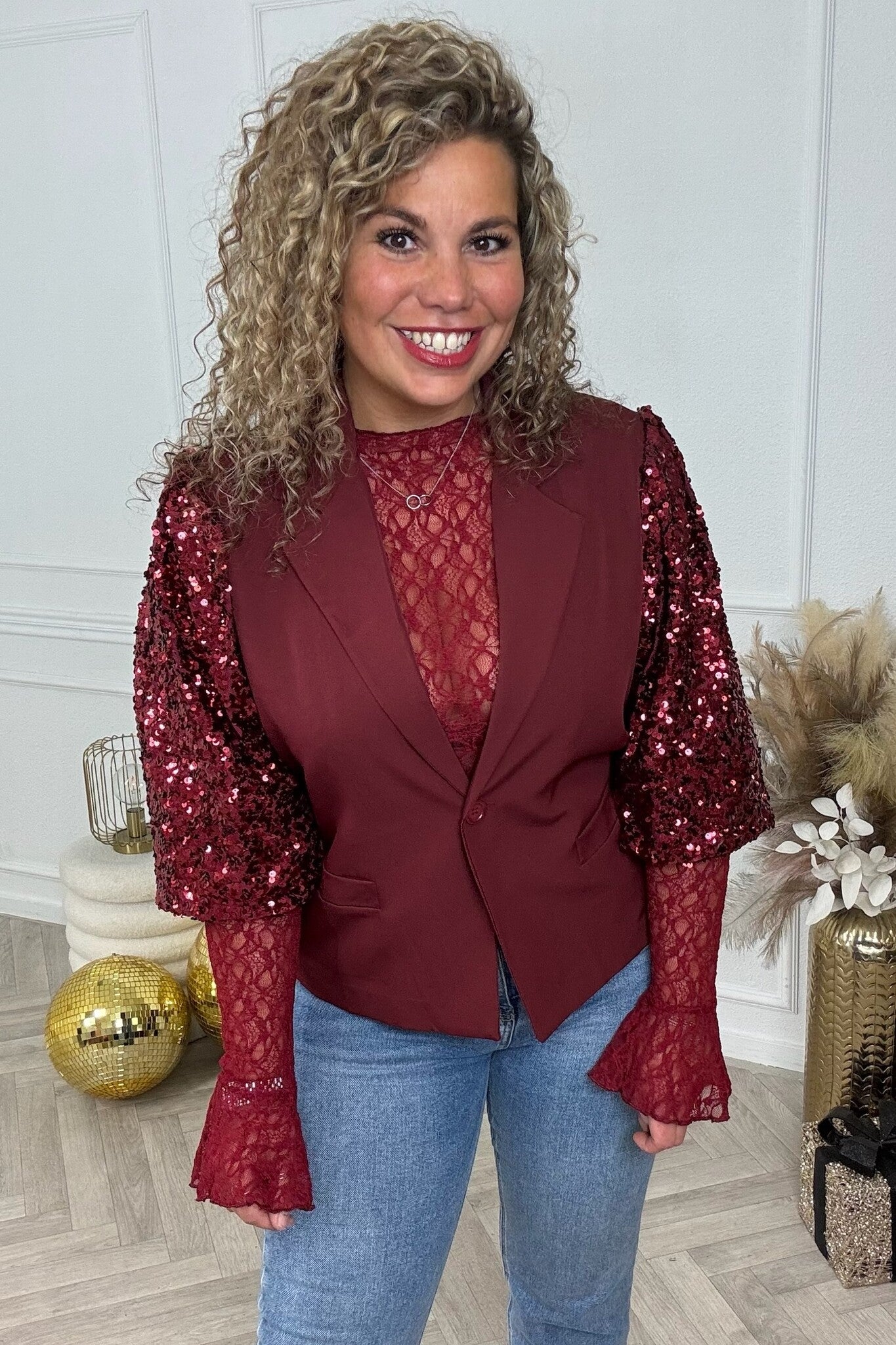 Onze prachtige sequin blazers hebben kleine zakken aan de voorkant en geweldige korte poof mouwtjes. Shop hem nu in Burgundy!