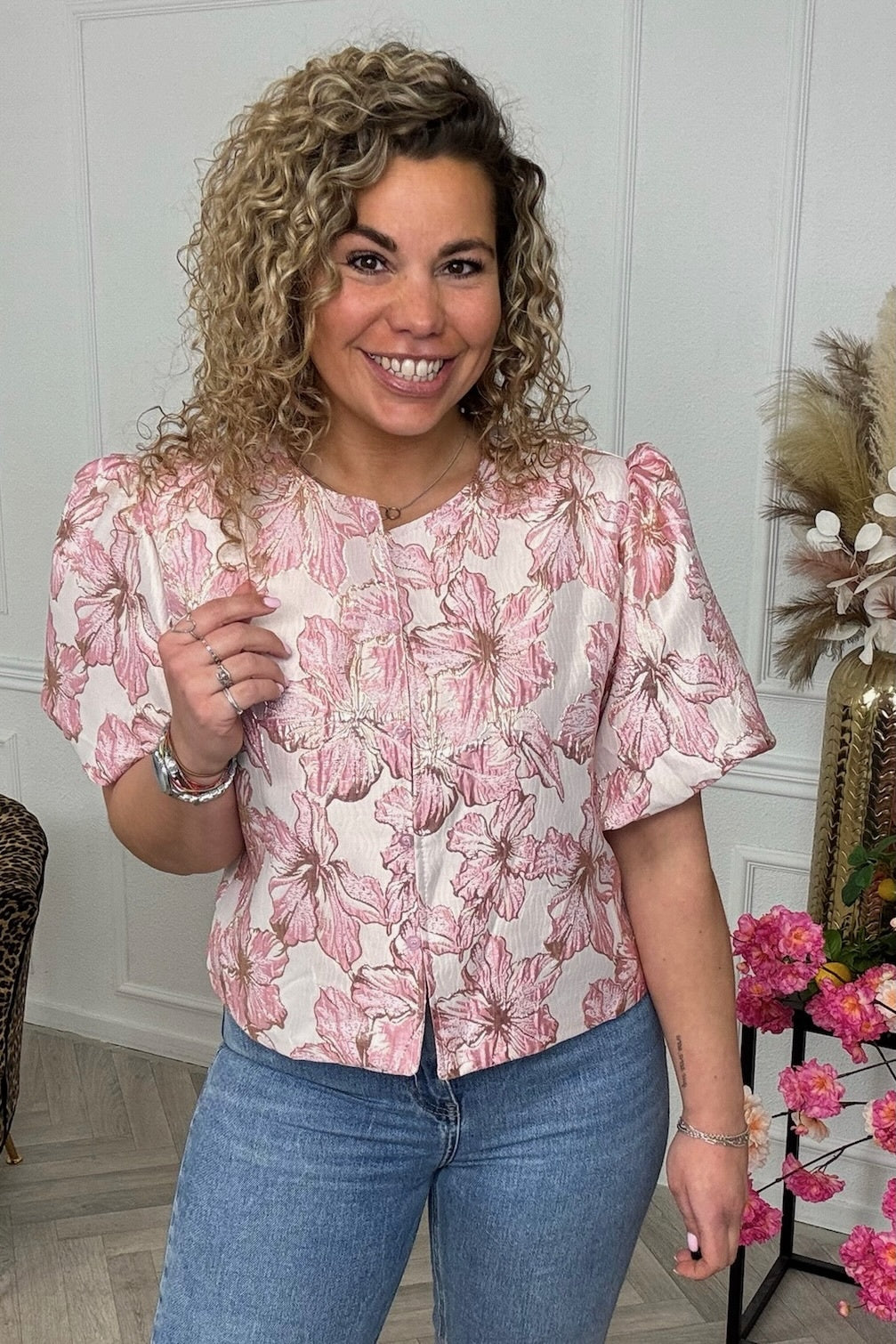 Flower Balloon Sleeve Blouse - Pink