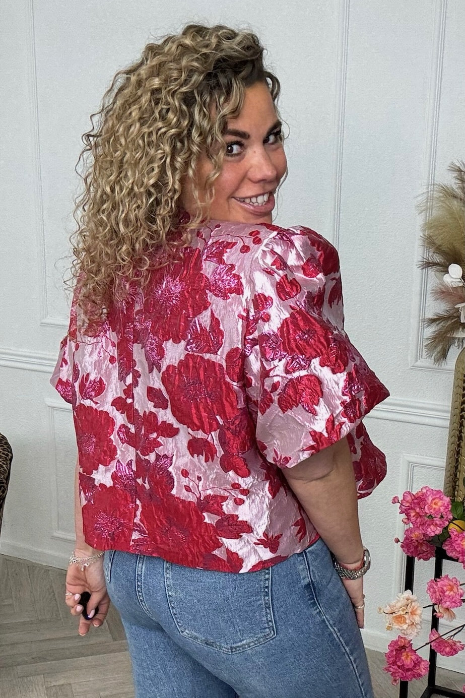 Flower Balloon Sleeve Blouse - Red