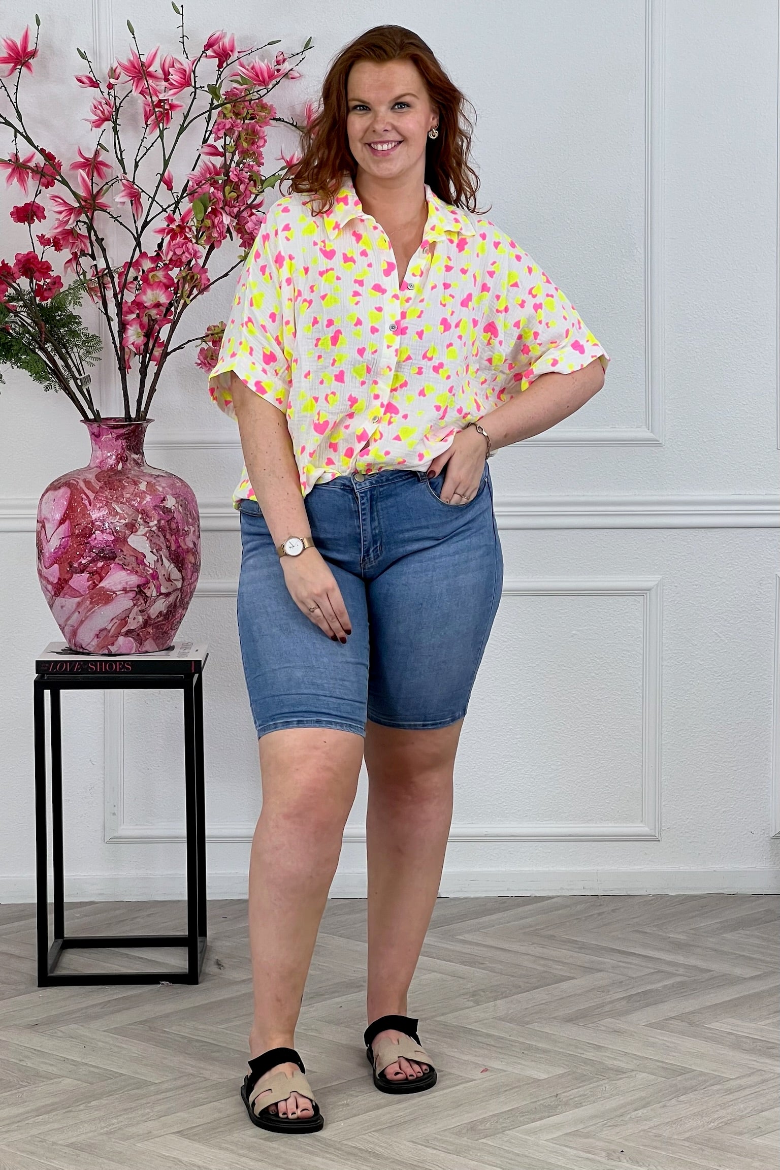 We hebben een super vrolijke blouse binnen met een v-nek en een hartjes patroon. We love it! Shop hem nu in yellow.