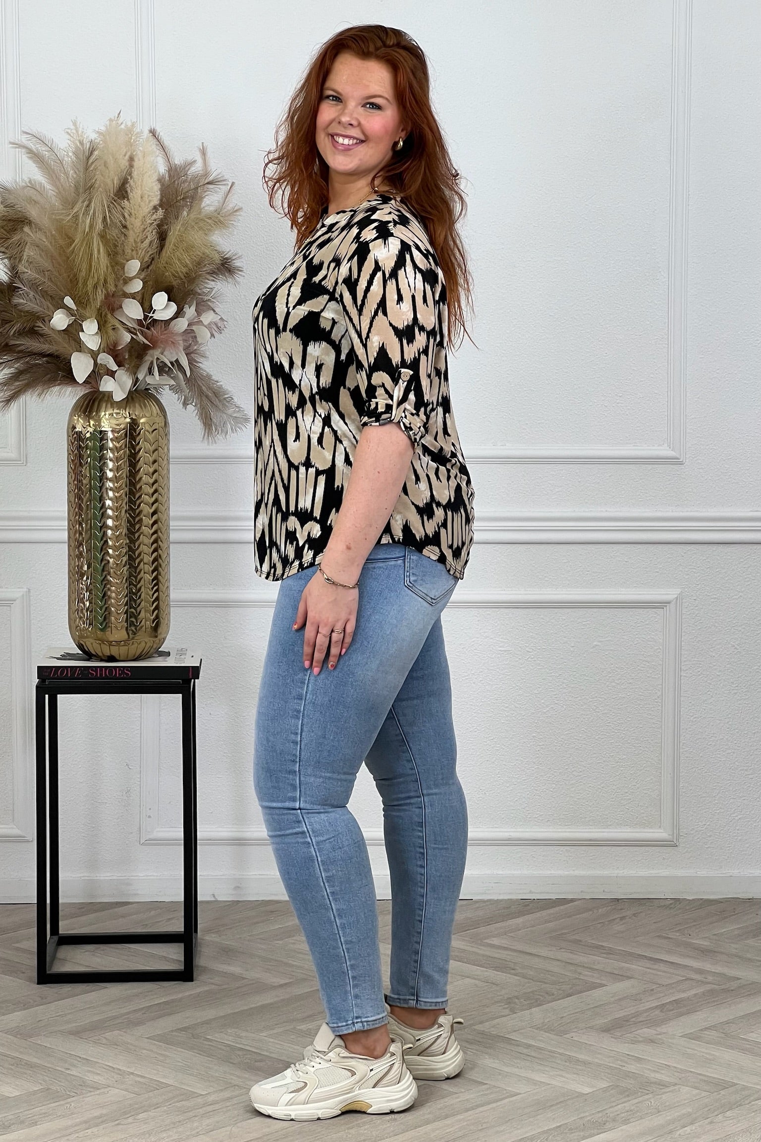 Een mooi blousje met V hals en een opgestroopt mouwtje! Je shopt ze in diverse kleuren en printjes! Shop hem in piperprint met black/camel!