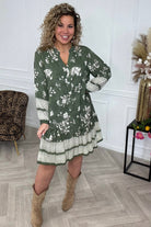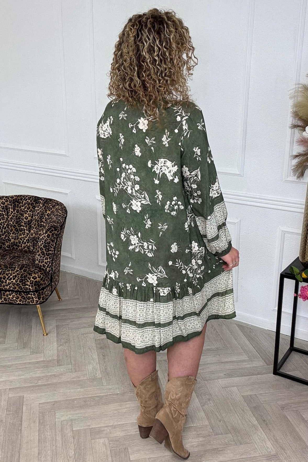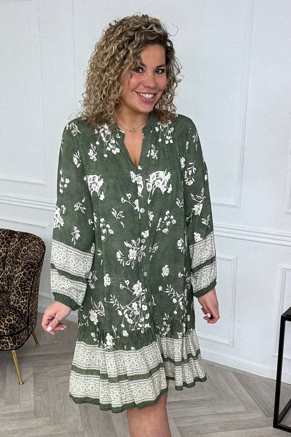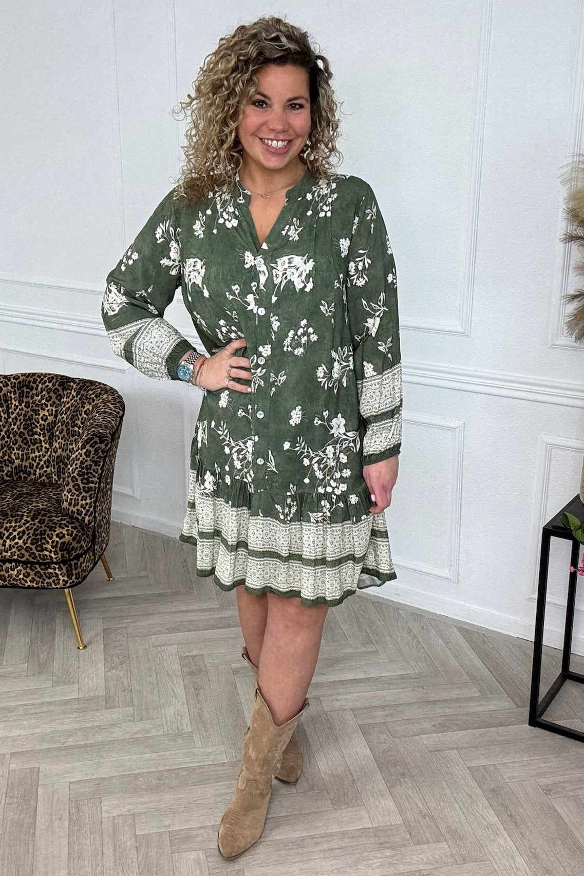 Deze leuke jurk heeft een mooie print, knoopjes en bloemen! Gemaakt van 100% viscose. Shop hem nu in armygreen/white.