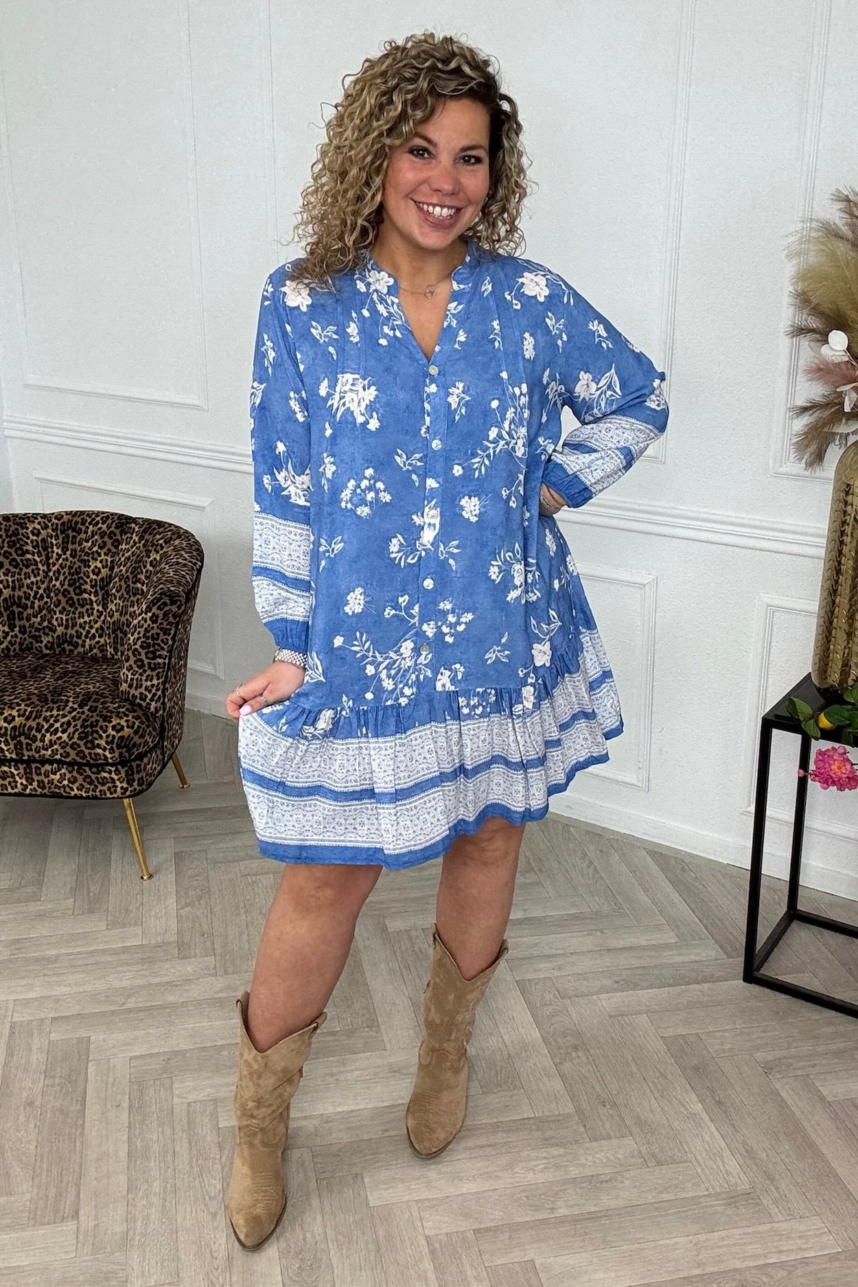 Deze leuke jurk heeft een mooie print, knoopjes en bloemen! Gemaakt van 100% viscose. Shop hem nu in blue/white.