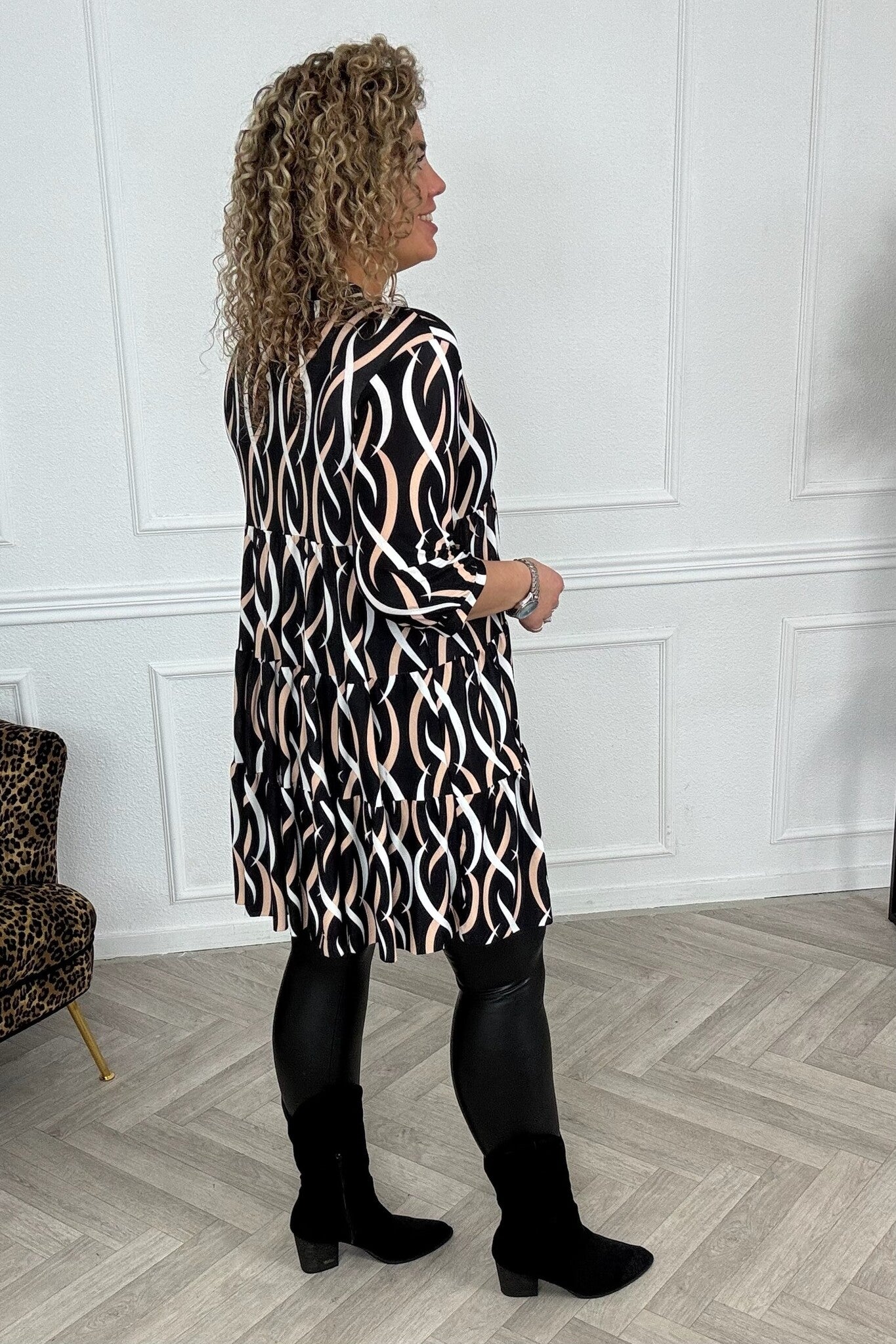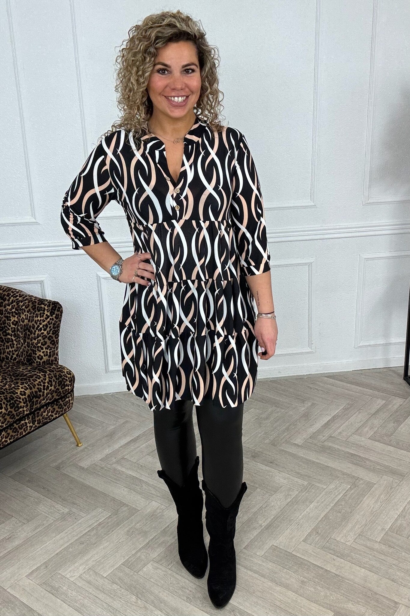 Deze jurk is het helemaal. Naar beneden toe loopt hij wat wijder uit, verkrijgbaar in meerdere prints! Shop hem in barbwireprint black/white!