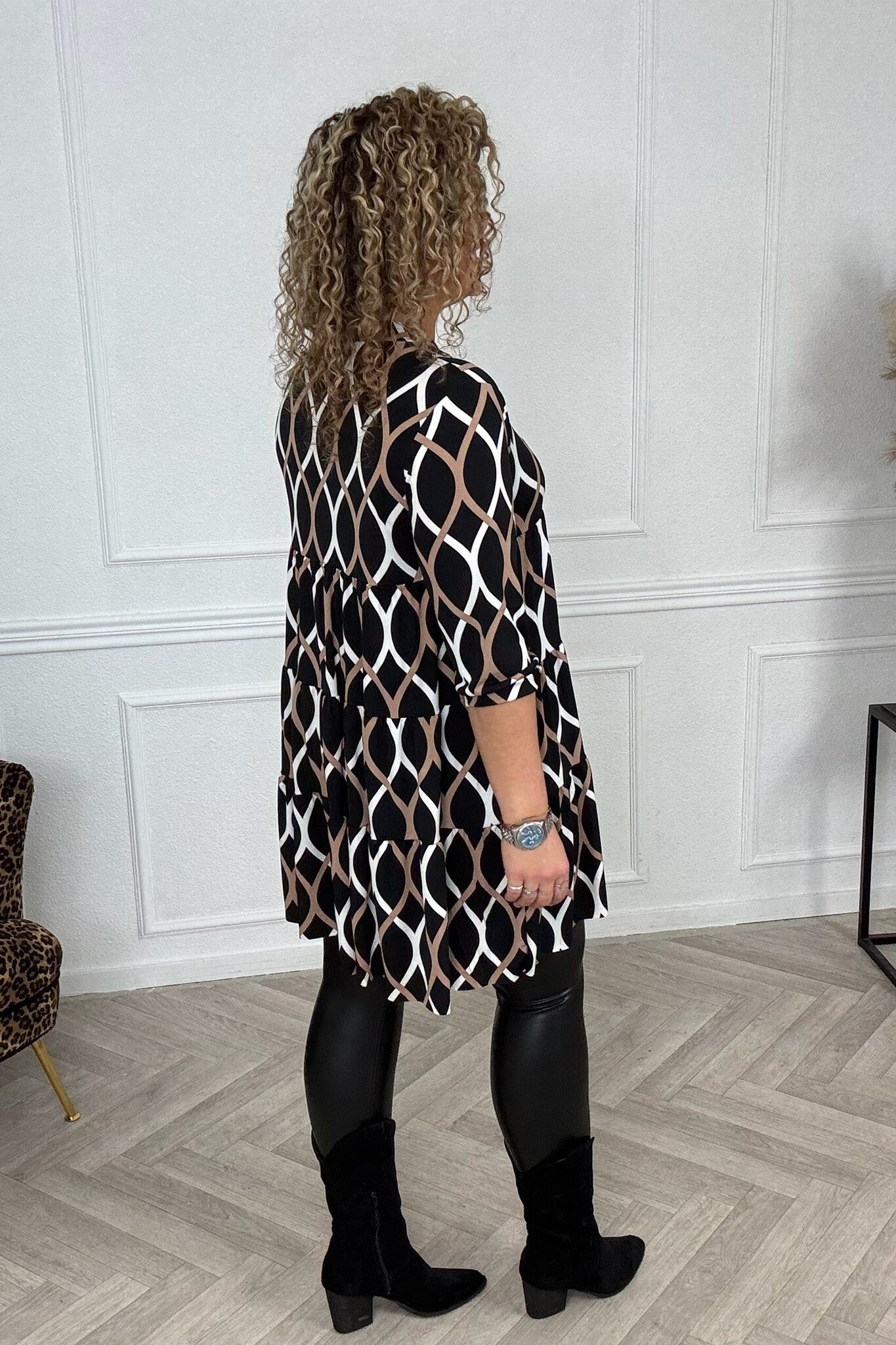 Deze jurk is het helemaal. Naar beneden toe loopt hij wat wijder uit, verkrijgbaar in meerdere prints! Shop hem in teardropprint camel!