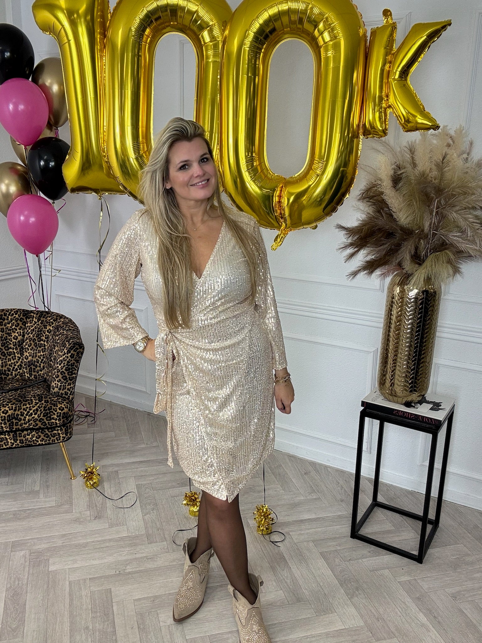 Een super jurk met glittertjes en een mooi strikje! Shop de sequin wrap dress nu in beige.
