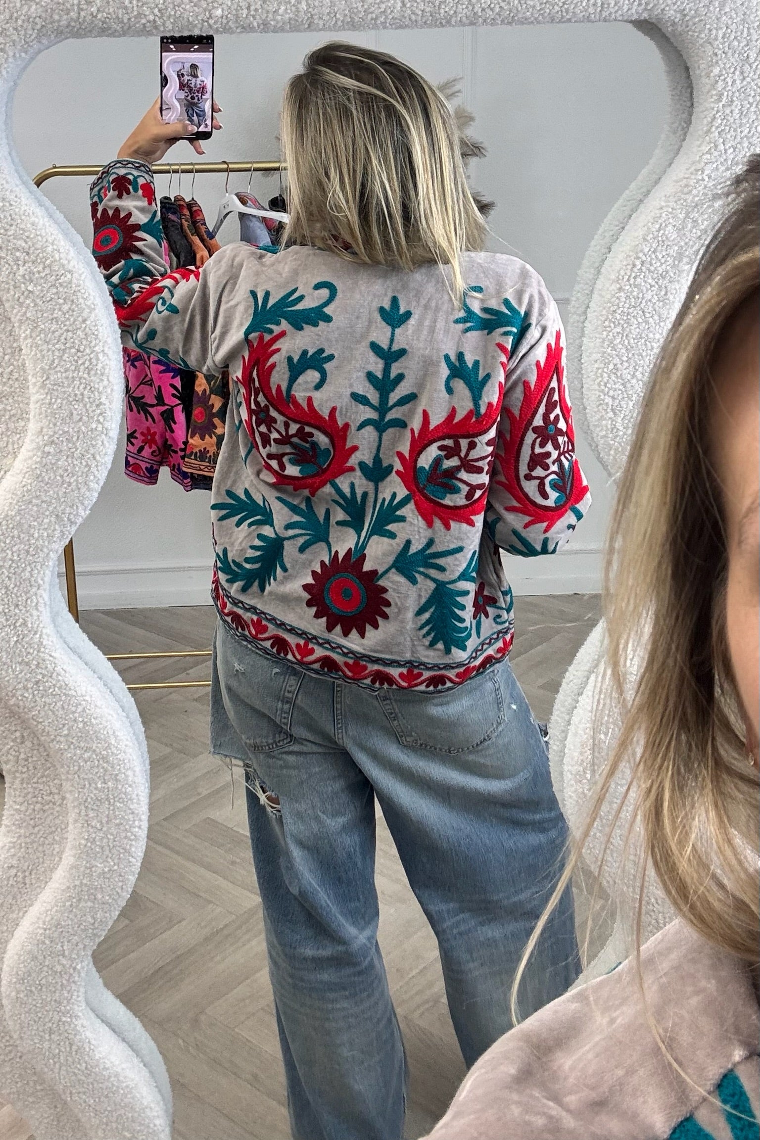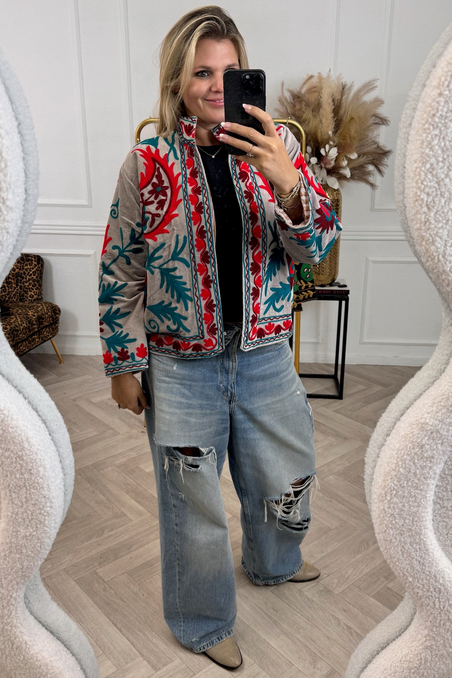 Dit mega leuke jasje is gemaakt van 100% katoen en heeft een velvet look! Dit exemplaar heeft een mooie flames print. Shop hem nu in light grey!