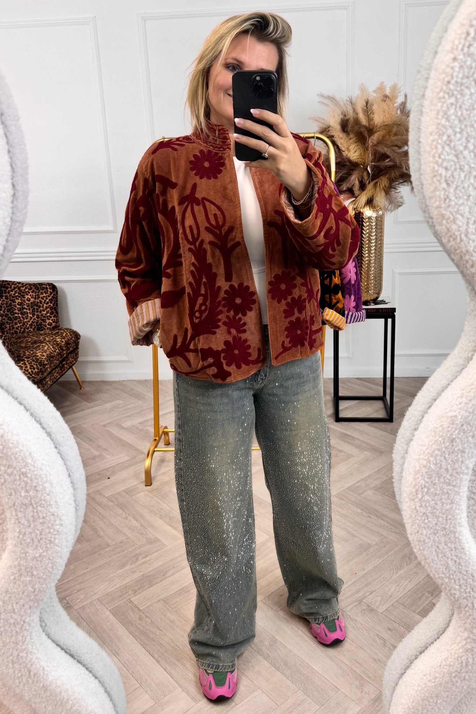 Dit mega leuke jasje is gemaakt van 100% katoen en heeft een velvet look! Dit exemplaar heeft een gave trishul print, hij is ook verkrijgbaar met andere mooie prints. Wees er snel bij en shop hem nu in brown trishul print!