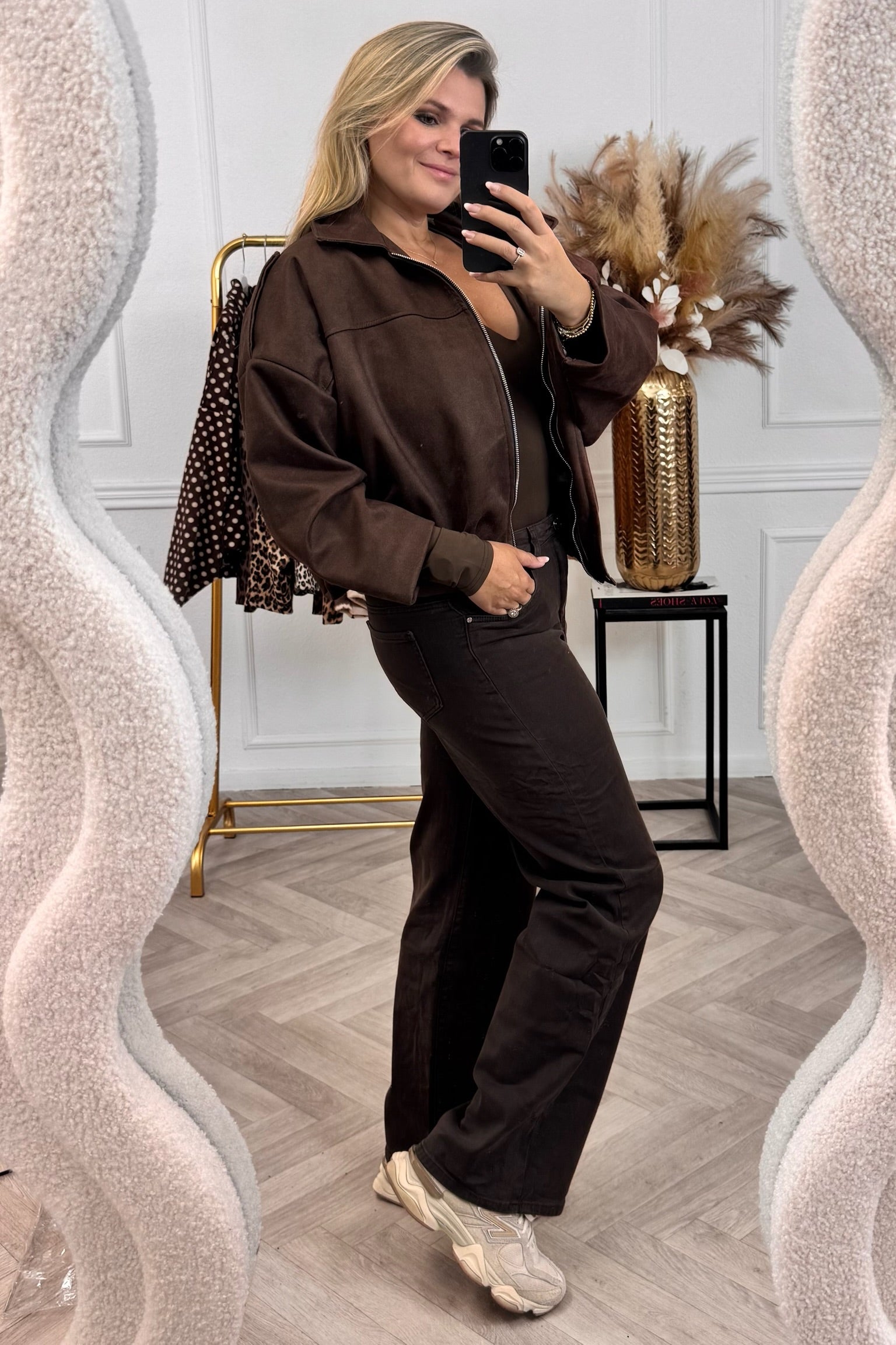 Deze mooie suedine bomber is perfect voor deze tijd van het jaar! Shop hem in dark brown!