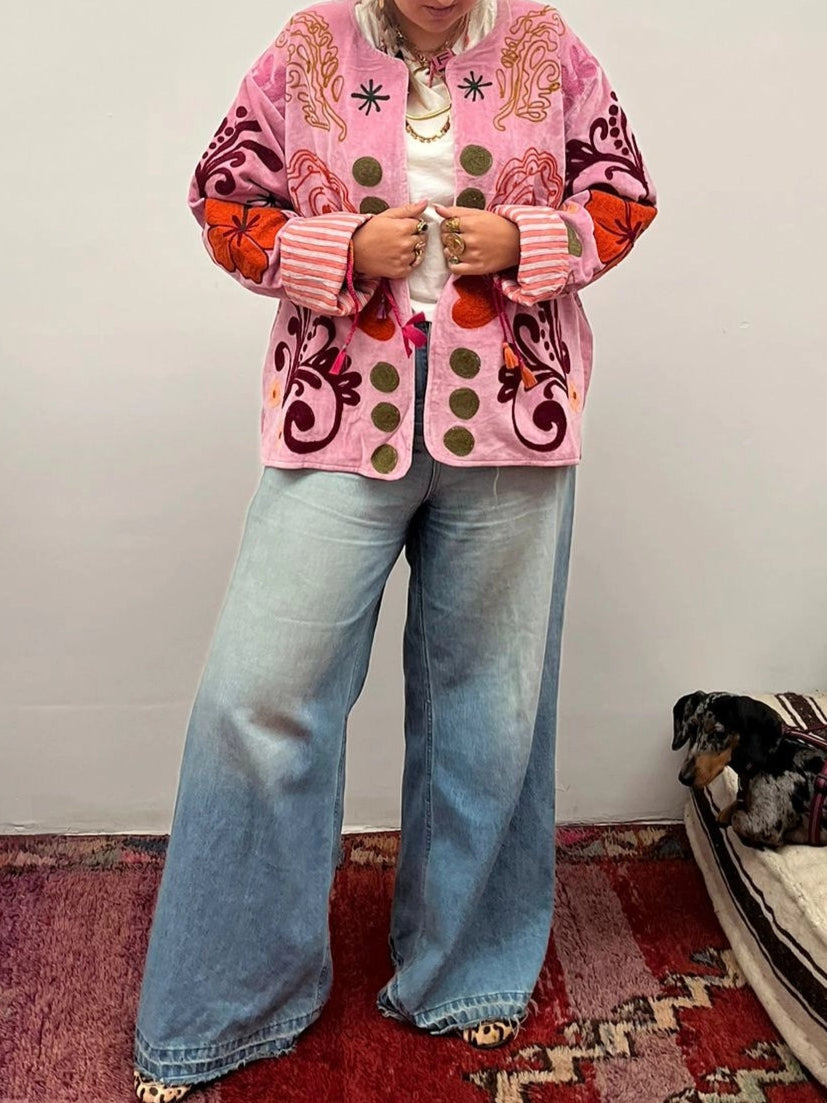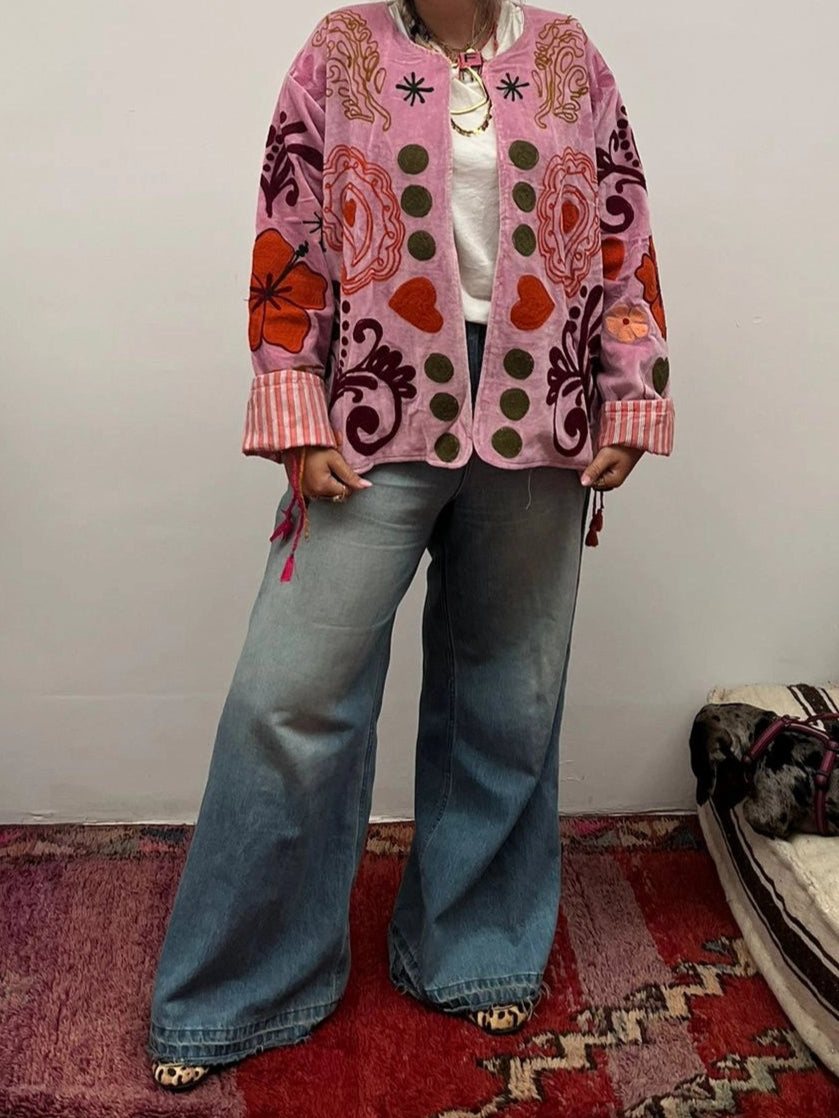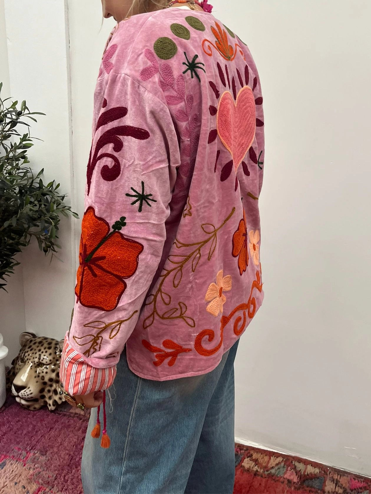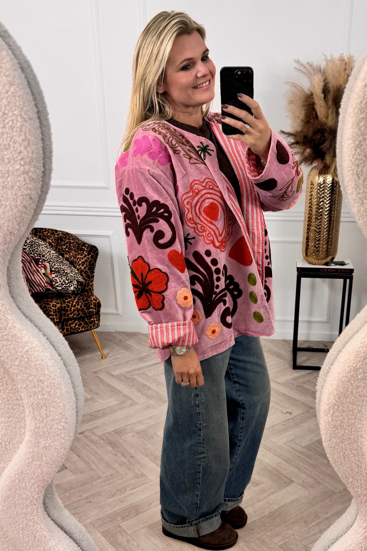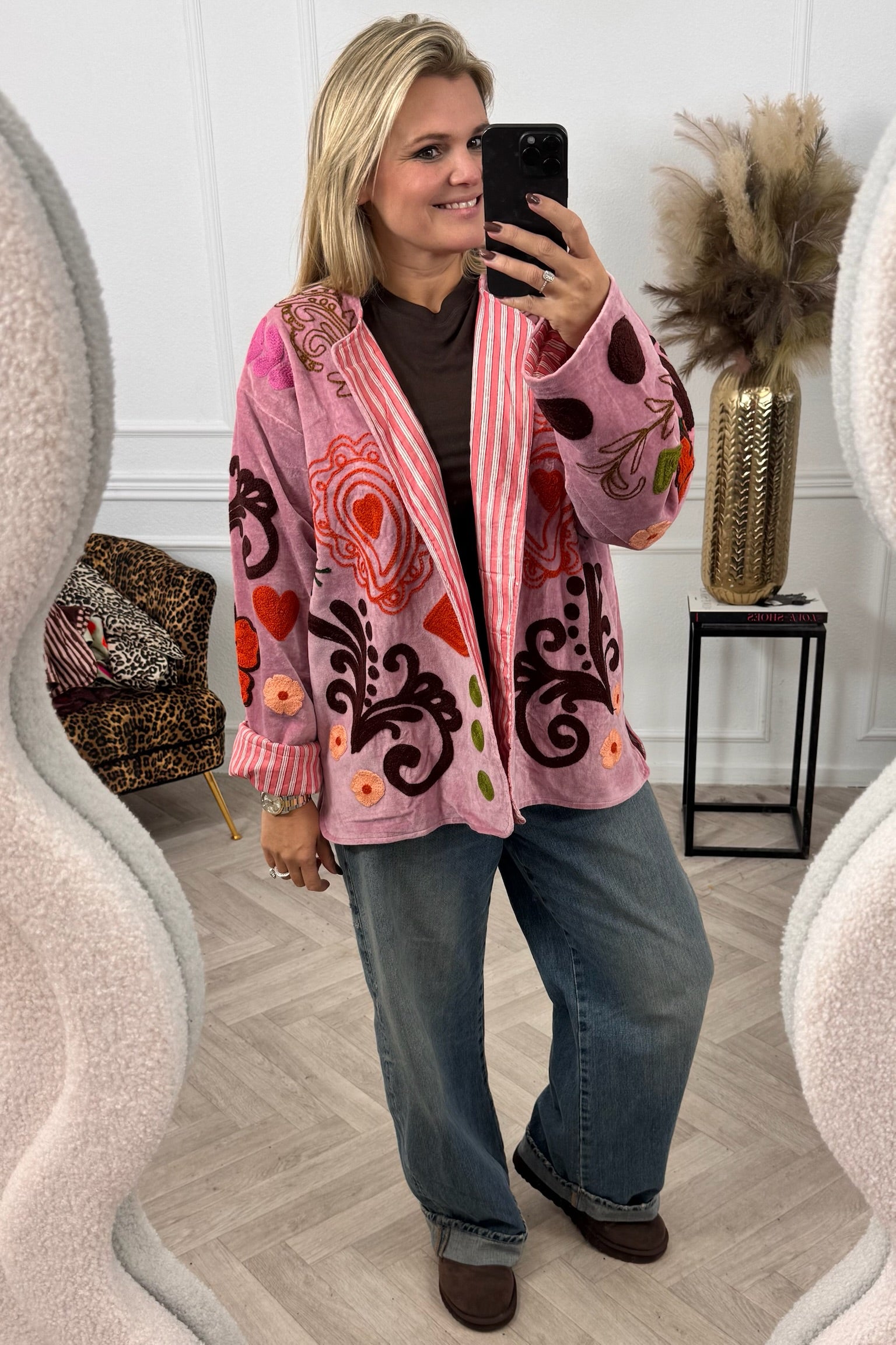 Wauw! Dit fantastische jasje is gemaakt van 100% katoen en valt lekker oversized. Hij heeft een leuke geborduurde print met harten en stippen, shop hem nu in de mooie kleur pink!