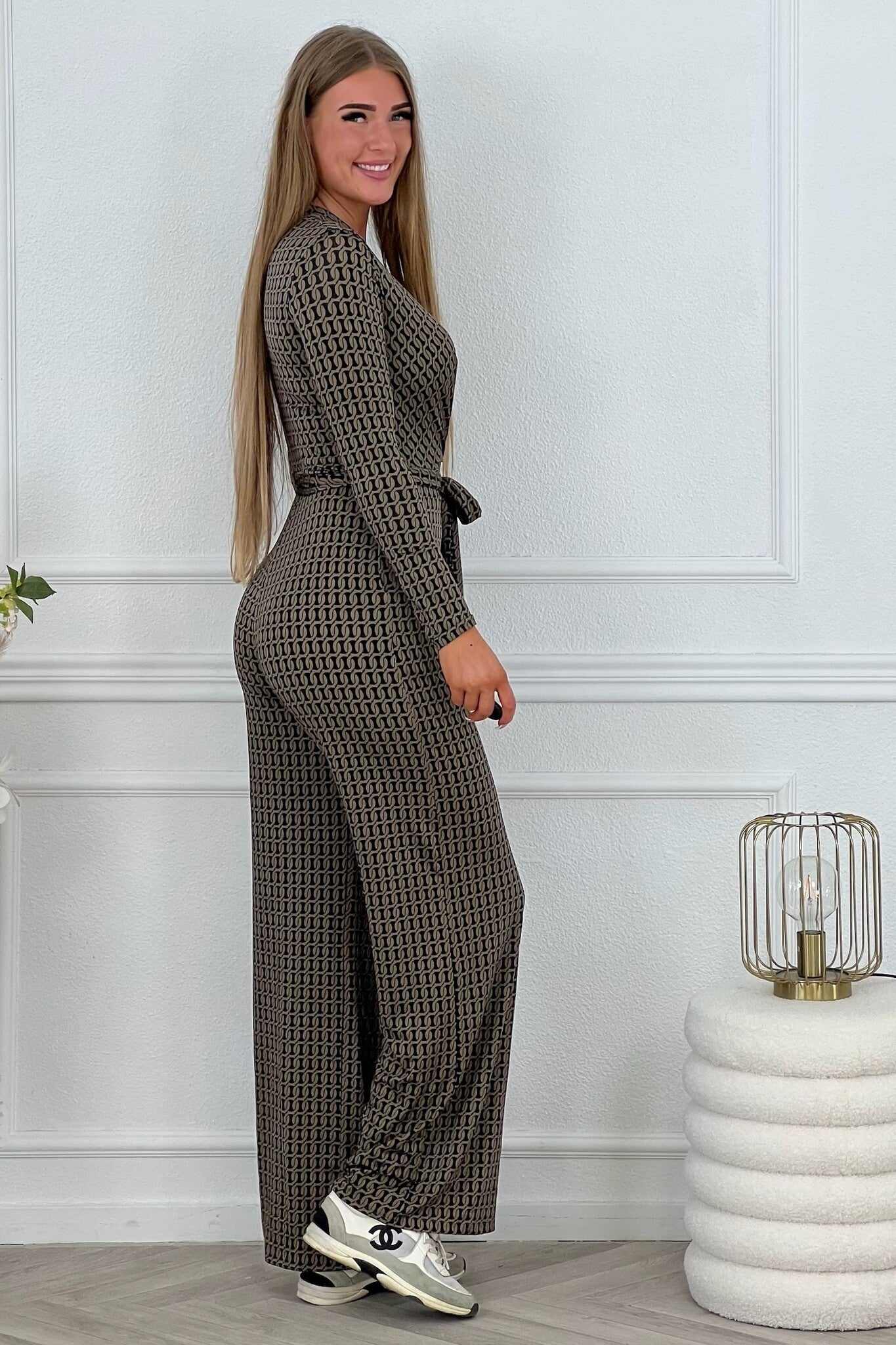 Een mooie jumpsuit met lange mouwen! Verkrijgbaar in verschillende kleuren en printjes! Shop hem met cableprint in black/camel!