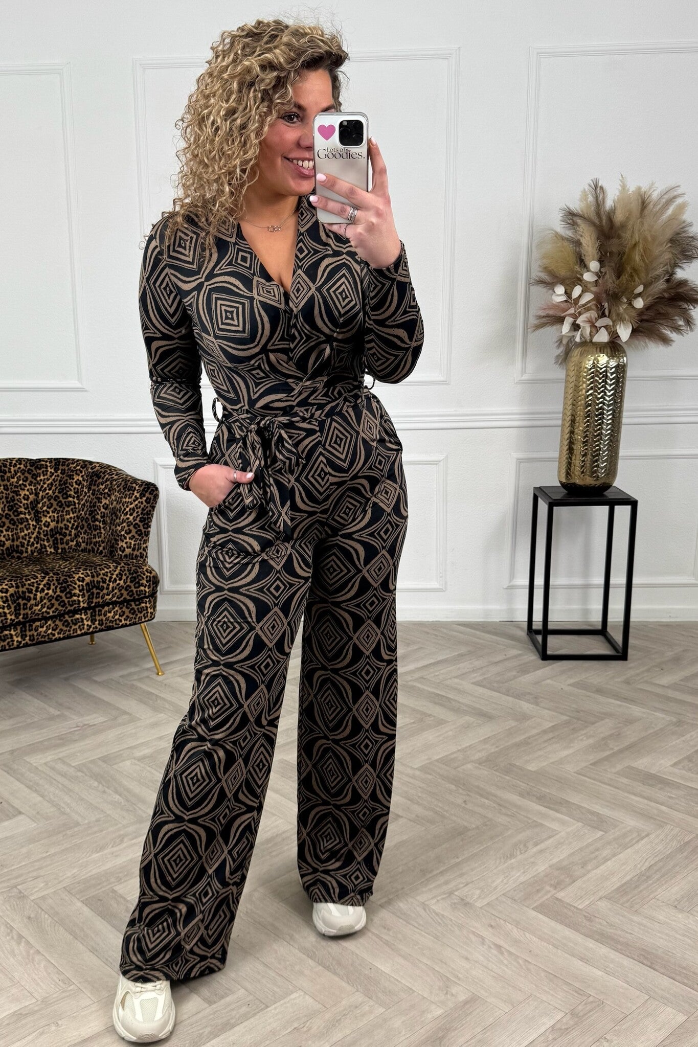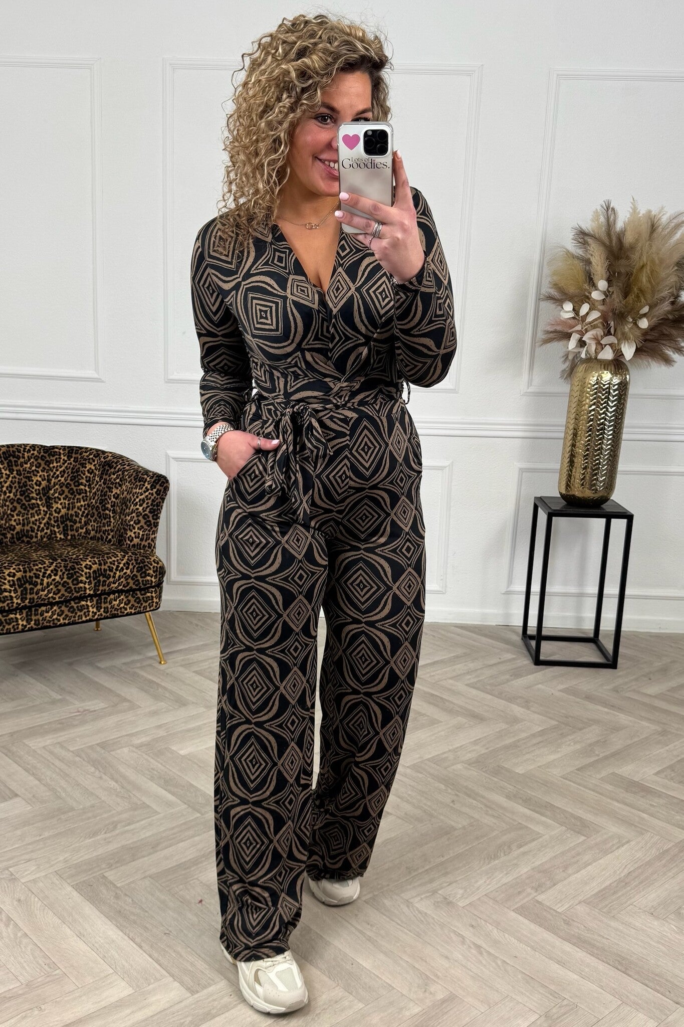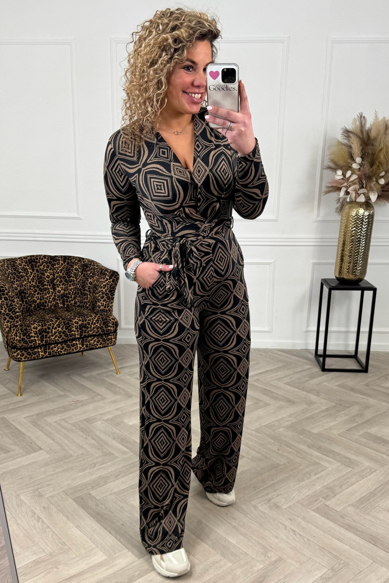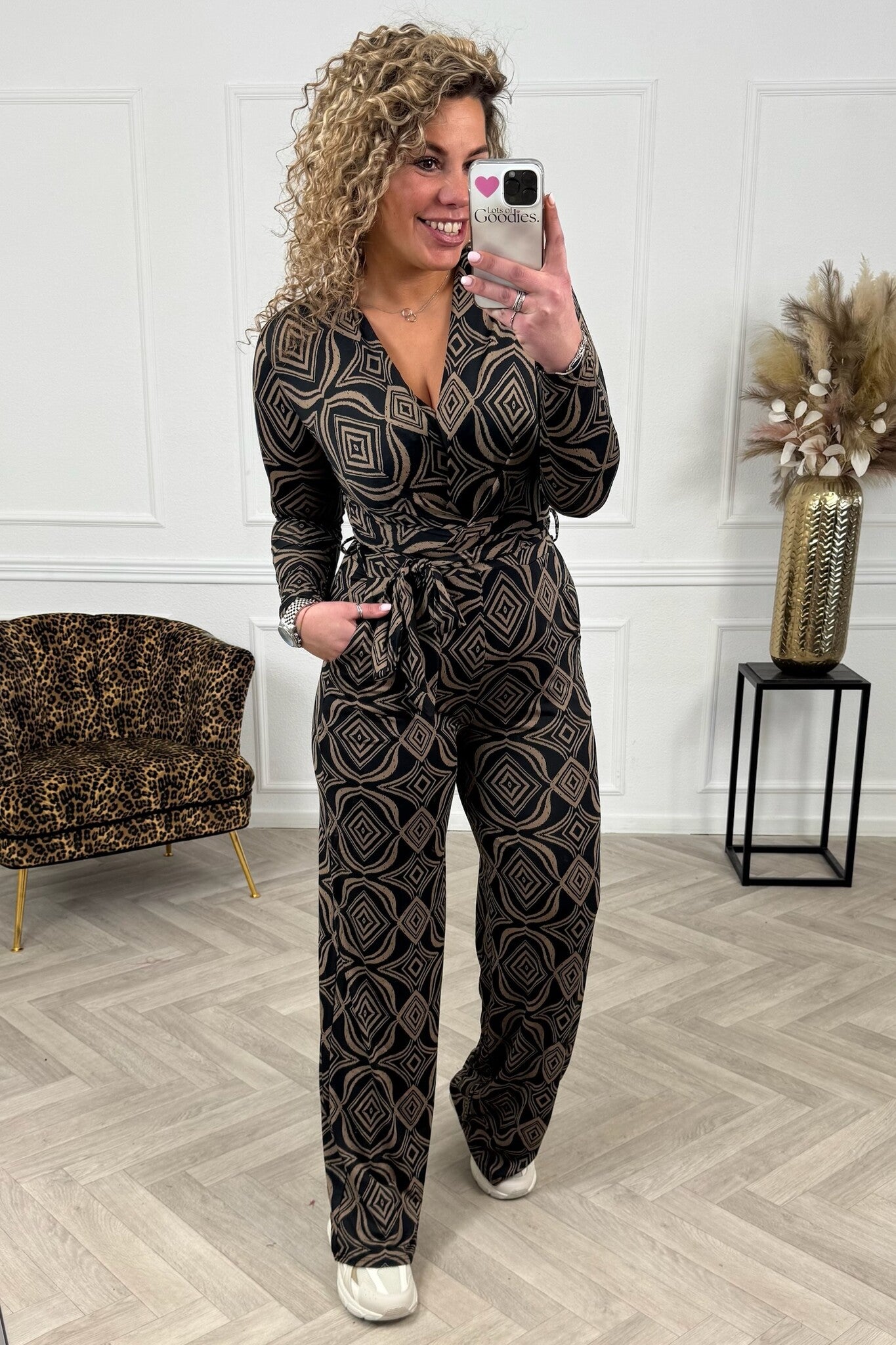 Een mooie jumpsuit met lange mouwen! Verkrijgbaar in verschillende kleuren en printjes! Shop hem met deze mooie diamond taupe!