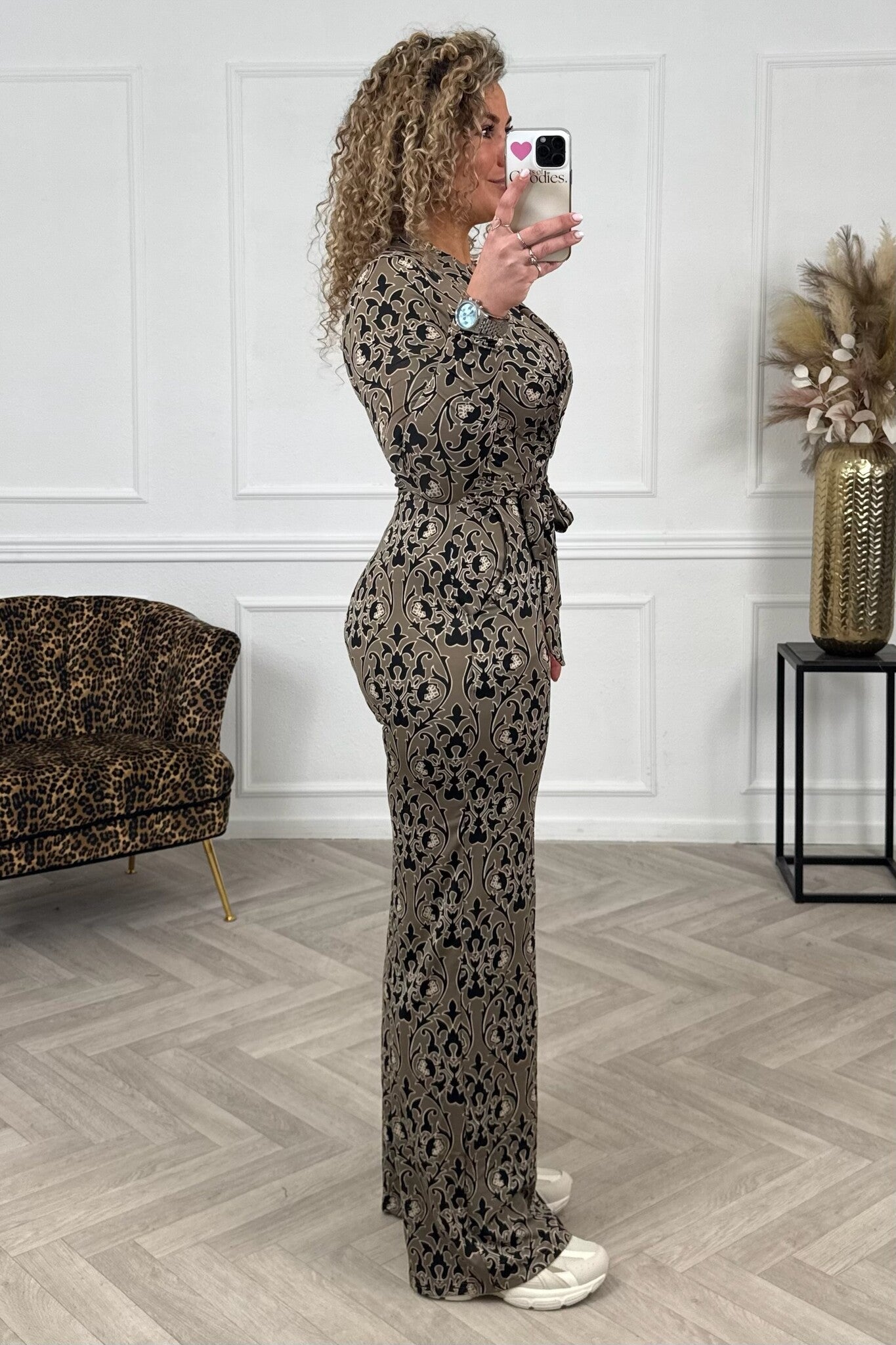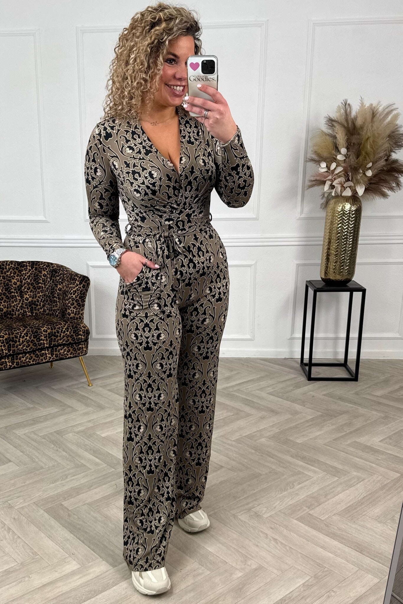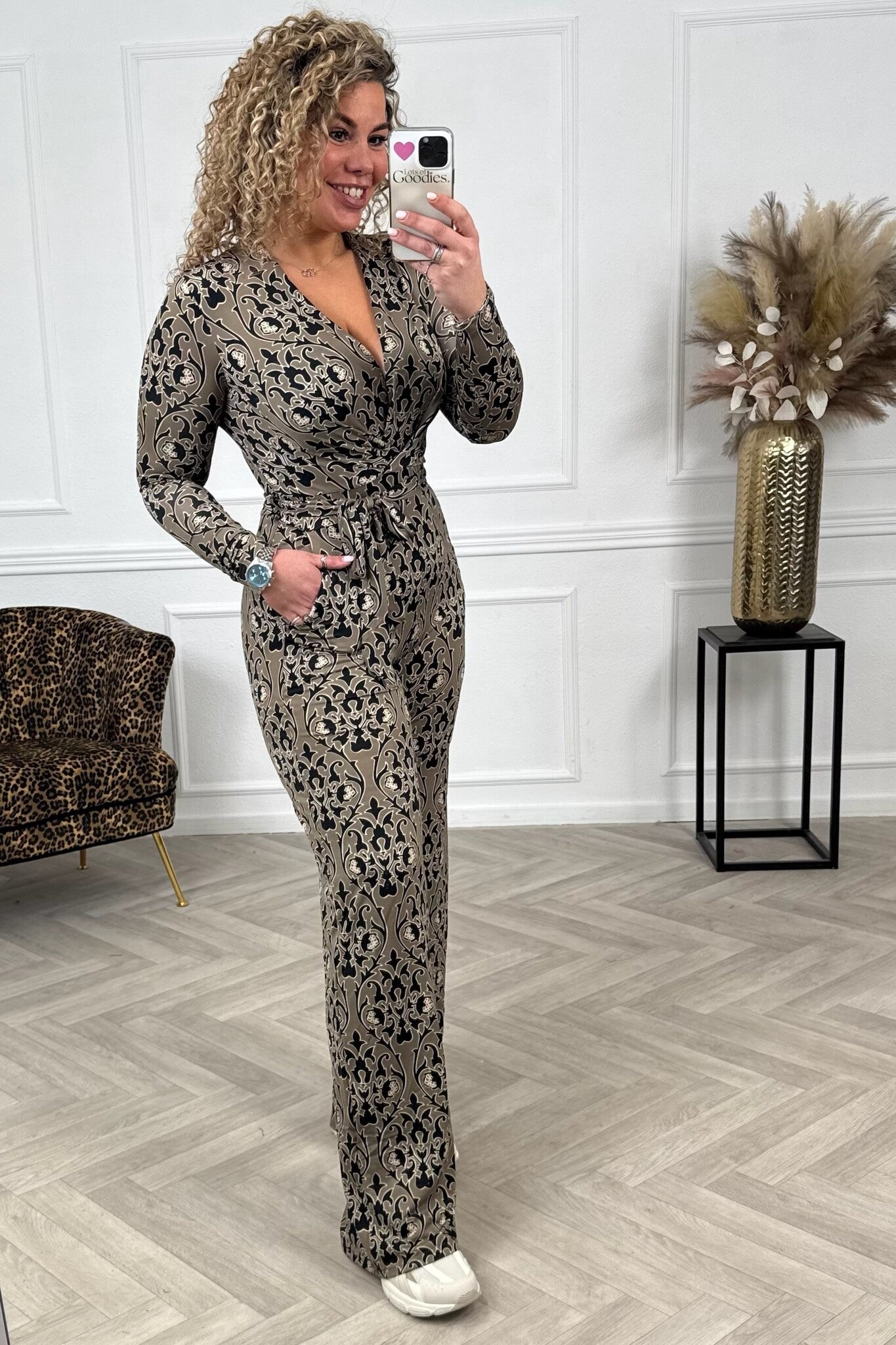 Een mooie jumpsuit met lange mouwen! Verkrijgbaar in verschillende kleuren en printjes! Shop hem met mooie V triangle print in camel!