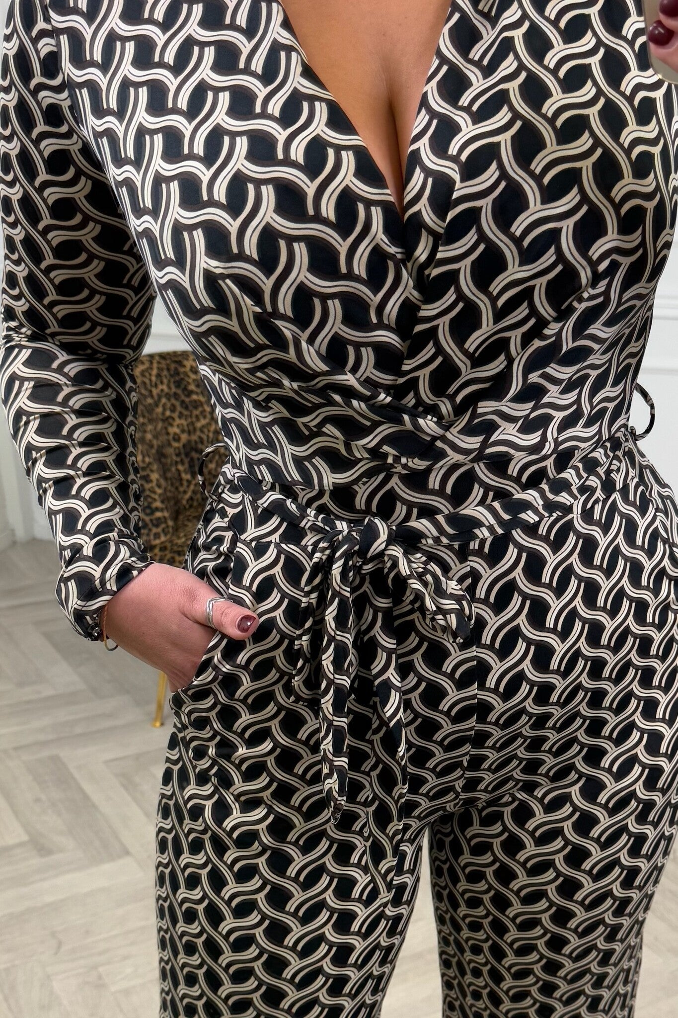Long Sleeve Swirl Jumpsuit - Beige/Black