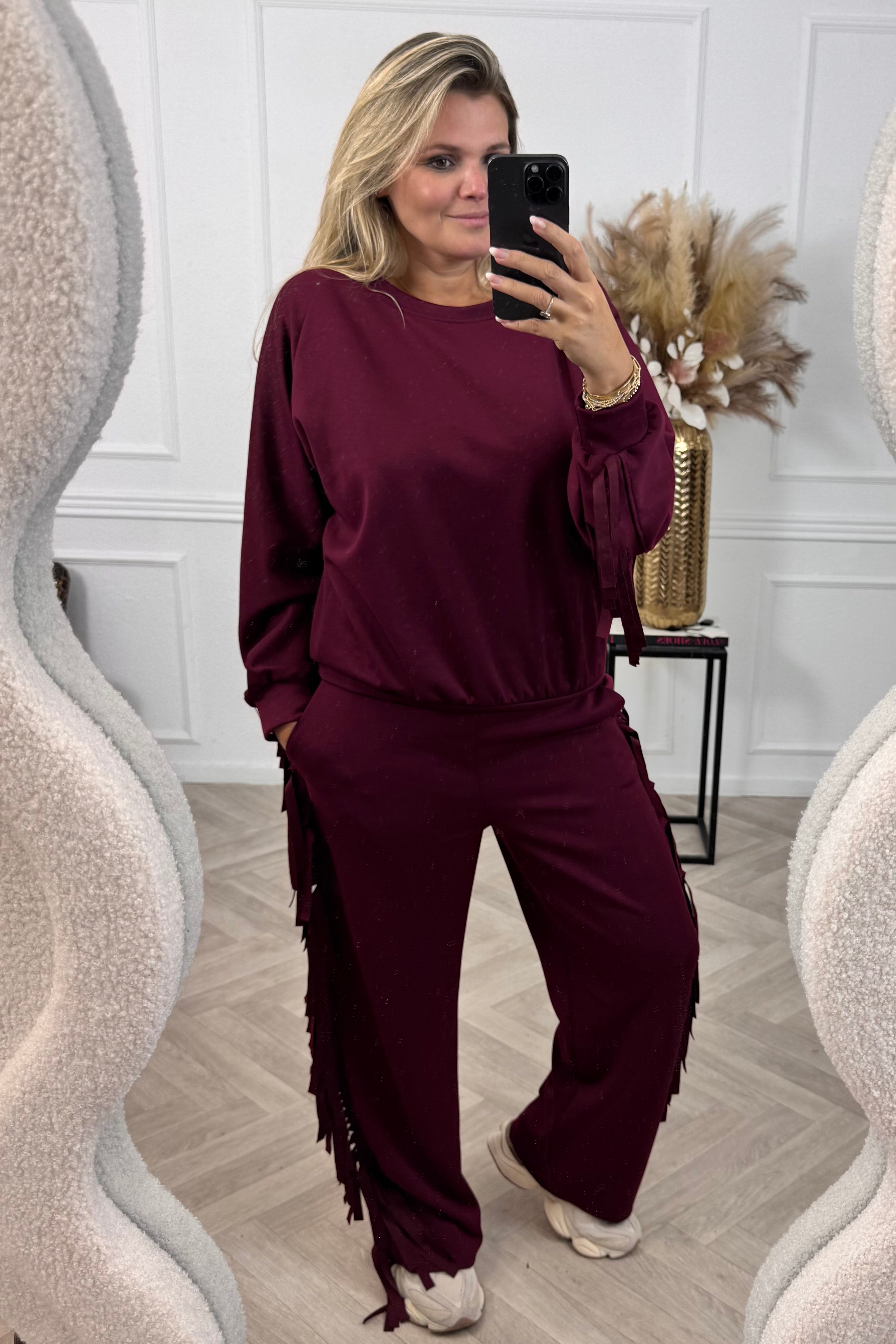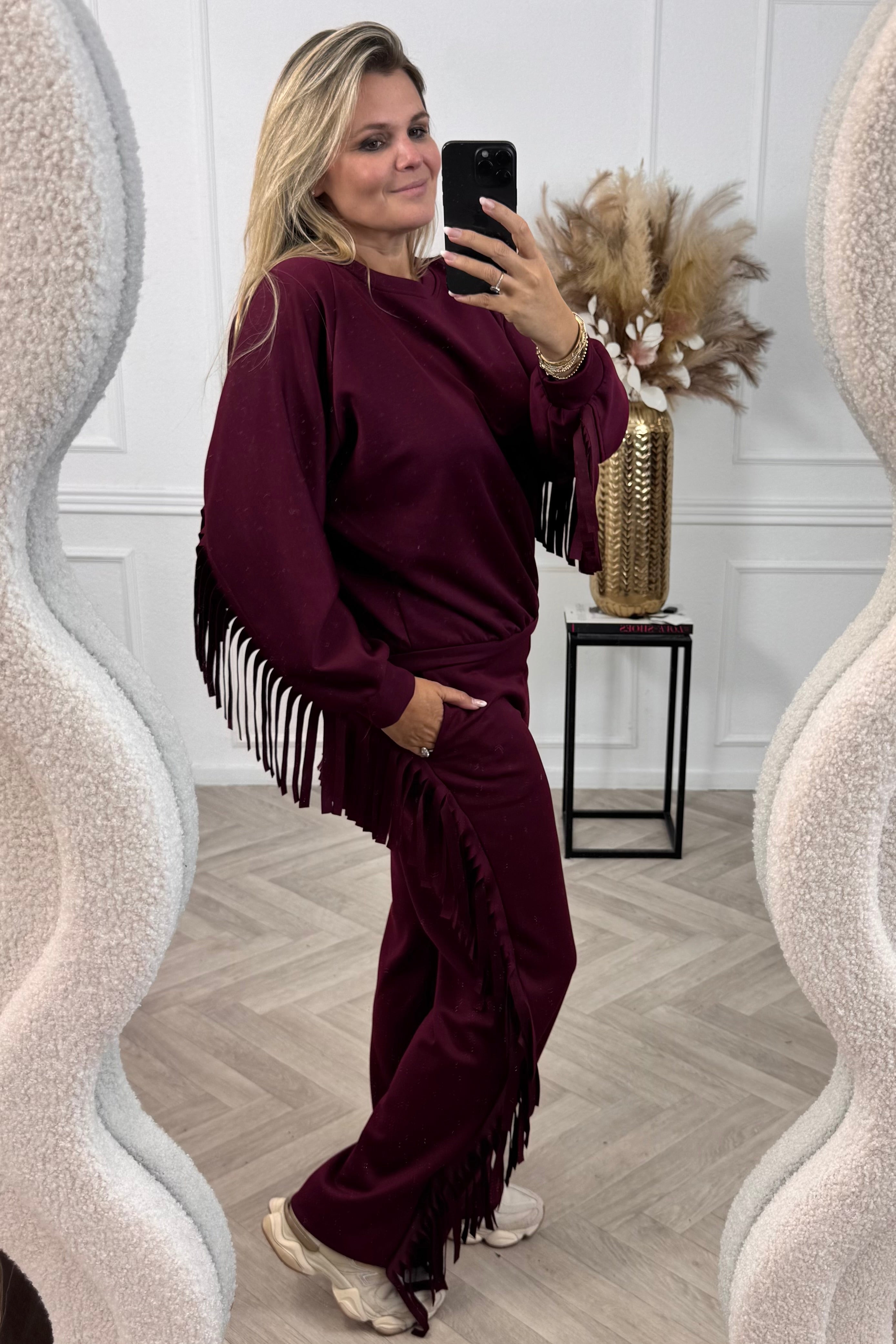 Deze heerlijke fringe set bestaat uit een sweater en pants, beide met leuke fringes! Shop de set in trendy bordeaux!