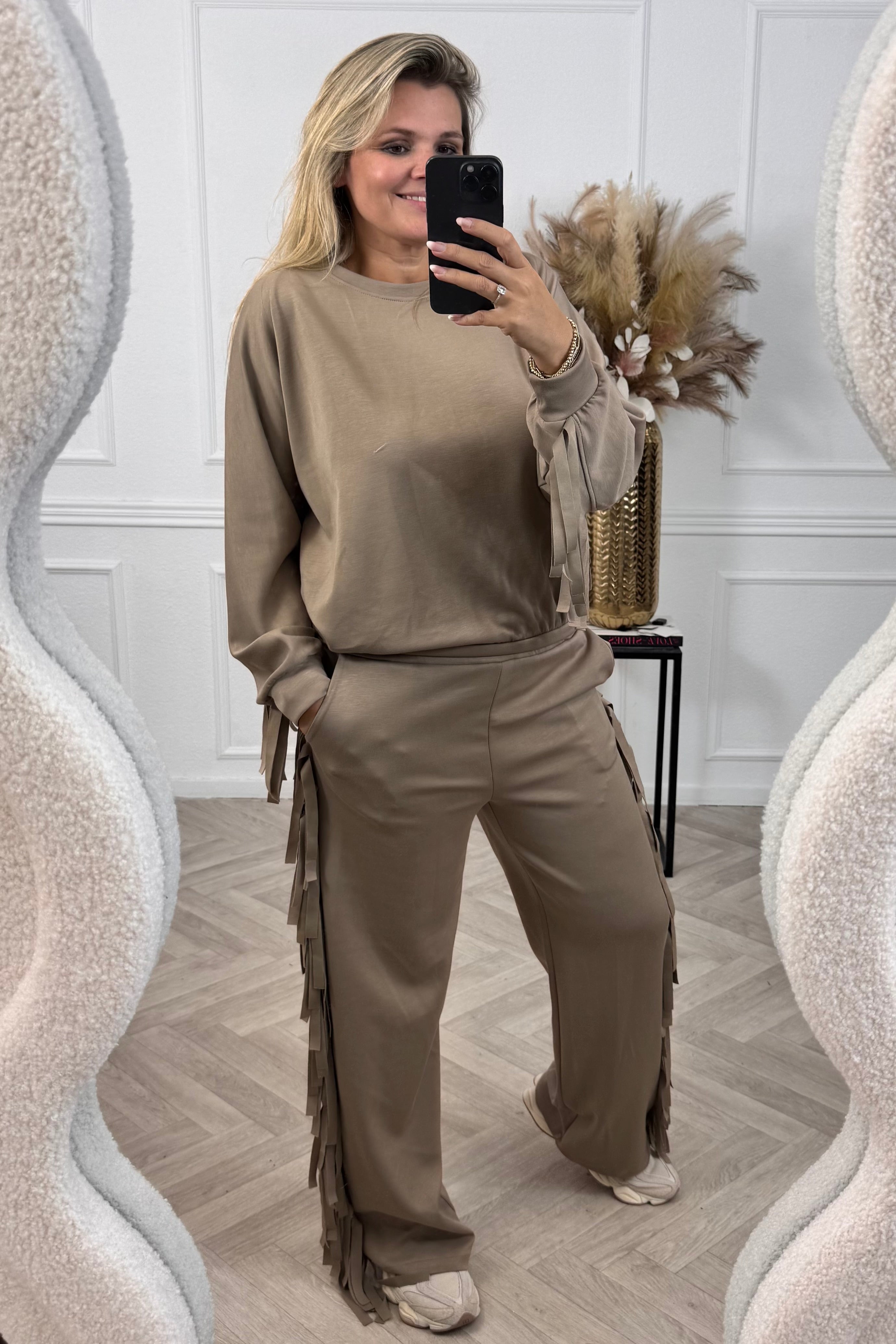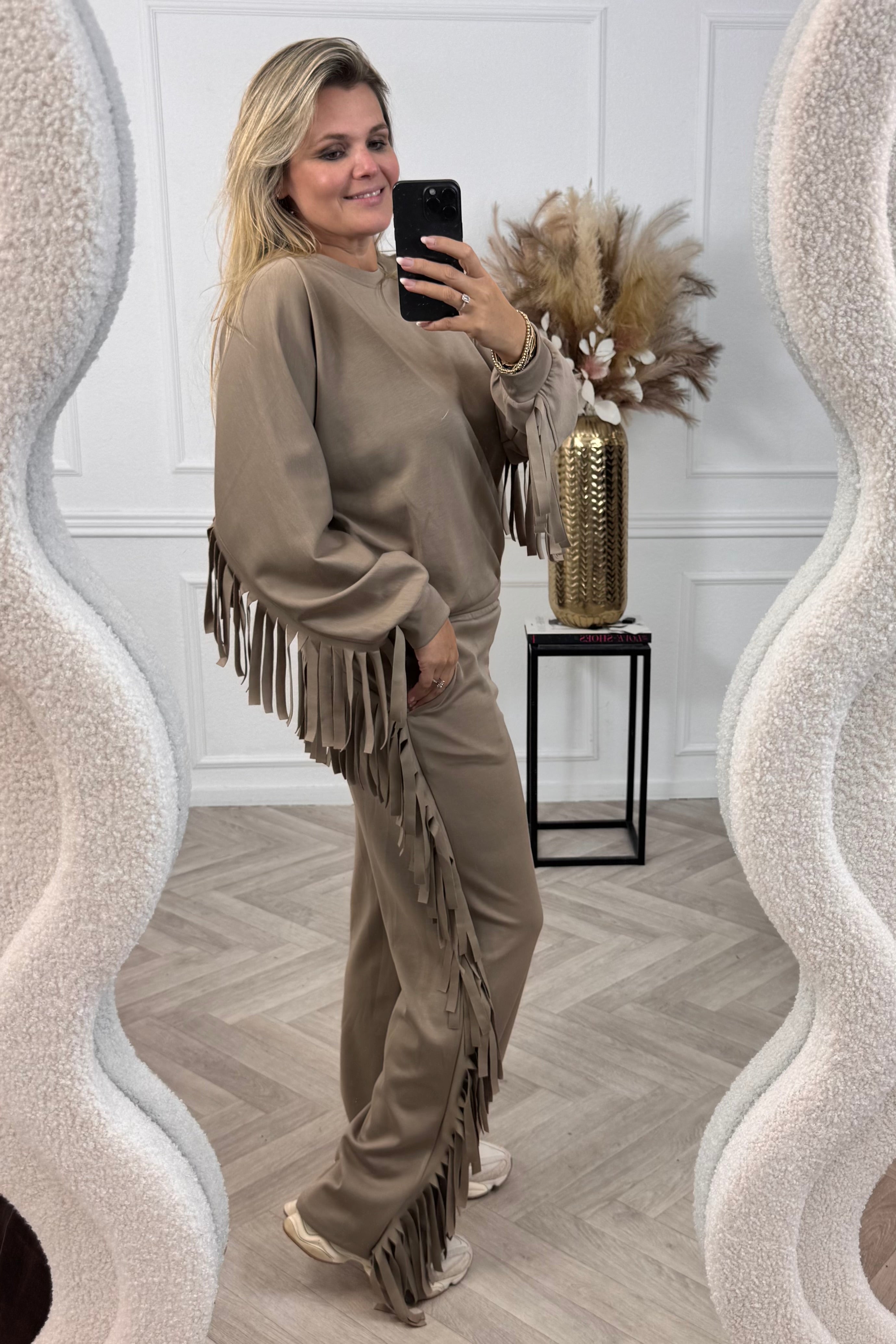 Deze heerlijke fringe set bestaat uit een sweater en pants, beide met leuke fringes! Shop de set in trendy taupe!