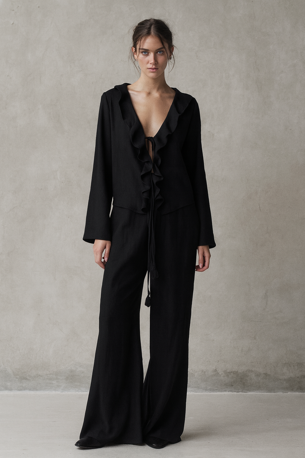 Hoe leuk is deze herfstige set met ruffels en wijde broek. Shop hem nu in black!
