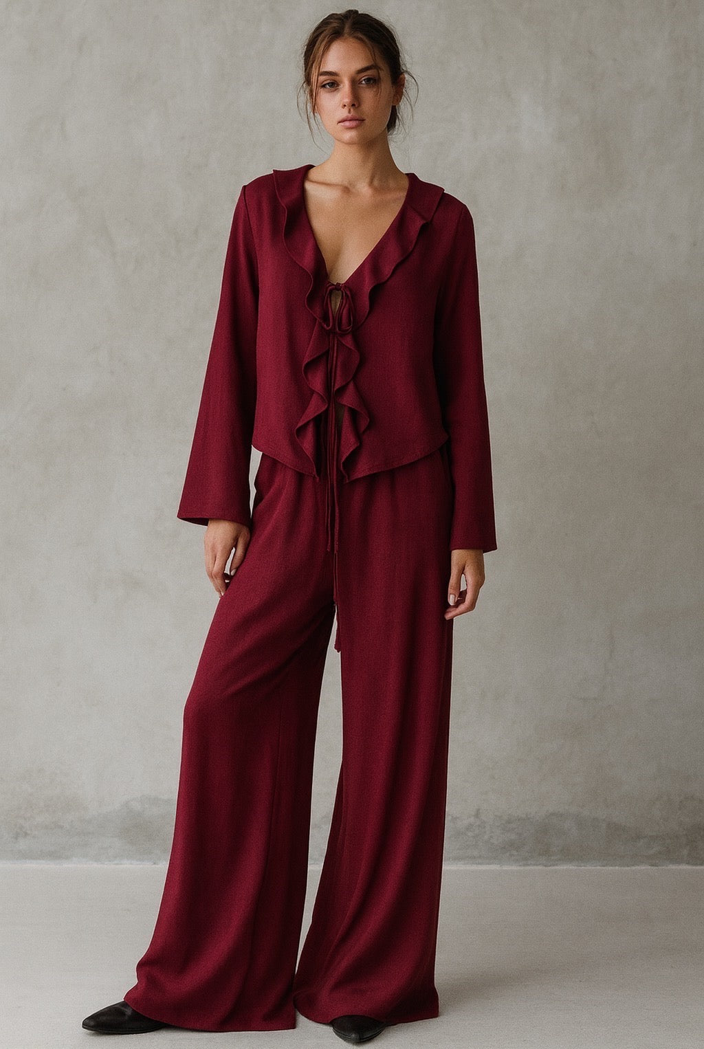 Hoe leuk is deze herfstige set met ruffels en wijde broek. Shop hem nu in bordeaux!!