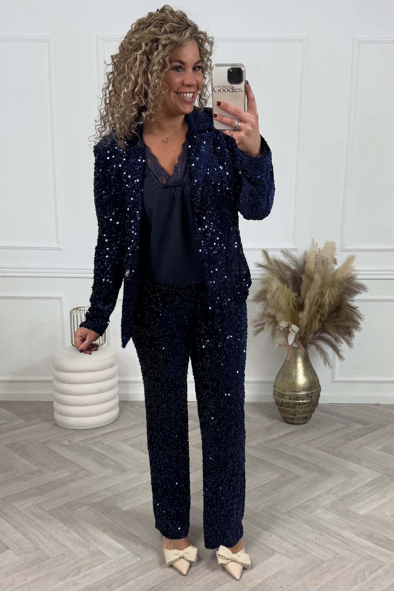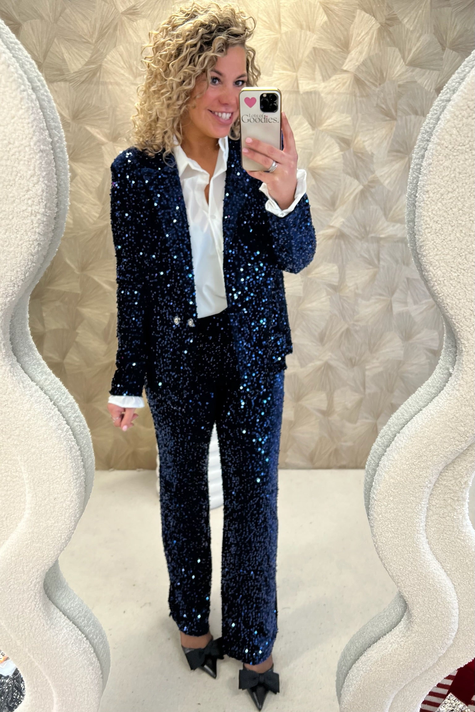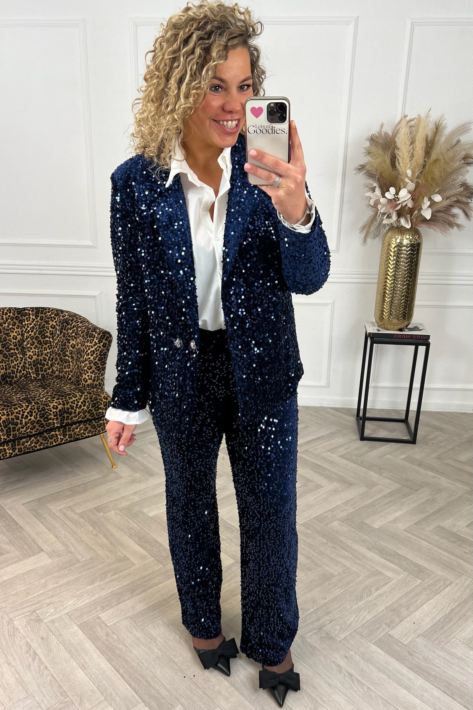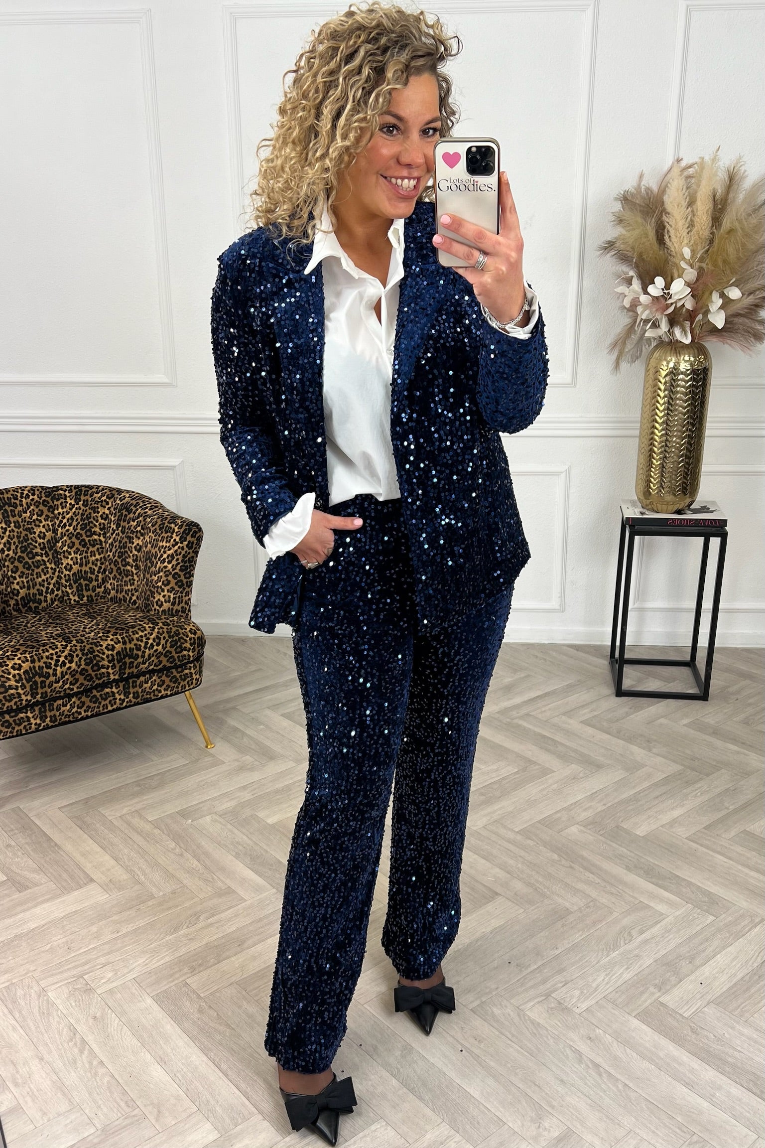 Deze set met blazer en broek is het ultieme partysuit. De blazer is gevoerd en ze zijn beide uitgevoerd met pailletten. Shop hem in blue!