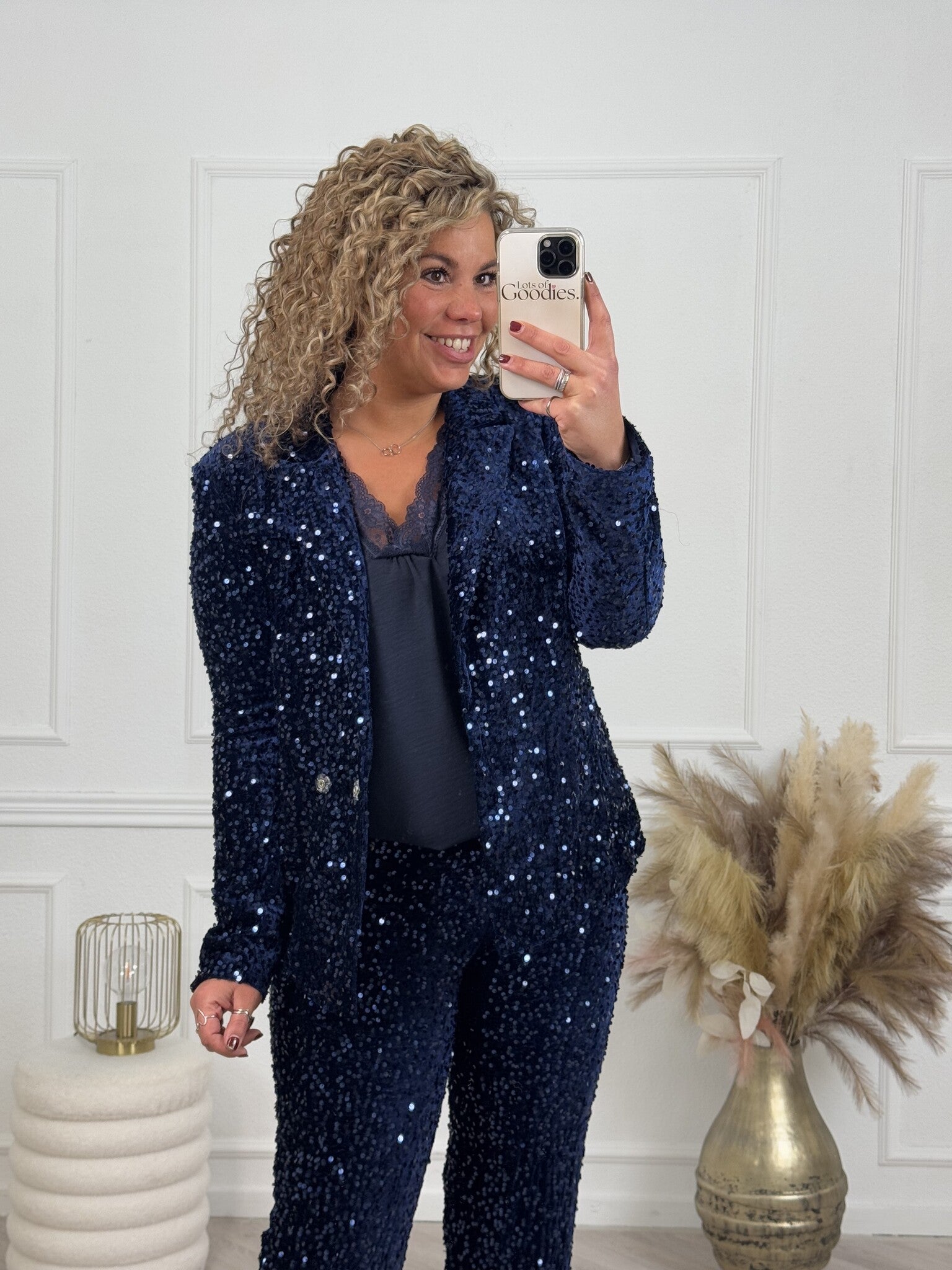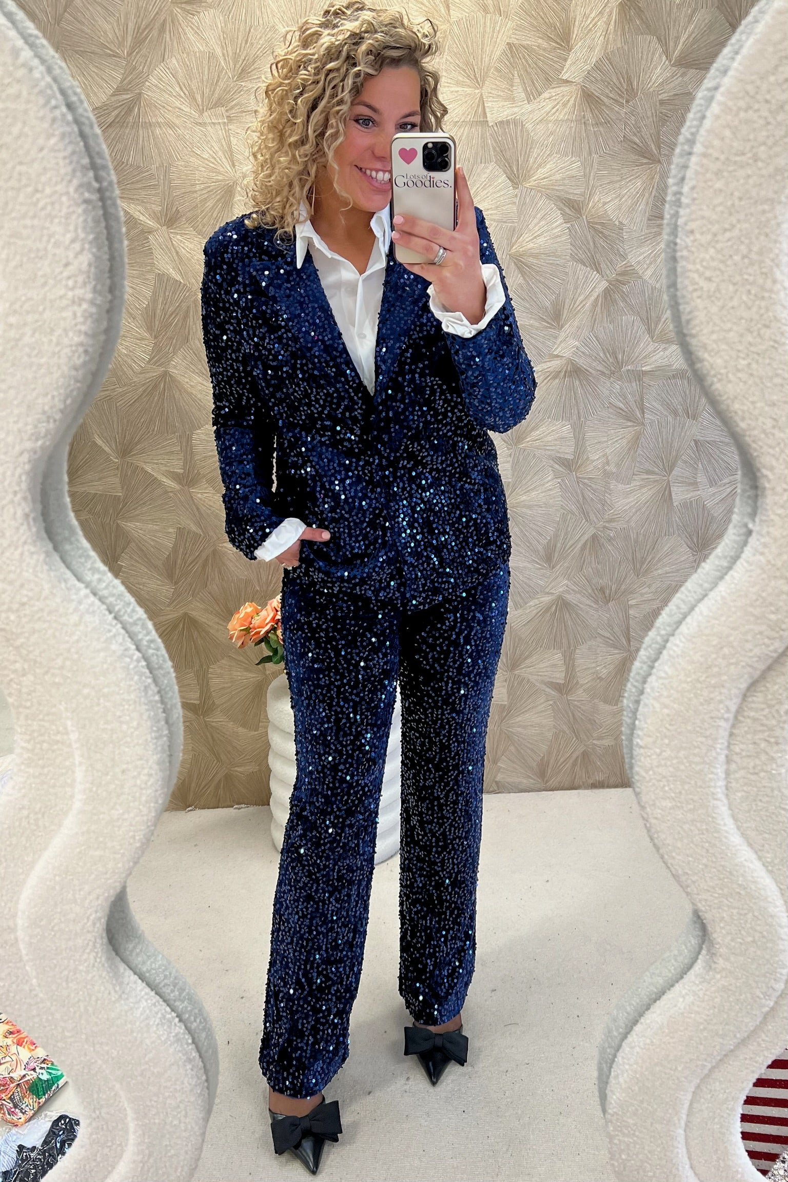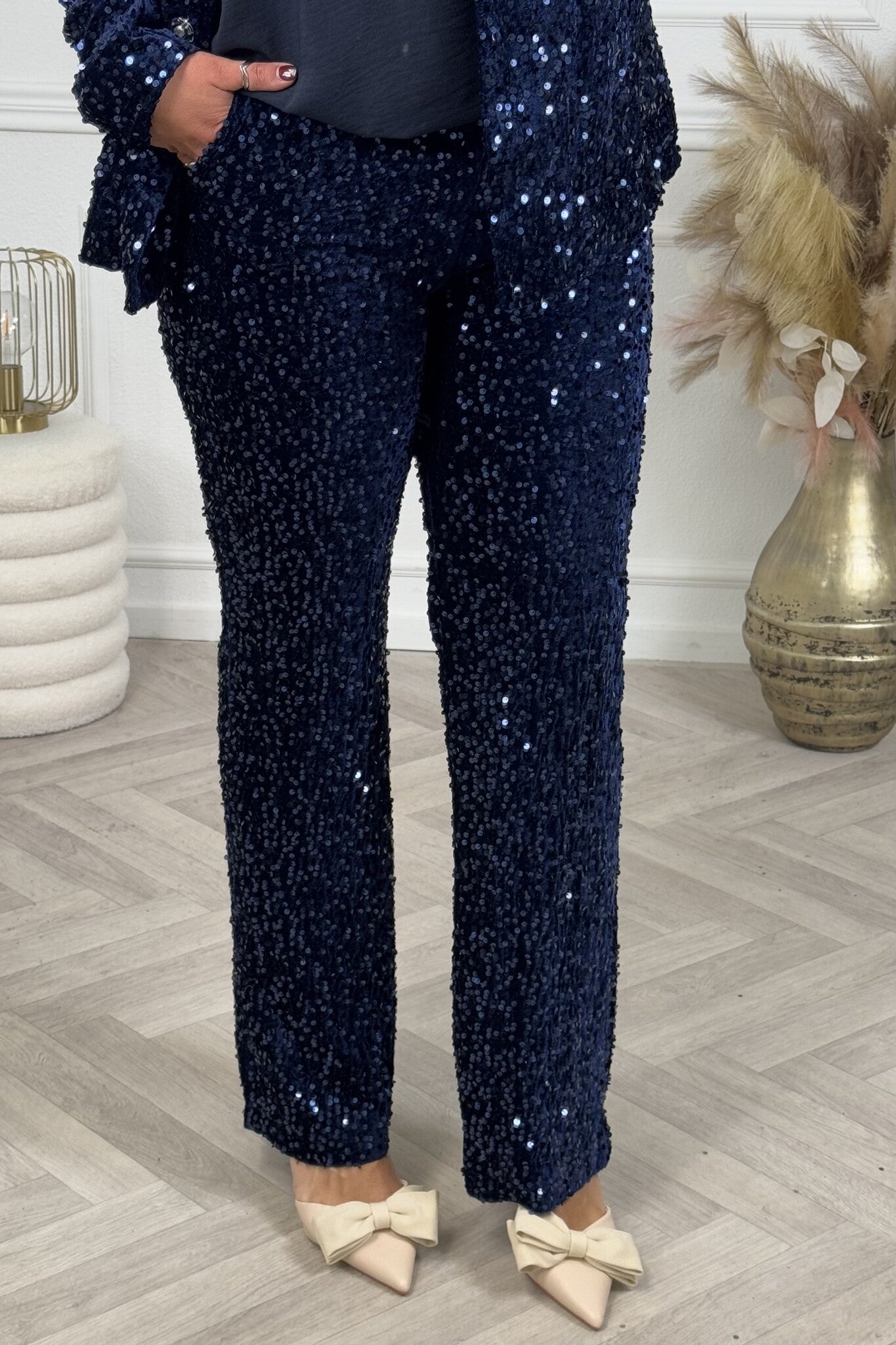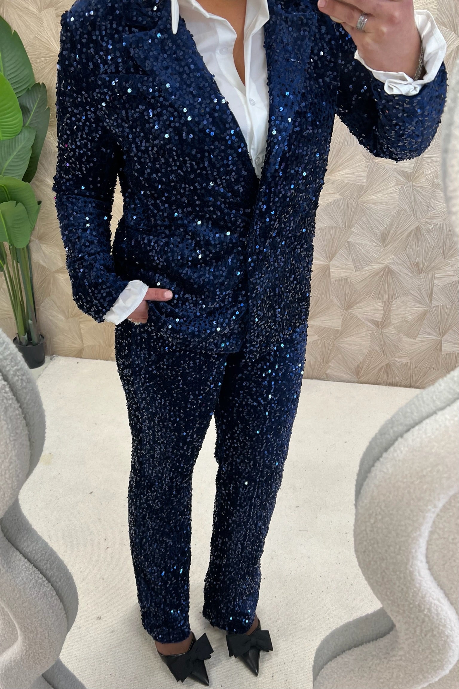 Deze set met blazer en broek is het ultieme partysuit. De blazer is gevoerd en ze zijn beide uitgevoerd met pailletten. Shop hem in blue!