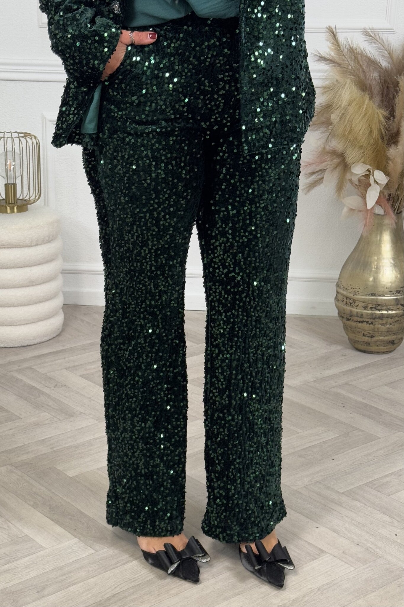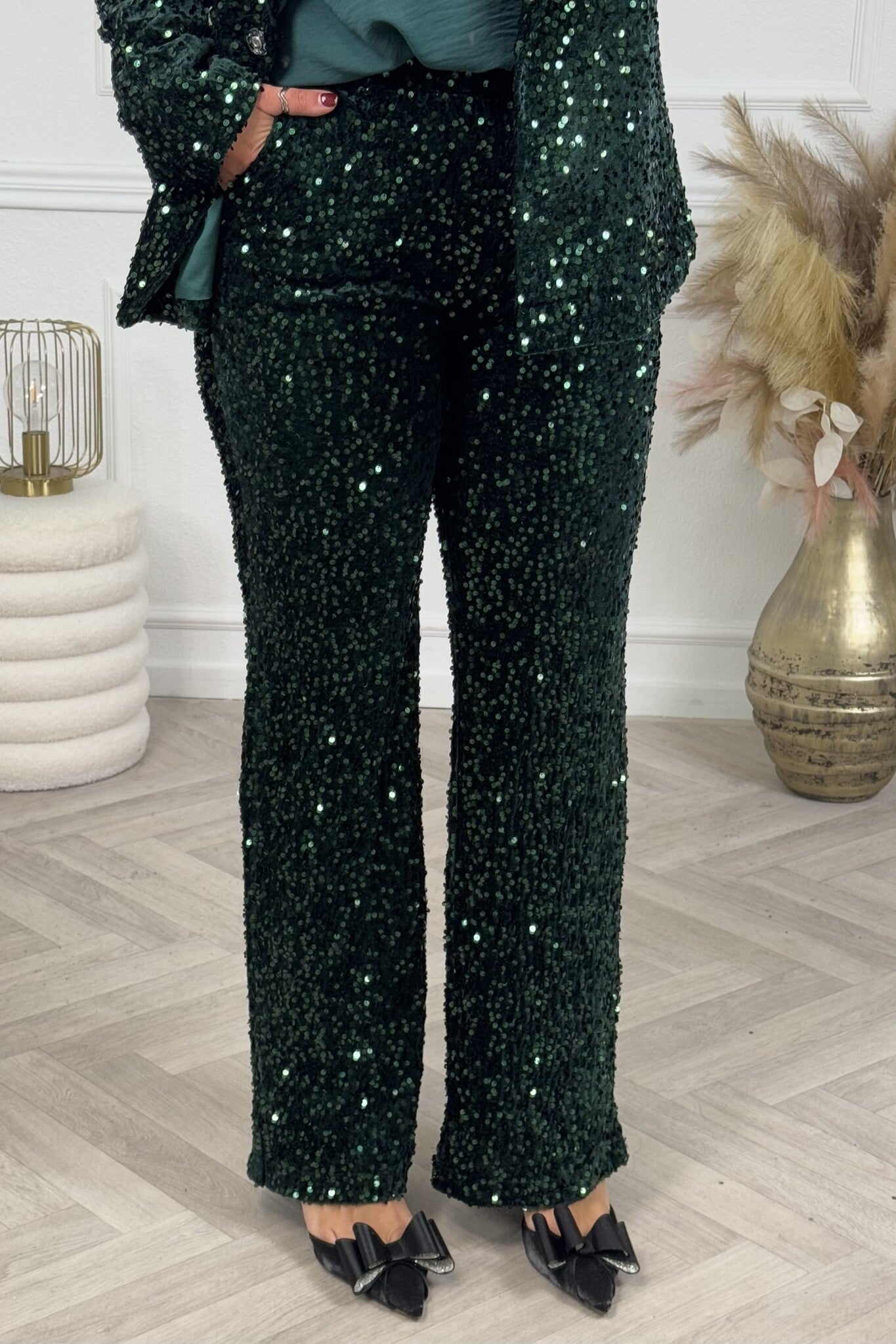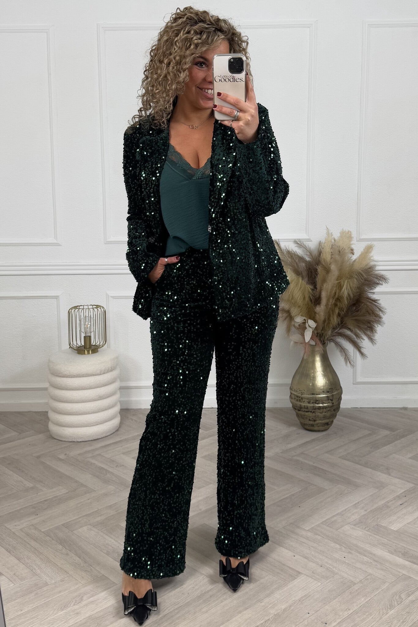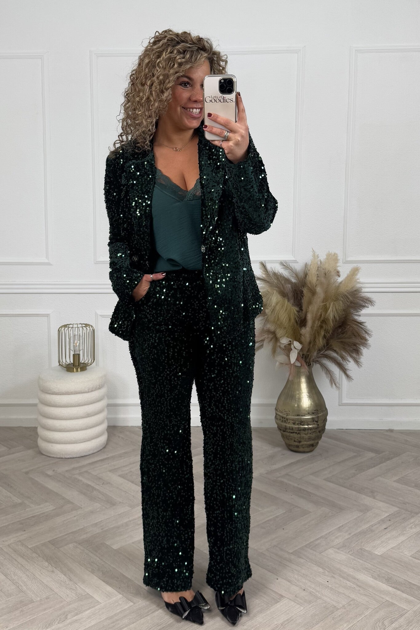 Deze set met blazer en broek is het ultieme partysuit. De blazer is gevoerd en ze zijn beide uitgevoerd met pailletten. Shop hem in green!