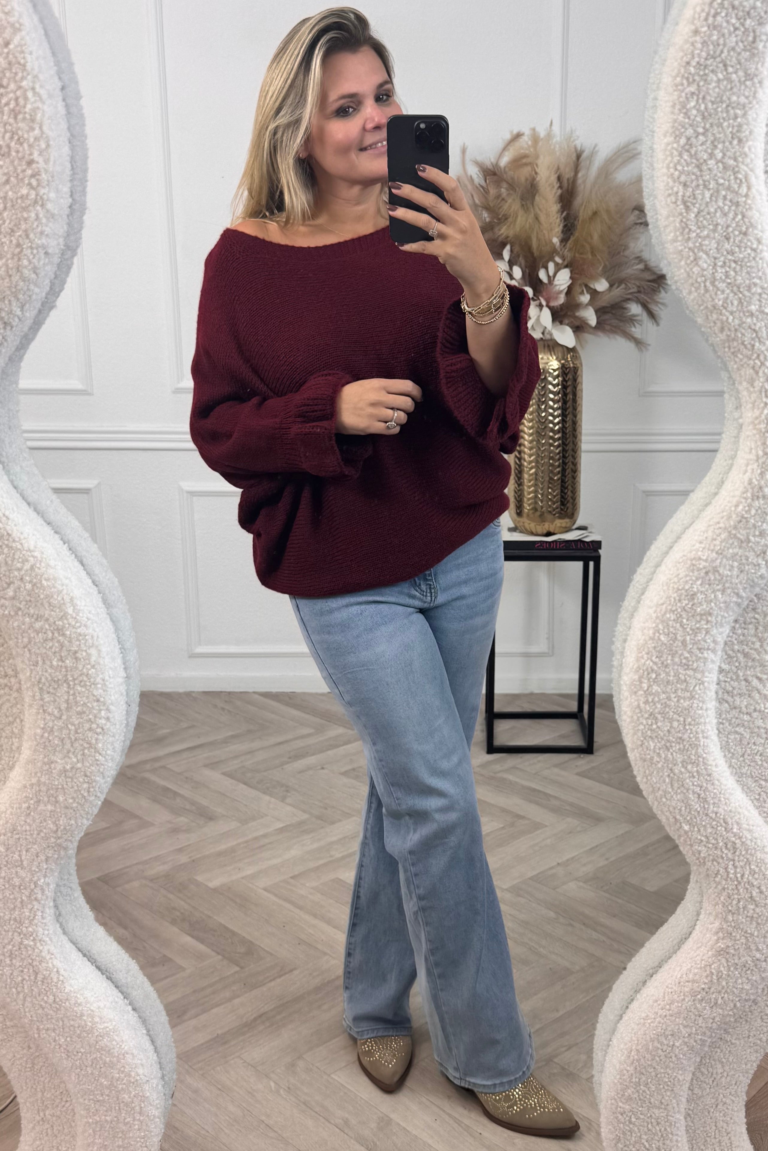 Een heerlijke trui voor de koude dagen! De trui heeft een klein open rug detail, dit is te zien bij de foto's van de trui in brown! Ook heeft hij leuke uitlopende mouwen met een asymmetrische look! Shop de bat sleeve ruffle sweater nu in bordeaux!