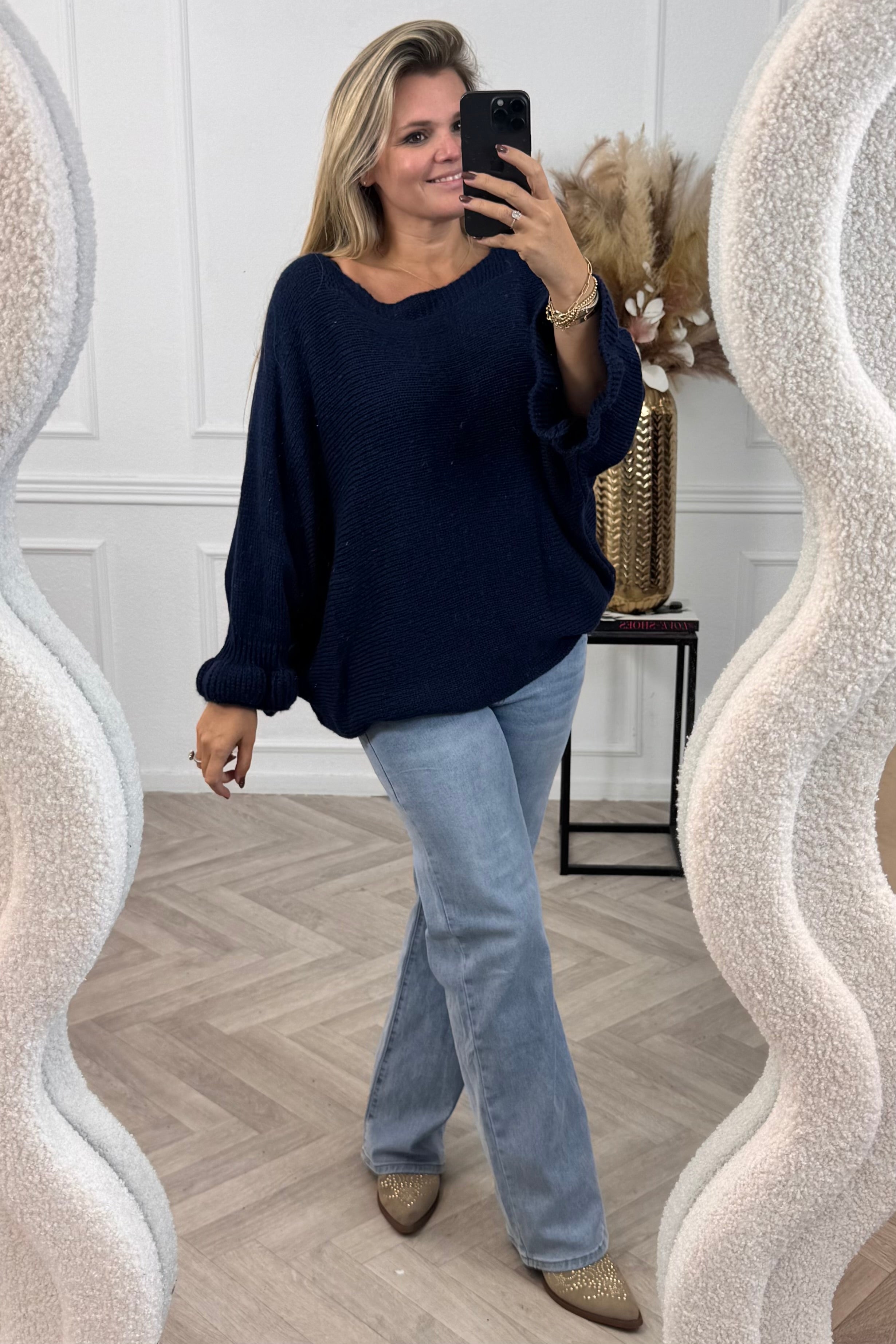 Een heerlijke trui voor de koude dagen! De trui heeft een klein open rug detail, dit is te zien bij de foto's van de trui in brown! Ook heeft hij leuke uitlopende mouwen met een asymmetrische look! Shop de bat sleeve ruffle sweater nu in navy!