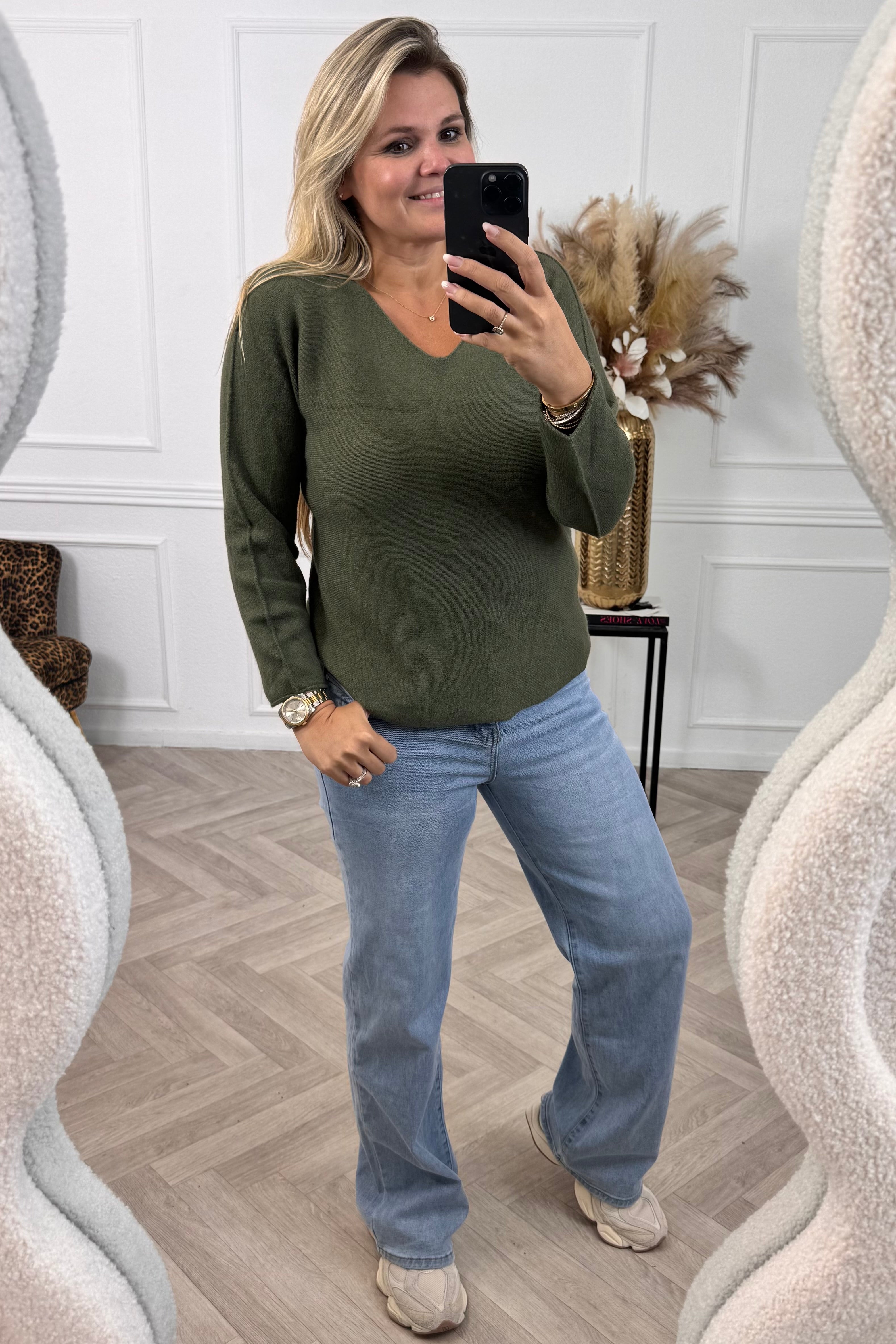 De perfecte basic sweater, en ook nog eens met een V hals! Shop hem nu in het armygreen!