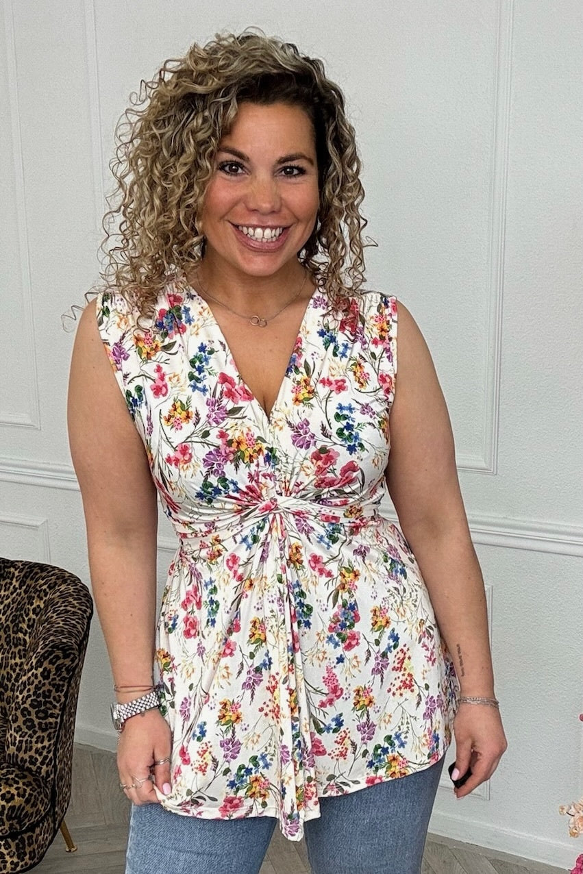 Curvy Knotted Sleeveless Small Flower Top - White