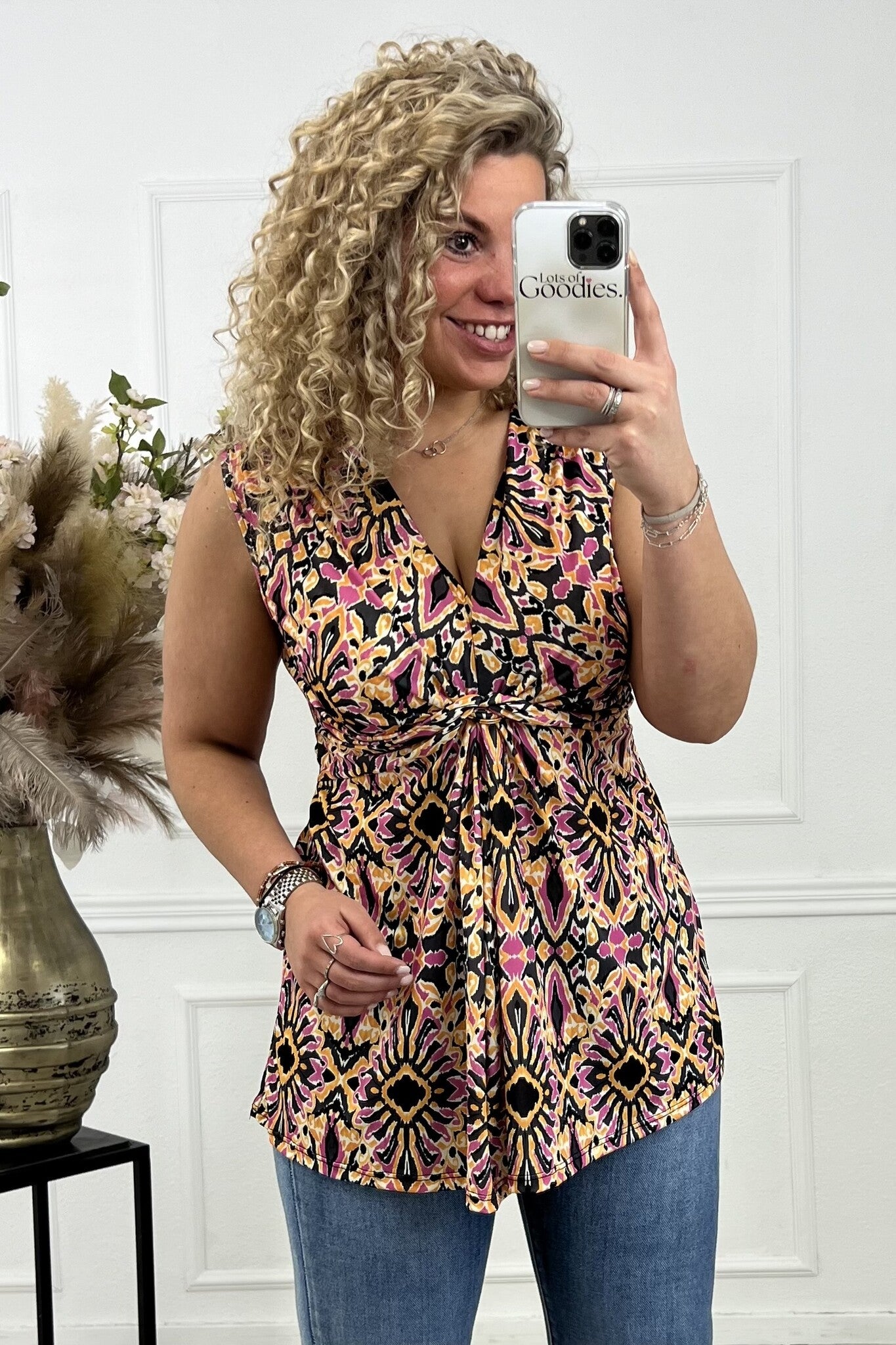 Curvy Knotted Sleeveless Print Top - Orange