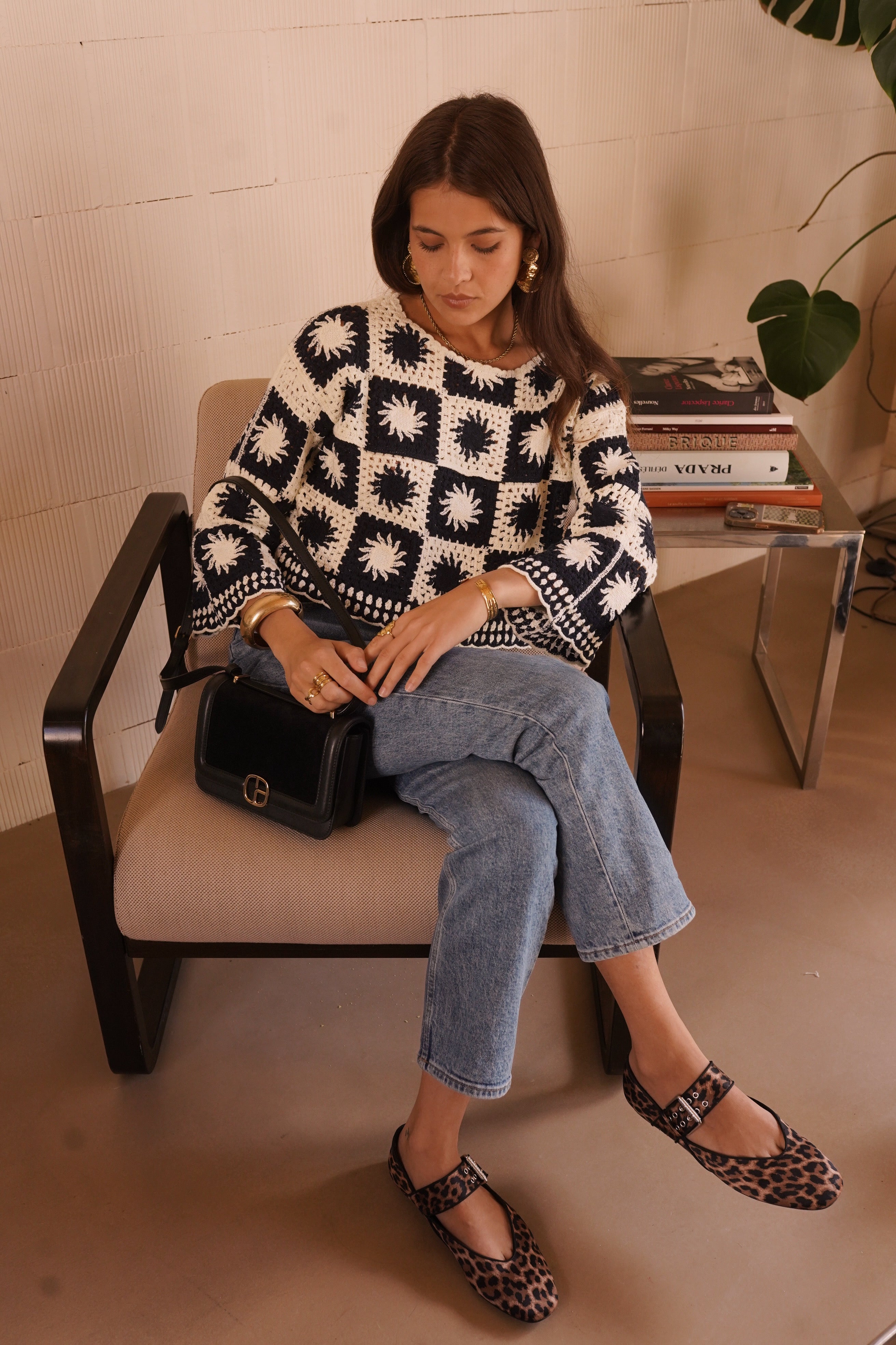 Deze fantastische crochet top met lange mouwen heeft een superleuke zonnetjes print, so cute! Shop hem nu in black/white.