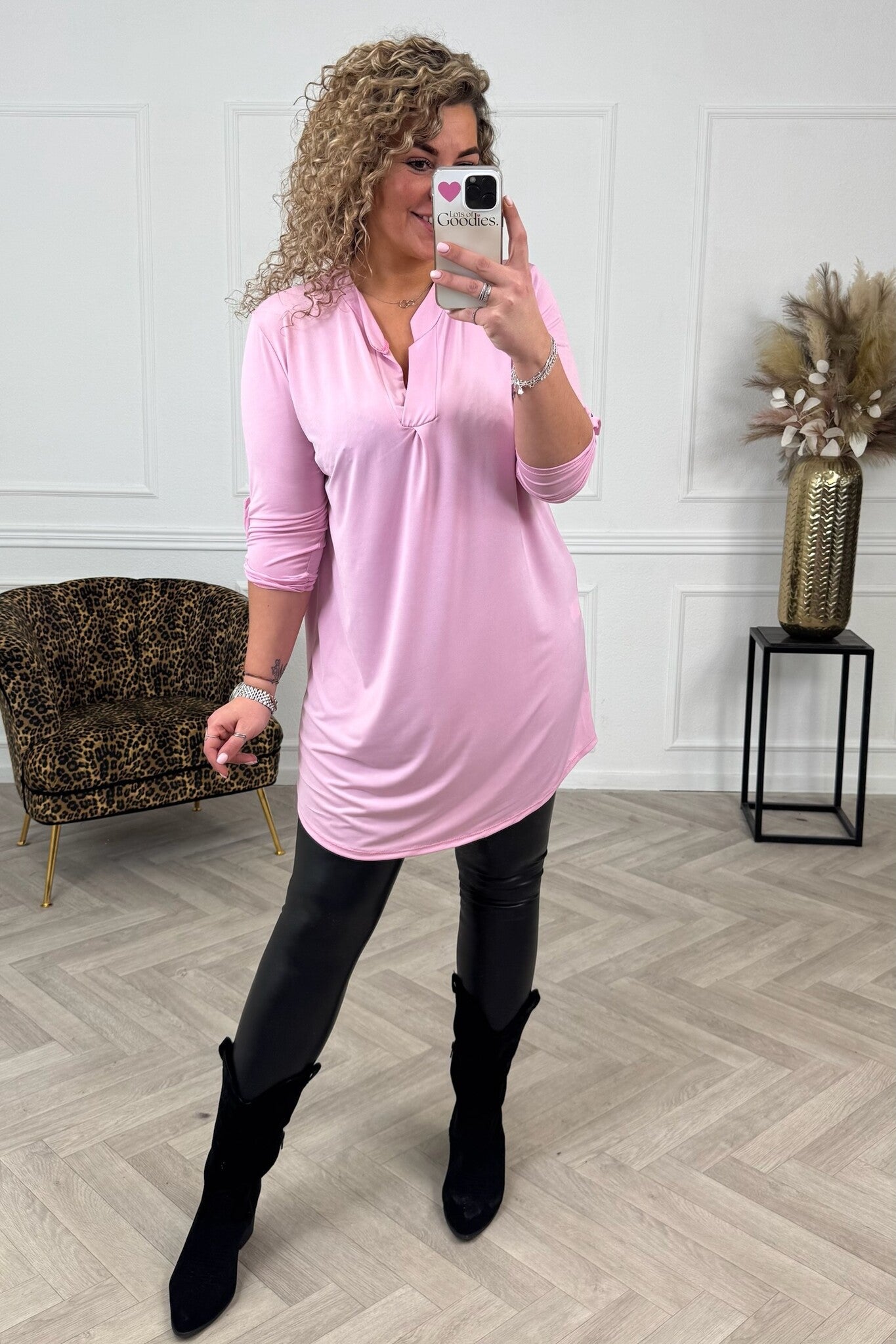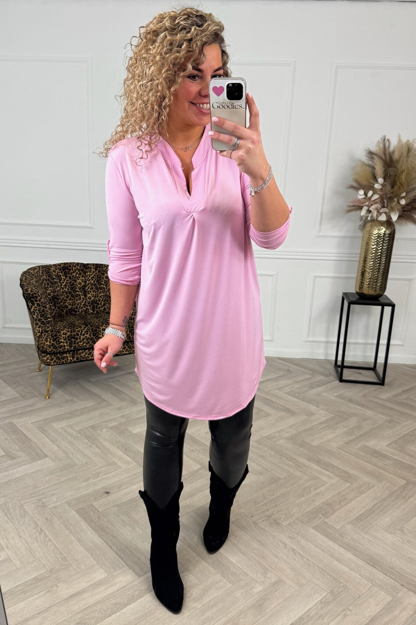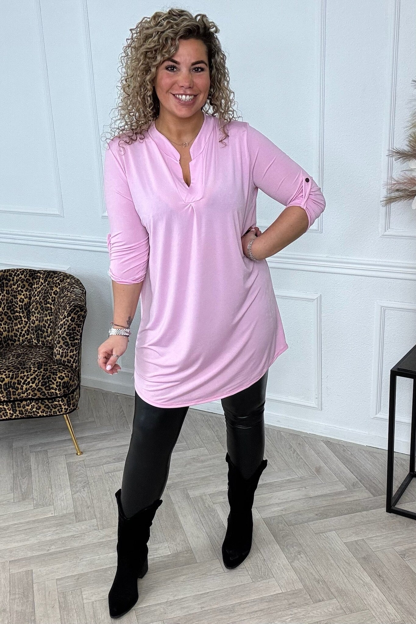 Deze heerlijke v neck tuniekjes hebben opgestroopte mouwtjes en zijn verkrijgbaar in verschillende printjes! Shop hem in light pink!