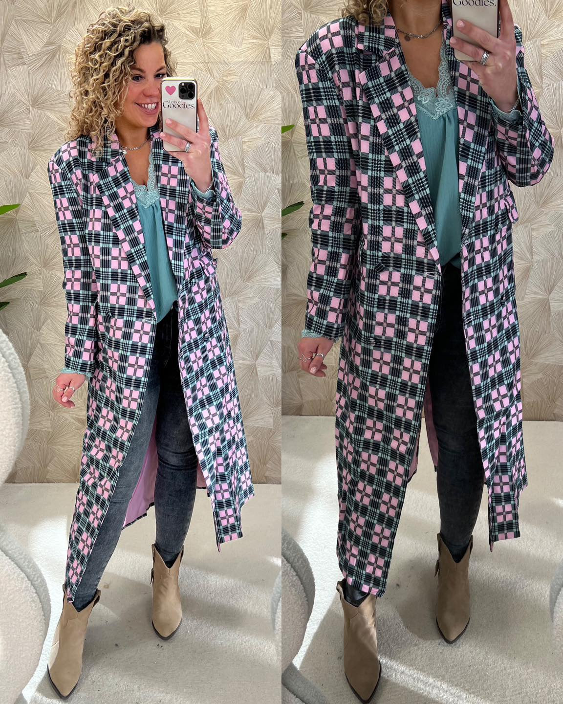 Long Checkered Coat - Pink/Green