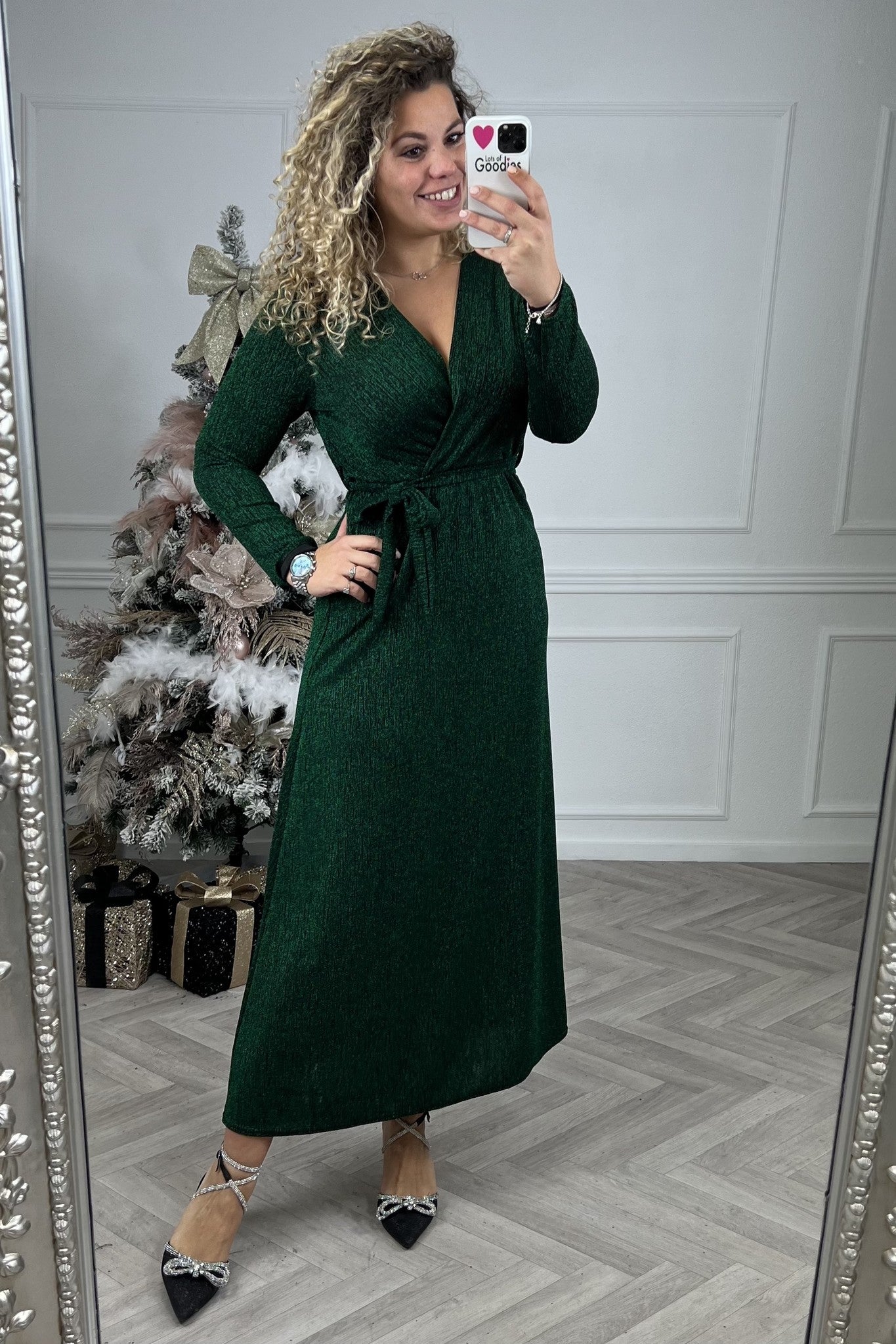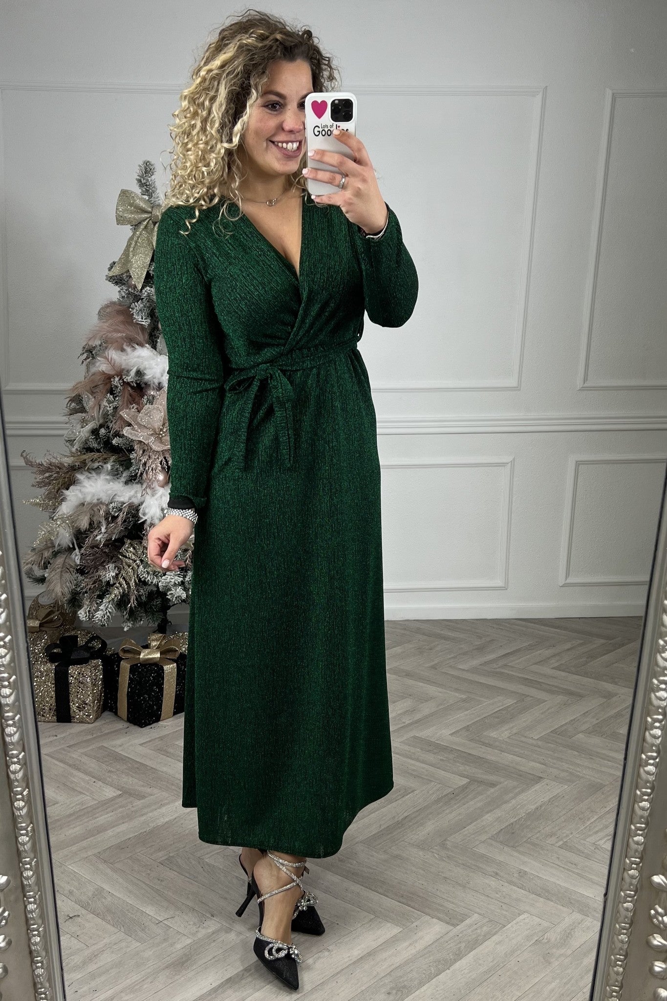 Deze mooie sparkle jurk heeft lange mouwen een elastieke band en een ceintuur. Prachtige maxi lengte.