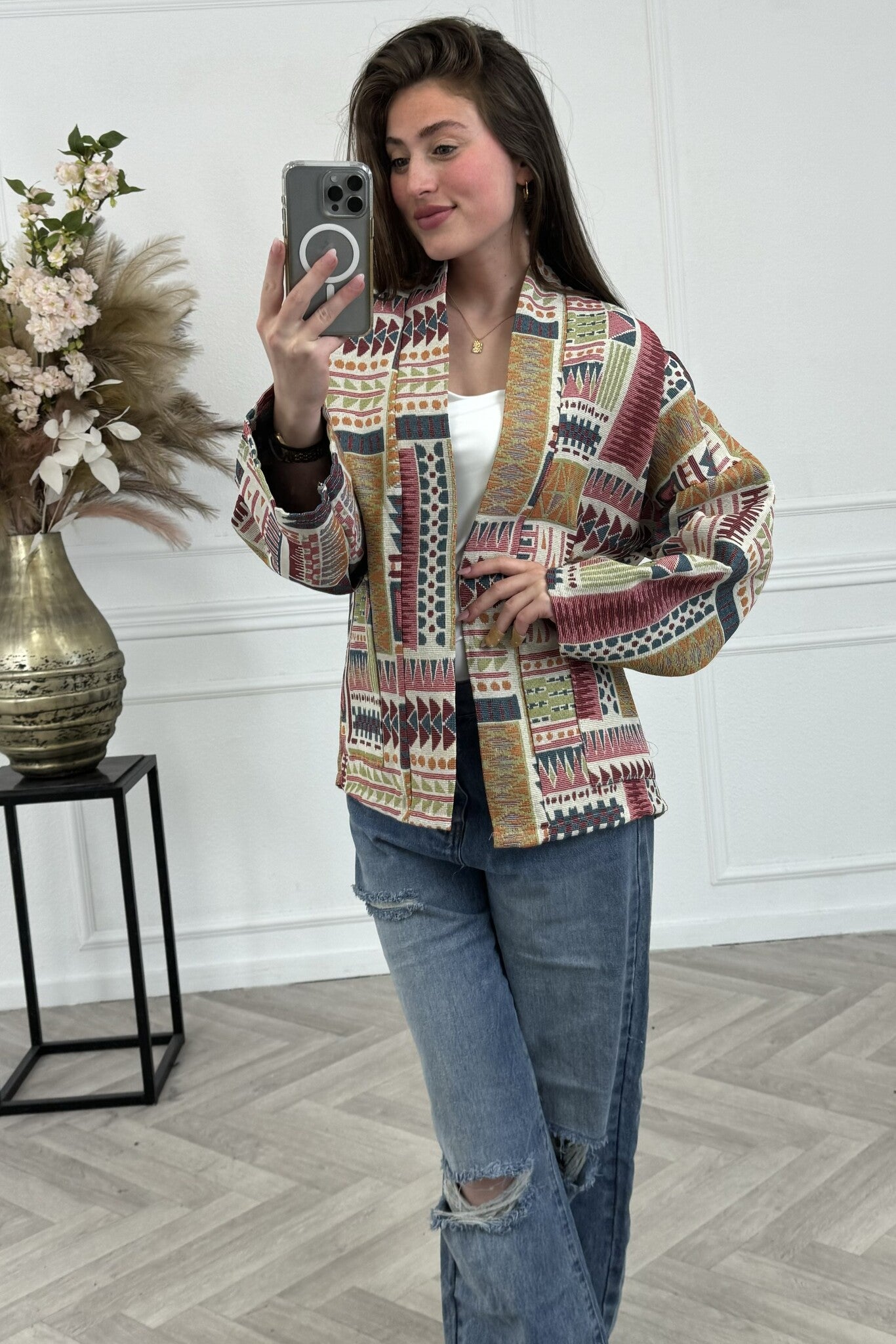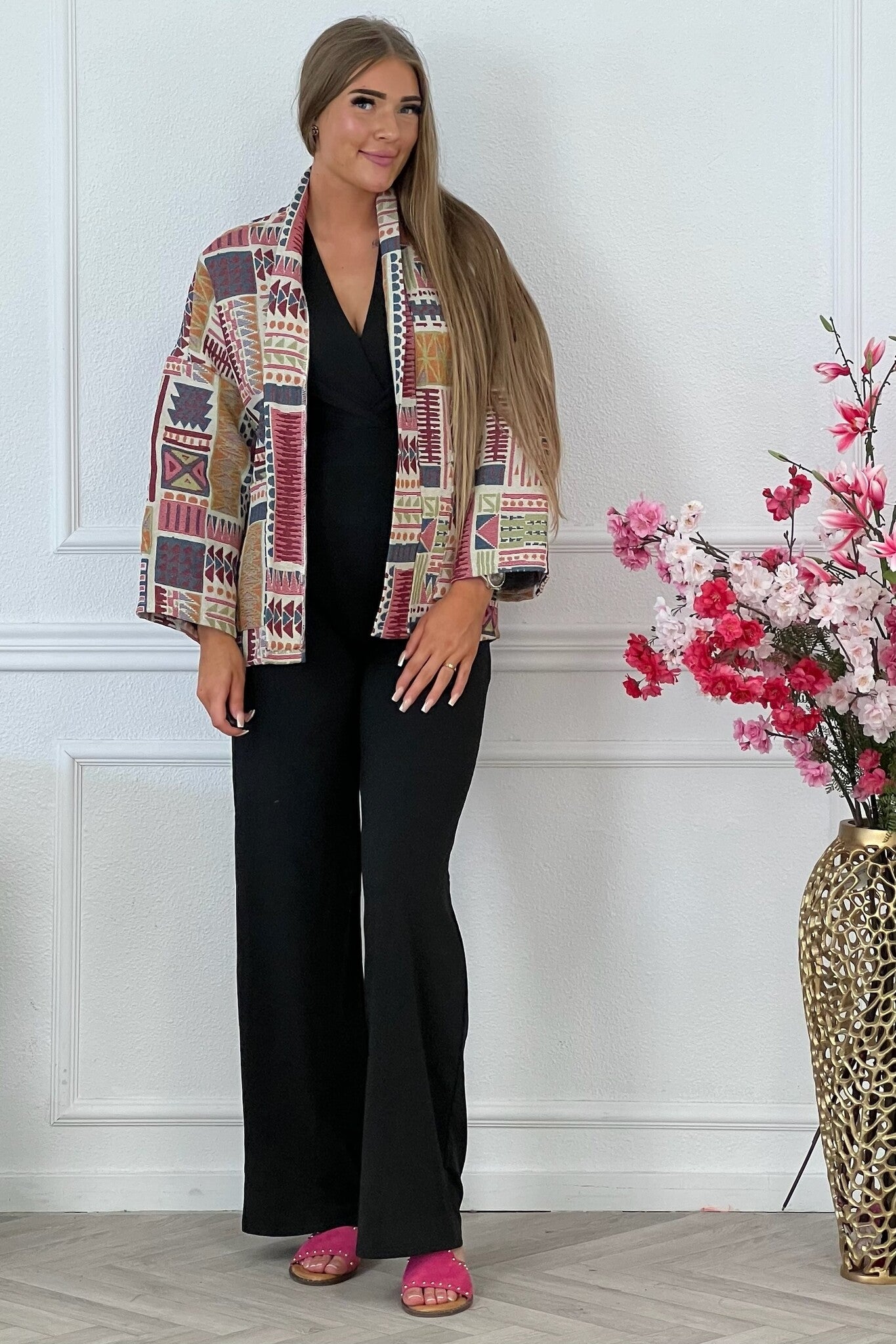 Dit leuke kimono jasje is perfect voor de aankomende zomer avonden. Het jasje is gevoerd, en heeft twee zakken. We love it!