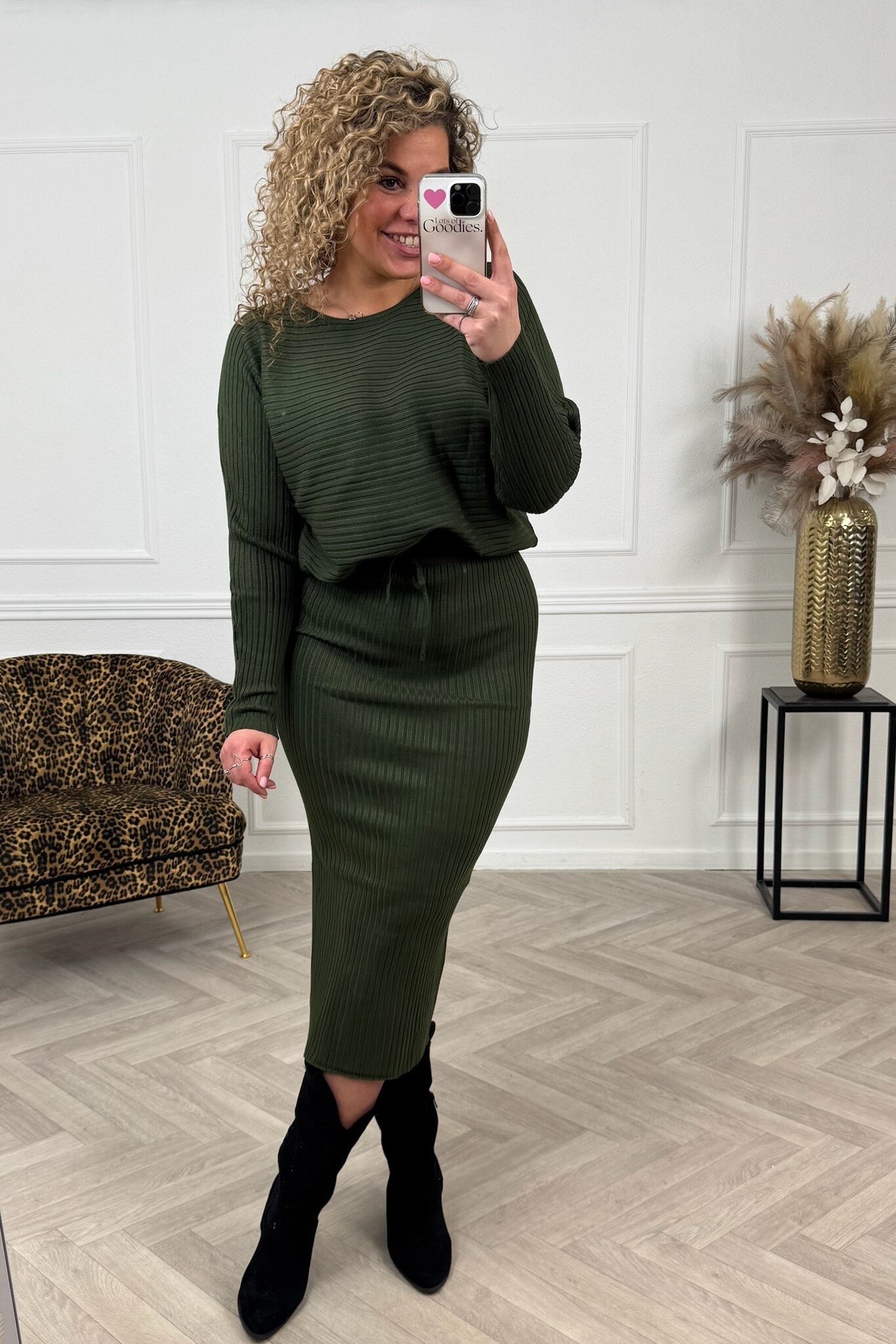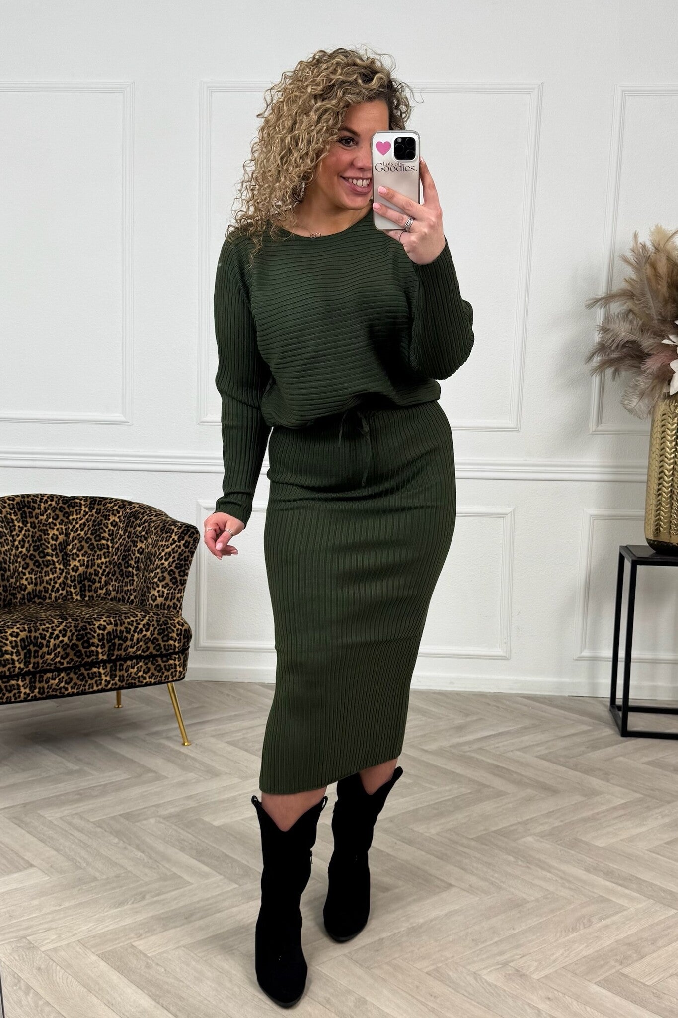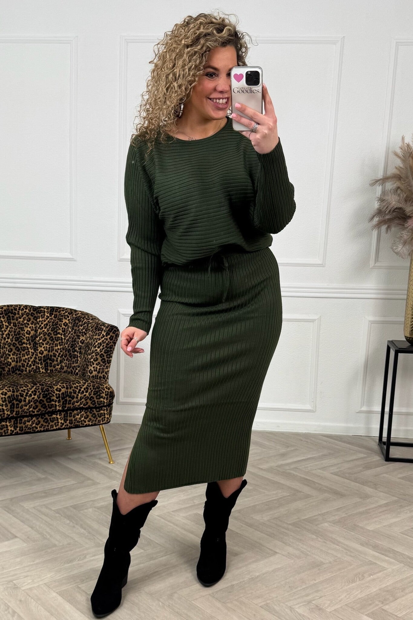 Deze heerlijke set bestaat uit een van rib stof sweater en een midi rok met split, beide heerlijk zacht en comfy! Shop hem in armygreen!