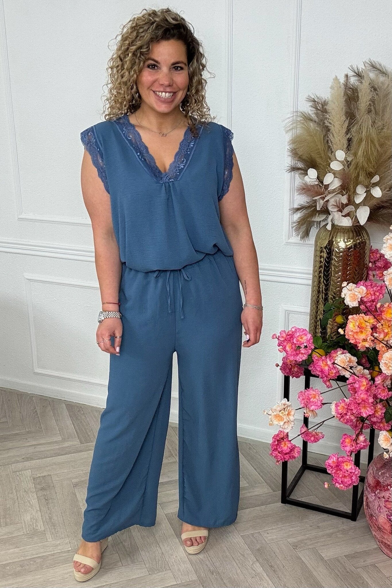 Deze geweldige set heeft een mooi kanten randje bij de hals. De broek is wijd uitlopend en heeft een koord in de taille band voor de sier. Shop hem in Denim!
