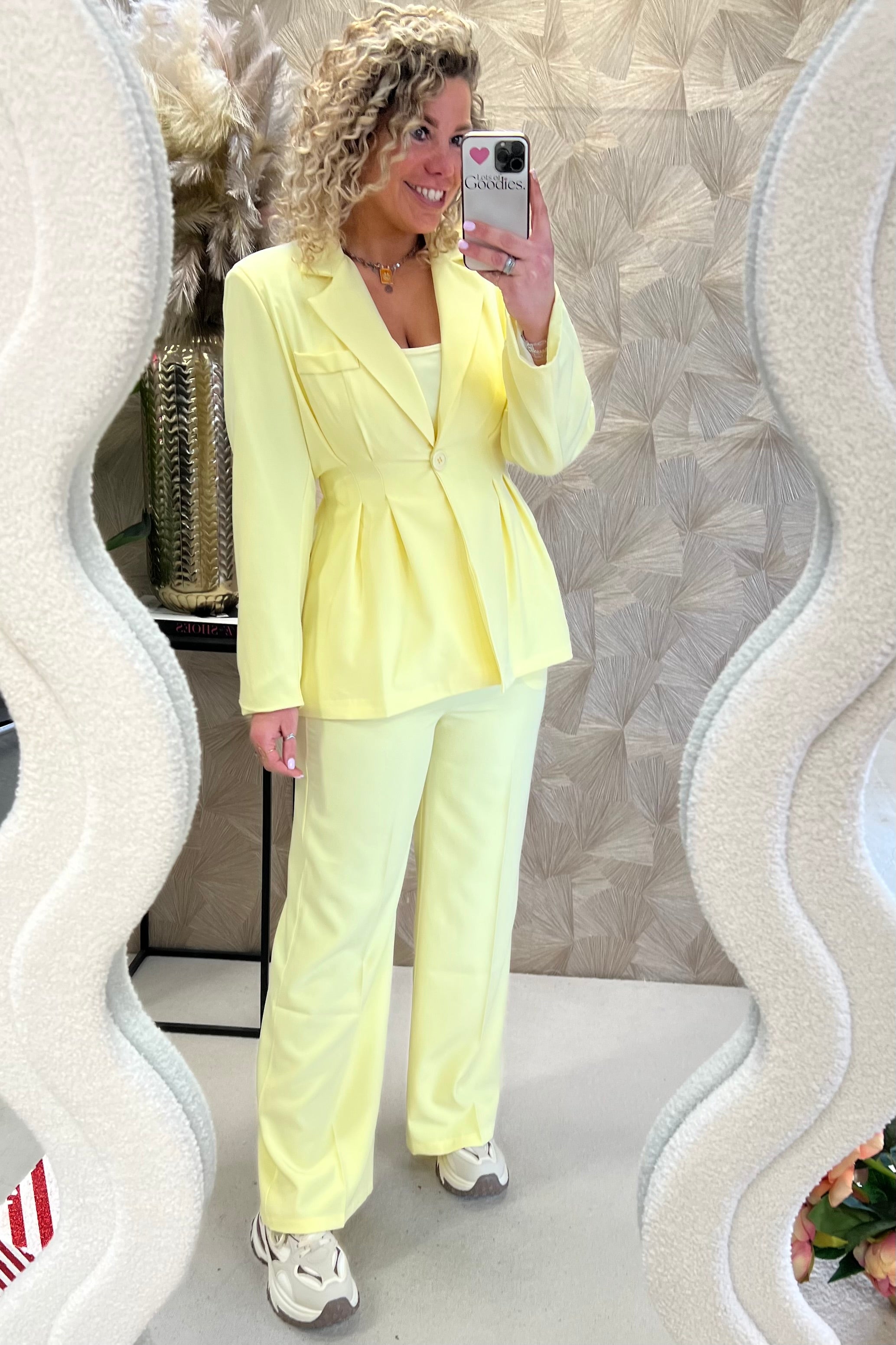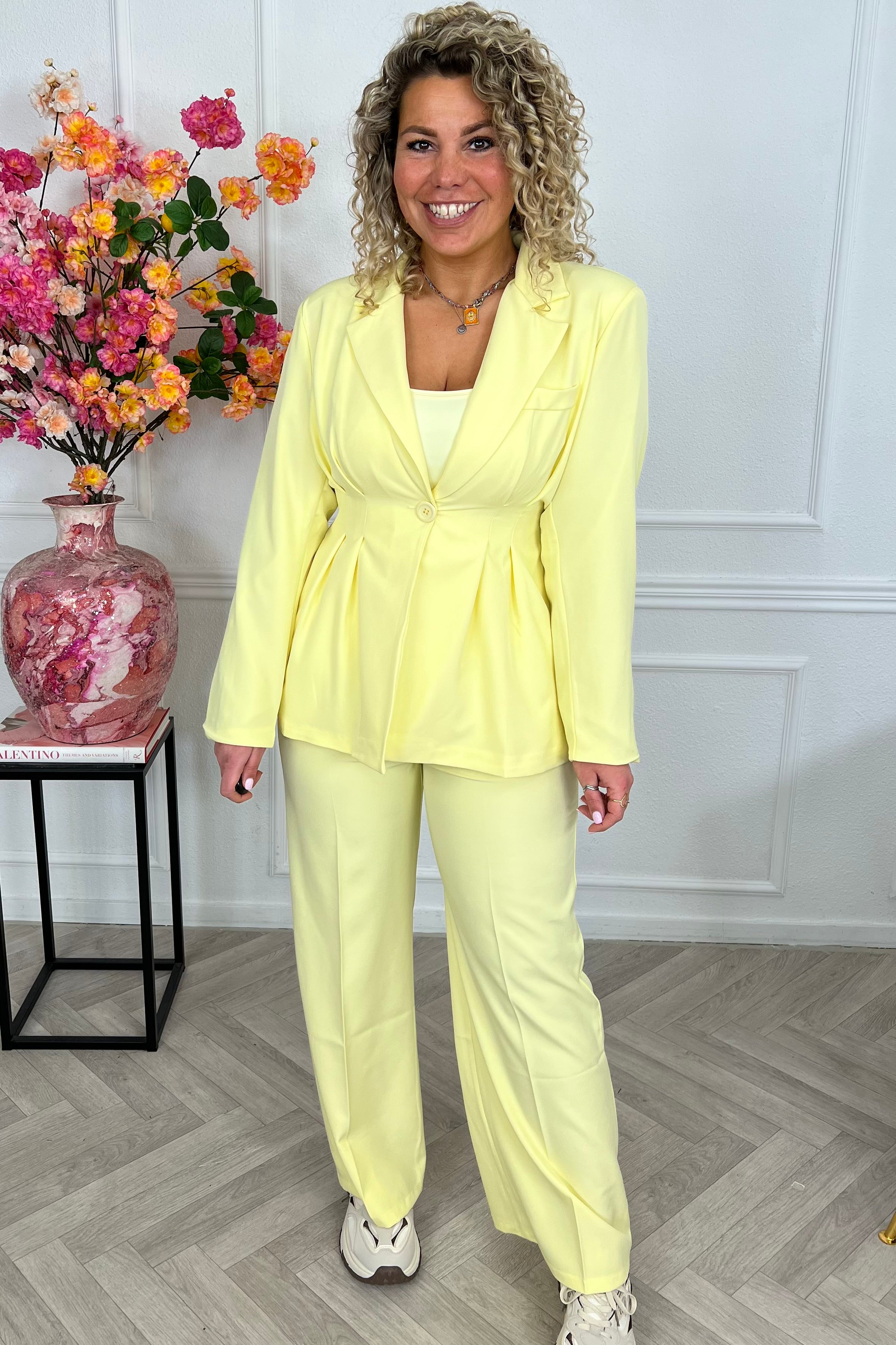 Dit suit bestaat uit een getailleerde blazer en pants, het ideale pak voor deze tijd van het jaar! Shop hem in yellow!