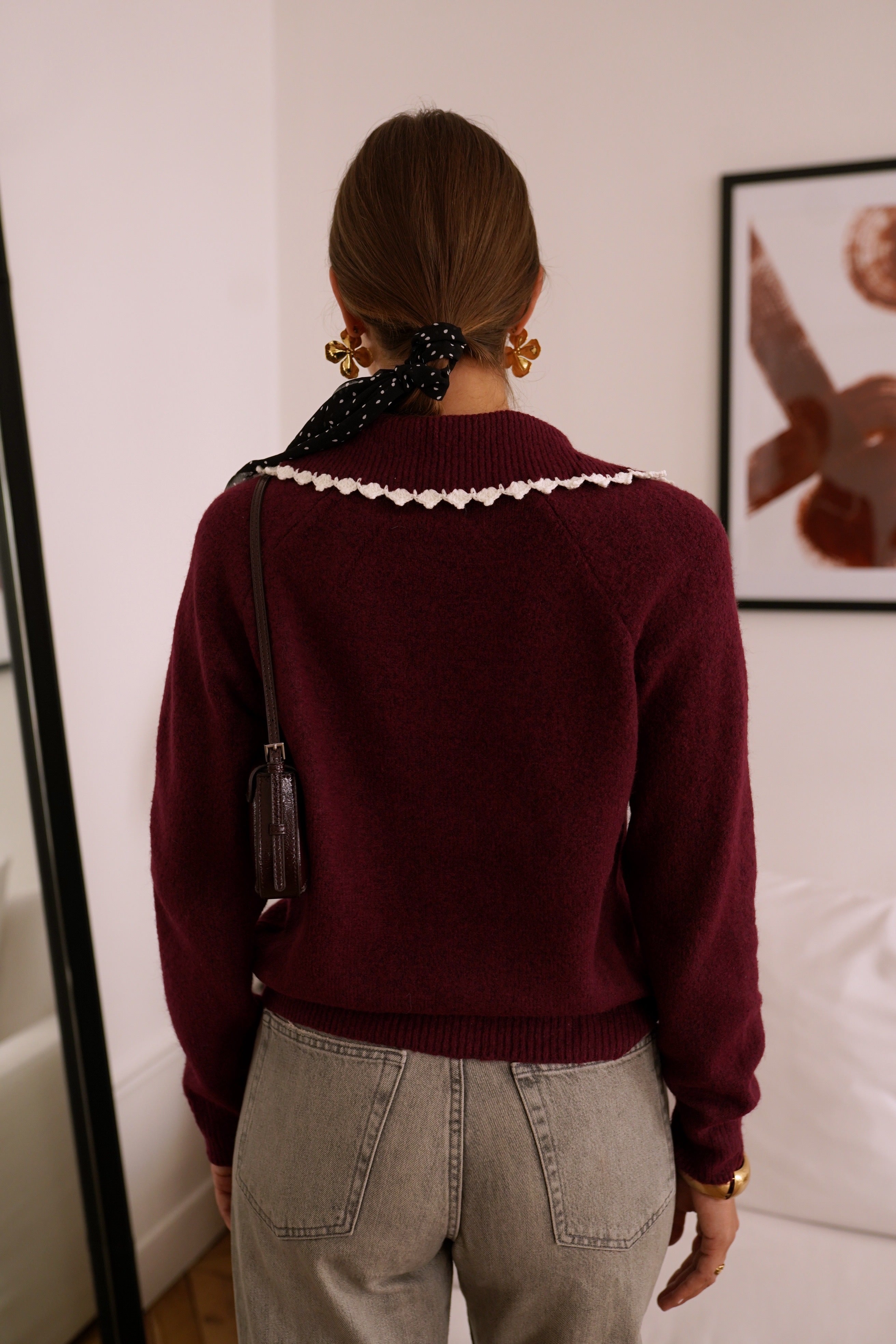 Een heerlijke sweater met mooie kraag, afgezet met leuke witte details. Draag hem met een leuke jeans of pantalon! Shop hem in trendy bordeaux!