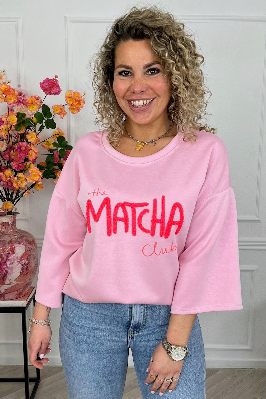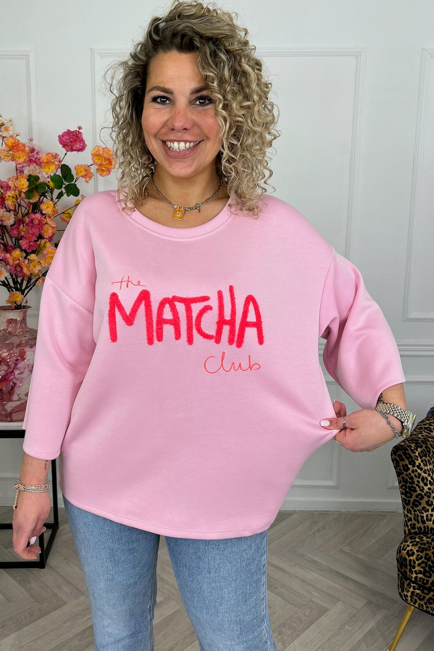 Deze heerlijke scuba sweater met "The MATCHA Club"-opdruk is helemaal on trend! Shop hem in pink/red!