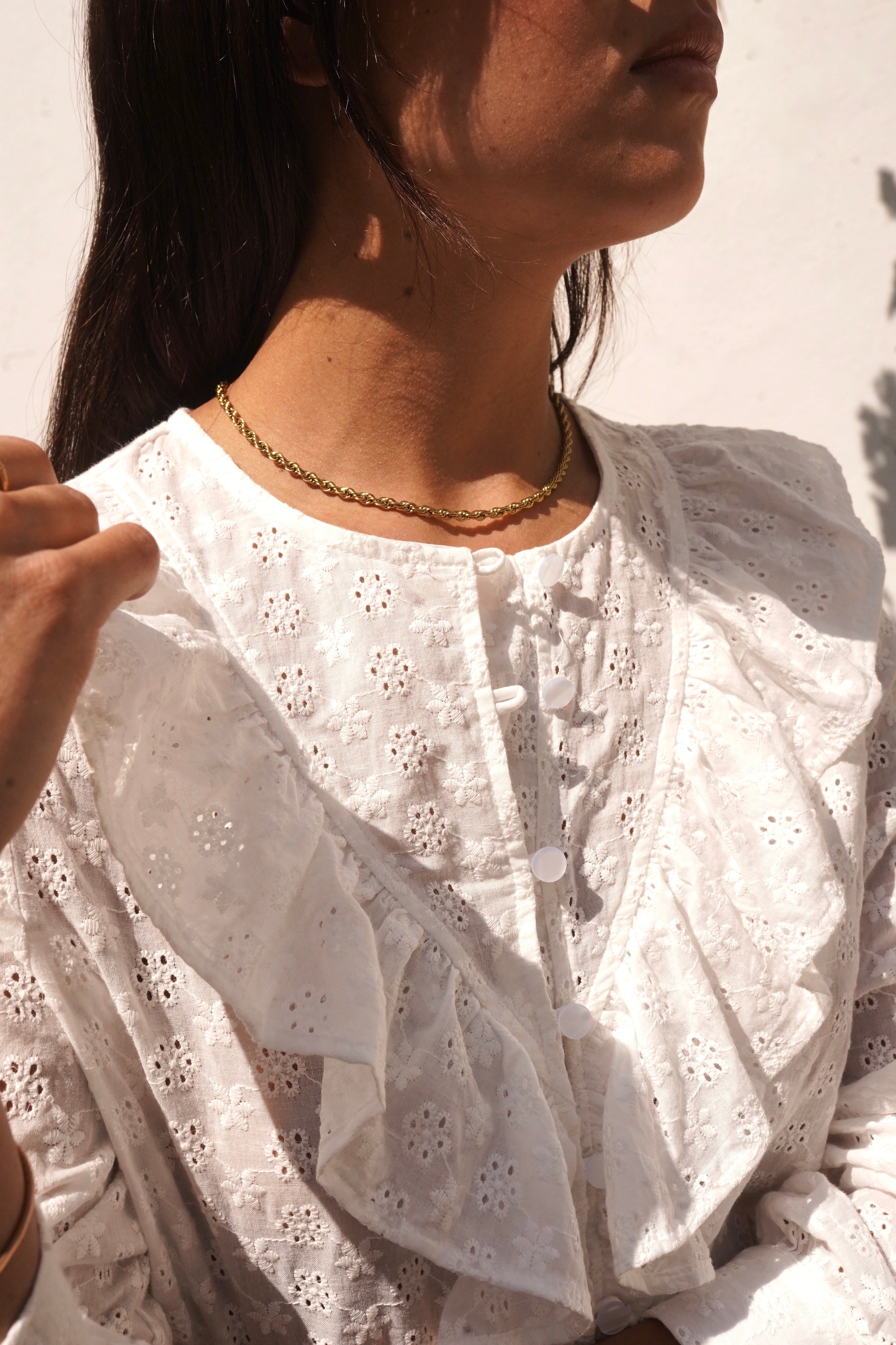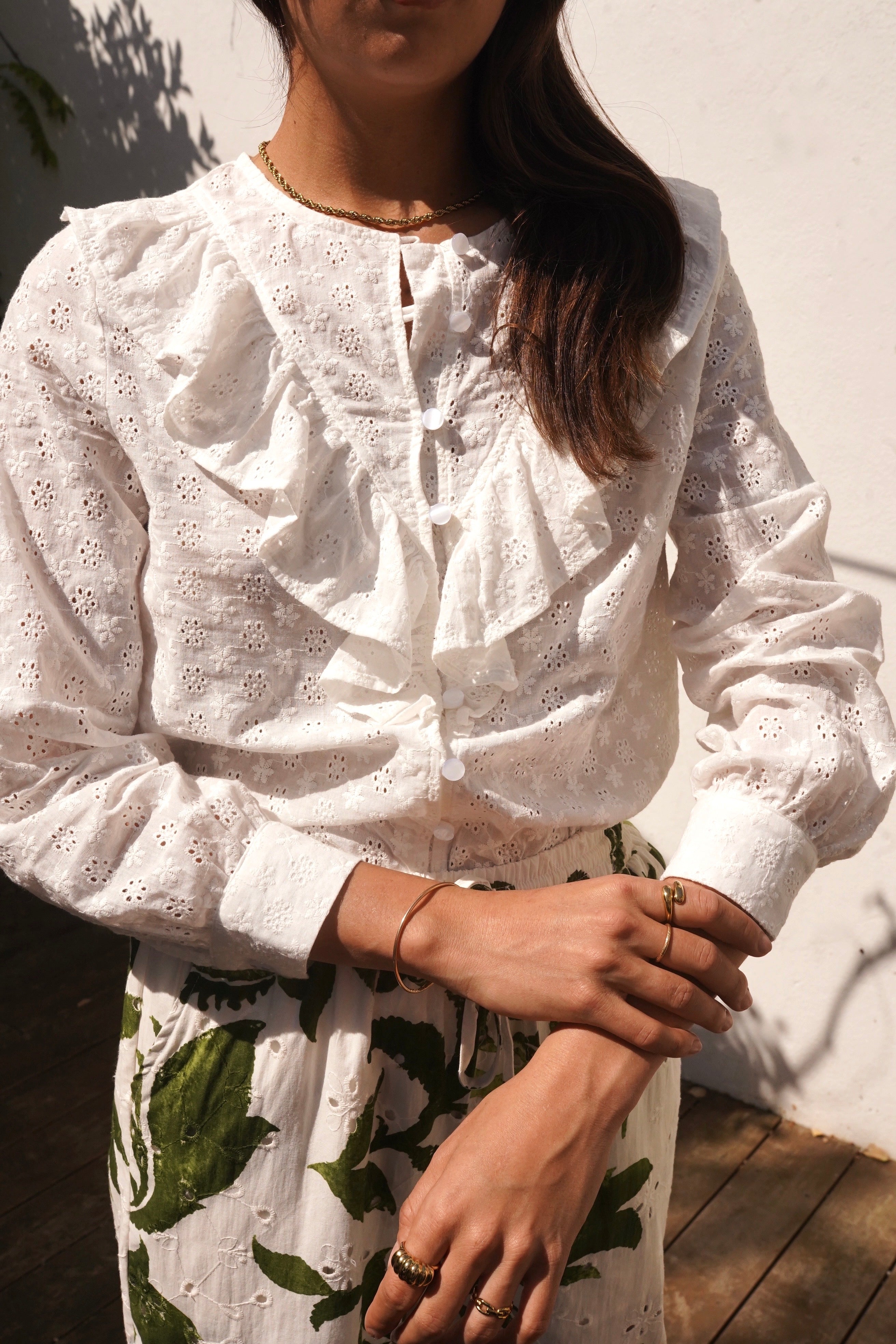 Deze mooie broderie blouse heeft ruffles en knoopjes, wij zijn gek op de details! Shop hem nu in white.