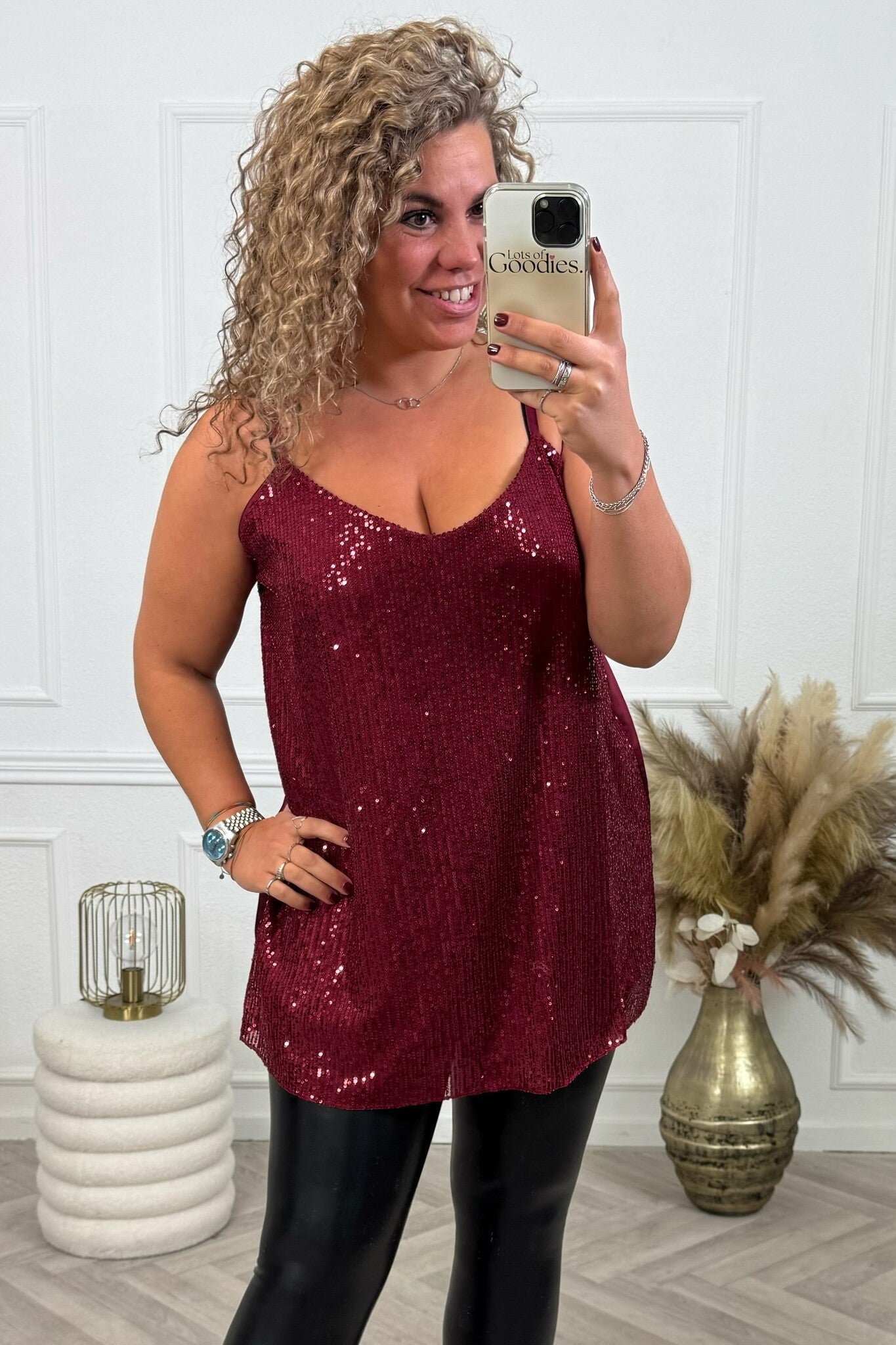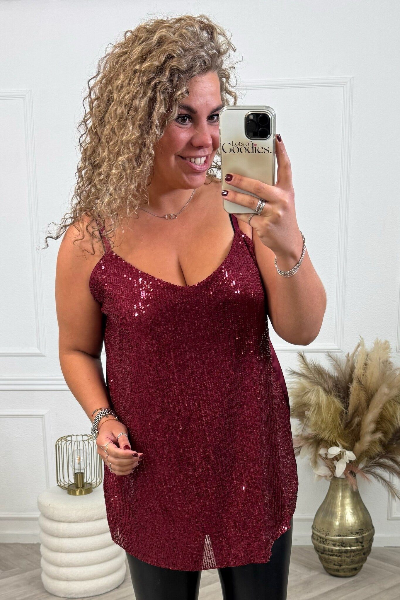 Shop dit superleuke glitter topje nu voor de feestdagen, verkrijgbaar in 7 kleuren! Shop hem nu in burgundy.